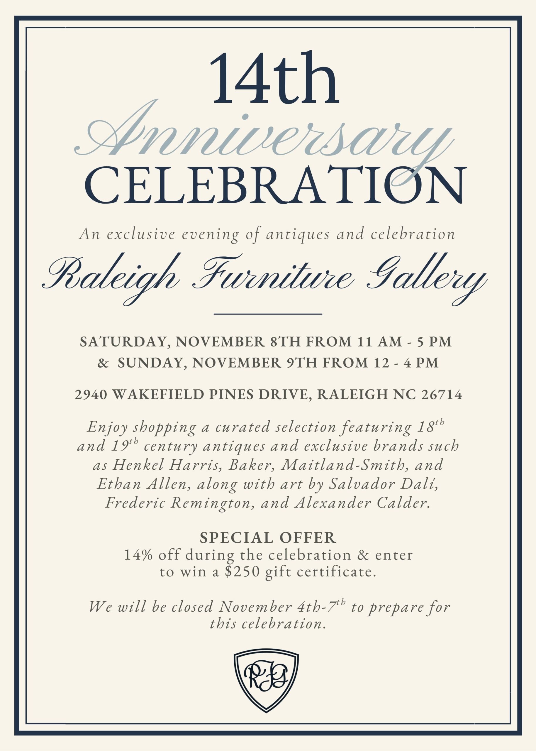 “Raleigh Furniture Gallery is hands down the best furniture consignment store in the Raleigh area. They are the leader in high-end furniture, art and fine finishings. They always provide excellent customer service and helpful recommendations. I highly recommend them!”