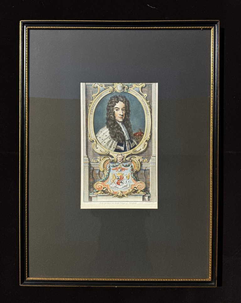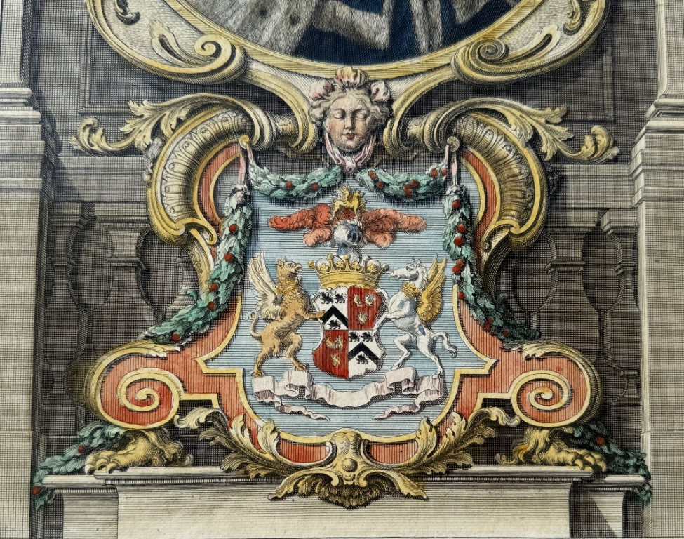 This 1741 hand-colored engraving by Jacobus Houbraken depicts Daniel Finch, 2nd Earl of Nottingham and 7th Earl of Winchilsea, a prominent English Tory politician and peer who supported the Hanoverian Succession in 1714. Known as Lord Nottingham until 1729 and later as Lord Winchilsea, he is shown in formal robes of state beneath an ornate cartouche and family coat of arms. The engraving reflects Houbraken’s meticulous craftsmanship and commemorates Finch’s enduring role in early 18th-century British politics.