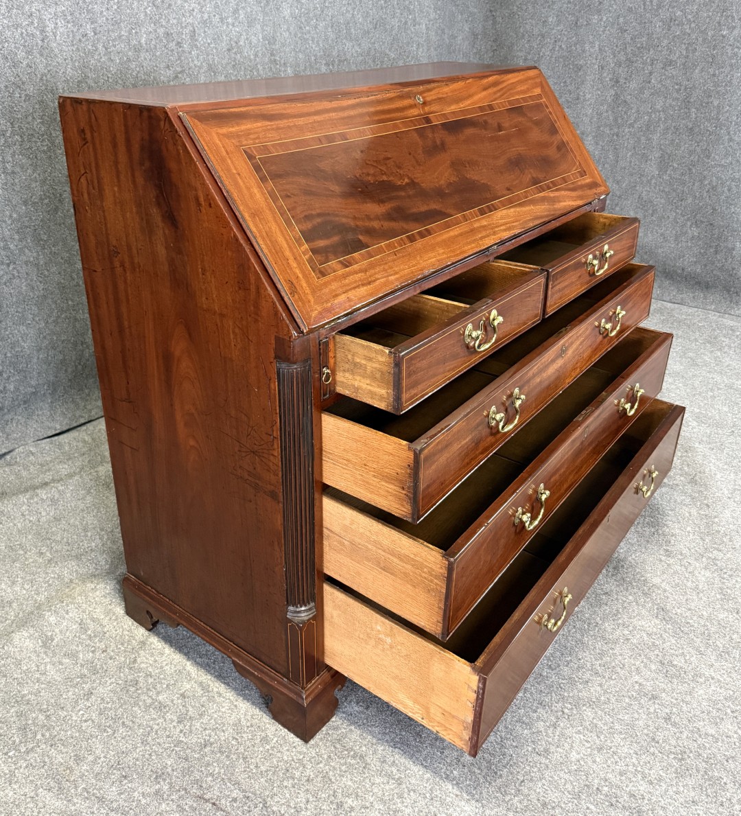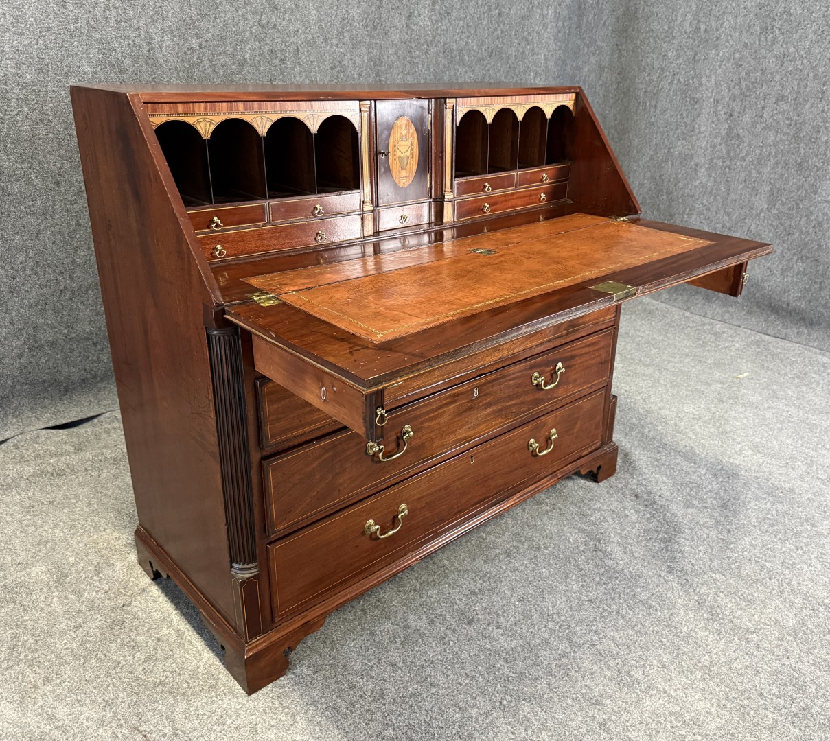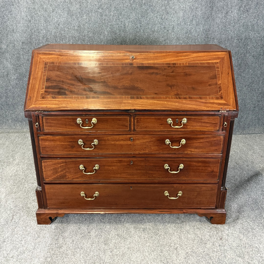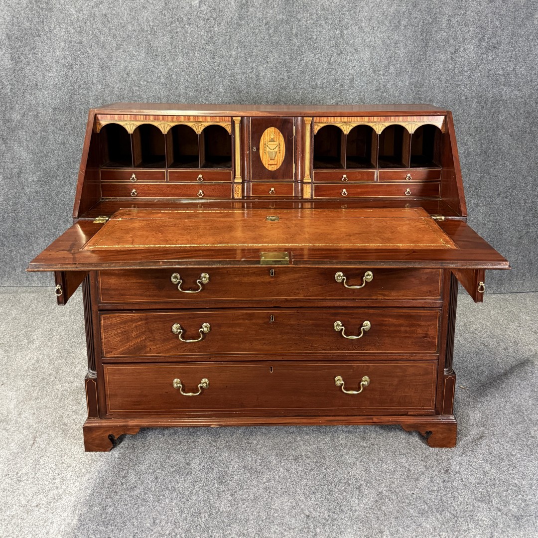 This 18th century inlaid mahogany slant front desk is finely detailed with satinwood and line inlays, including a central urn motif on the interior prospect door. The fall front opens to reveal a fitted interior with drawers, pigeonholes, and hidden compartments, offering both elegance and intrigue. Supported by four graduated drawers with brass pulls, this piece combines refined craftsmanship with practical storage.