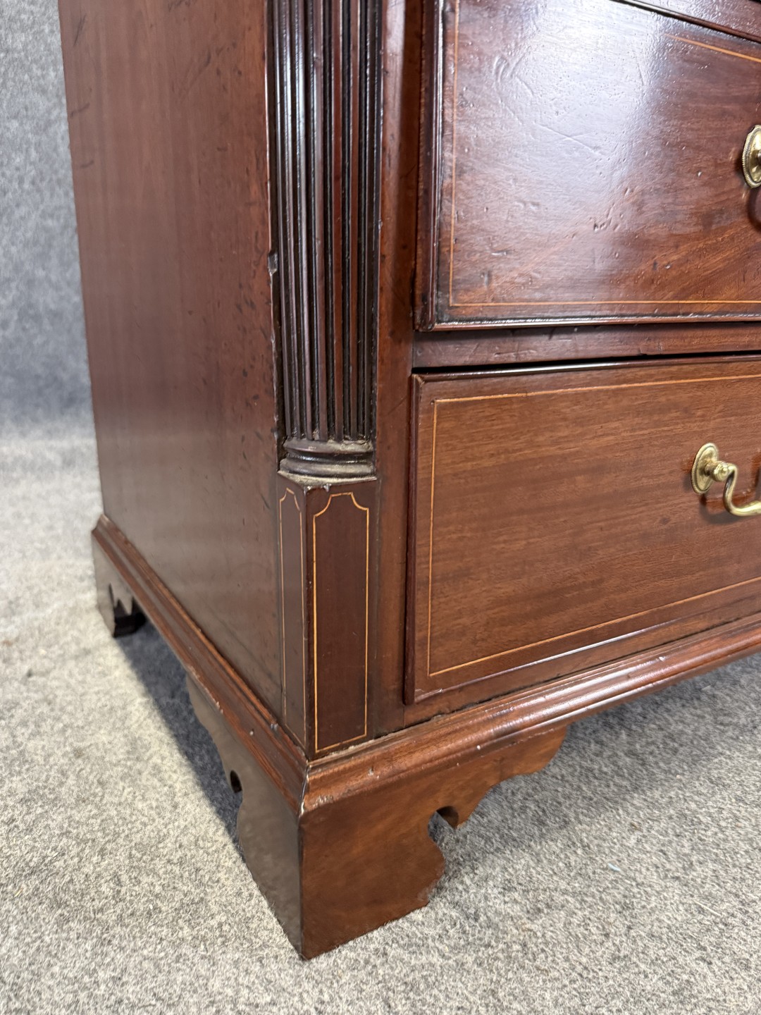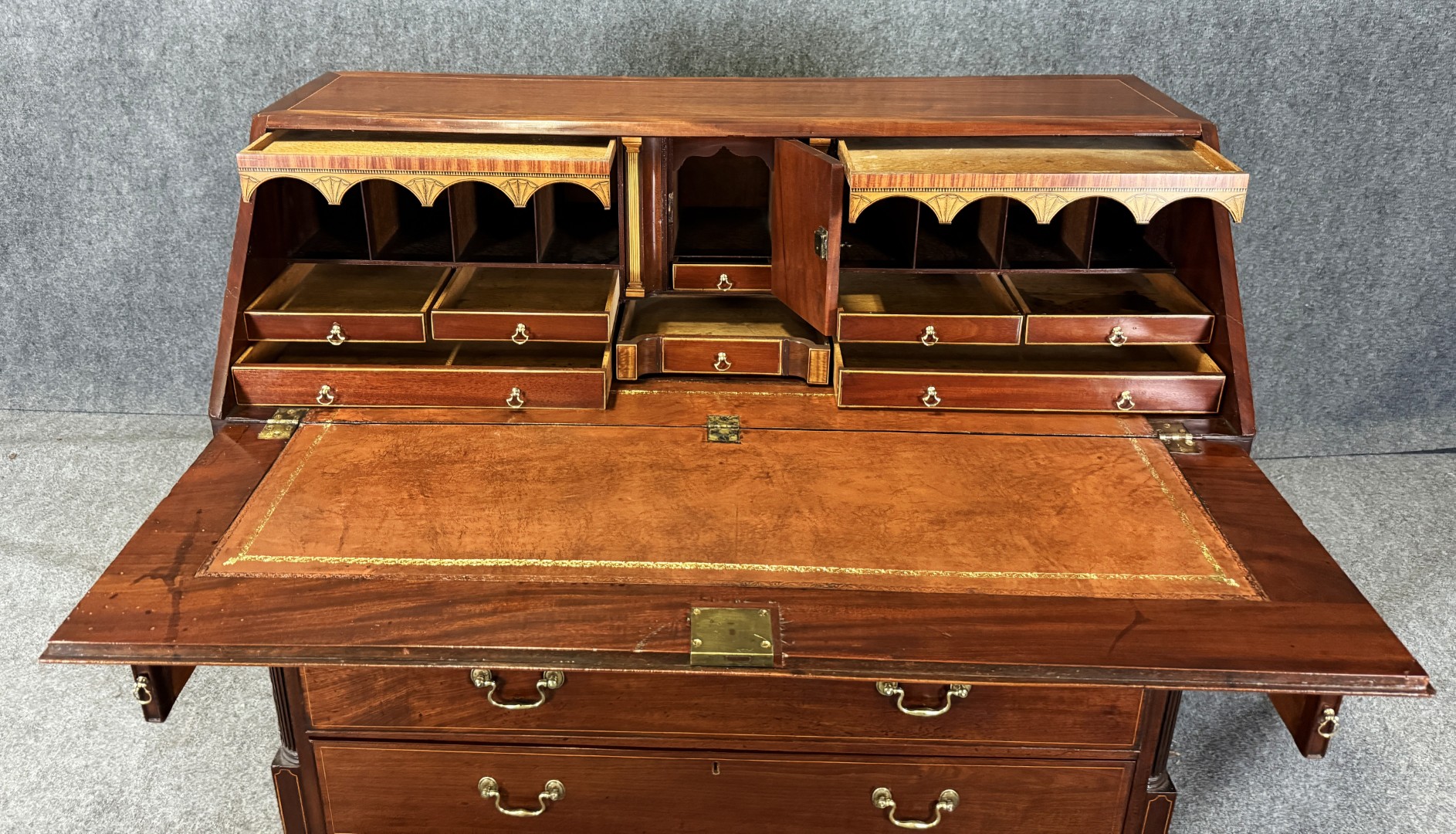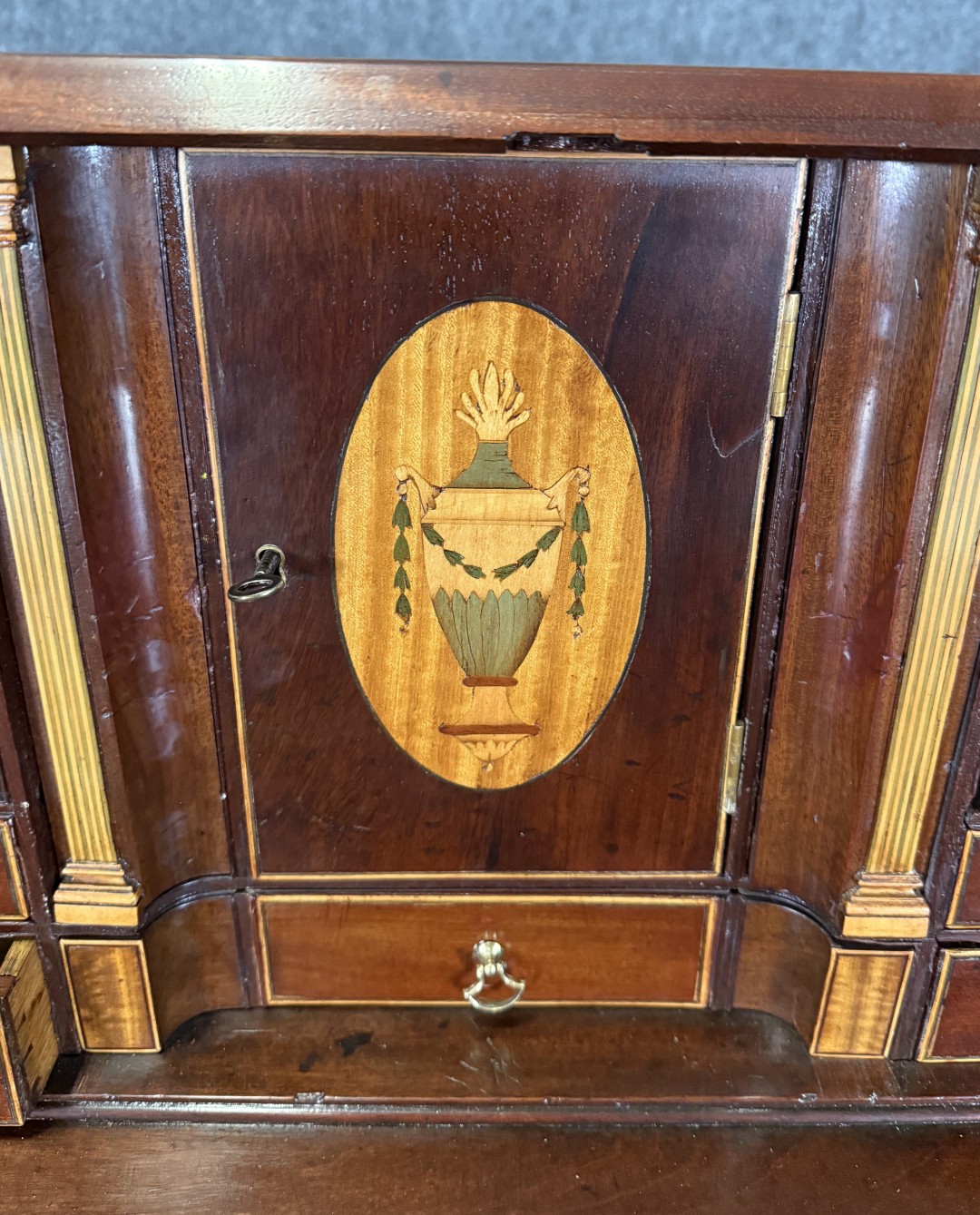 This 18th century inlaid mahogany slant front desk is finely detailed with satinwood and line inlays, including a central urn motif on the interior prospect door. The fall front opens to reveal a fitted interior with drawers, pigeonholes, and hidden compartments, offering both elegance and intrigue. Supported by four graduated drawers with brass pulls, this piece combines refined craftsmanship with practical storage.