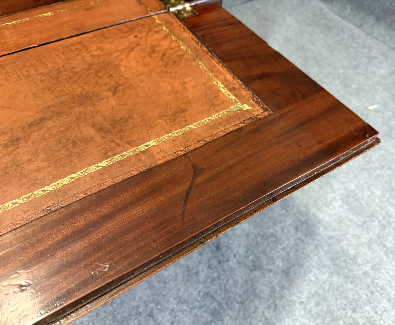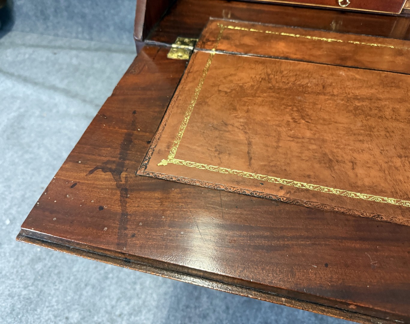 Your happiness with this item is of the utmost importance to us so please review the photographs carefully for condition. We endeavor to try and list any issues we may observe; we may not necessarily note all minor nicks and dings or we may simply miss something. Please inspect carefully to ensure your full happiness with this item. For this piece, we observed wear consistent with age and use, adding to its antique character. This includes a replaced piece of veneer on slant top around key and some dark marks.