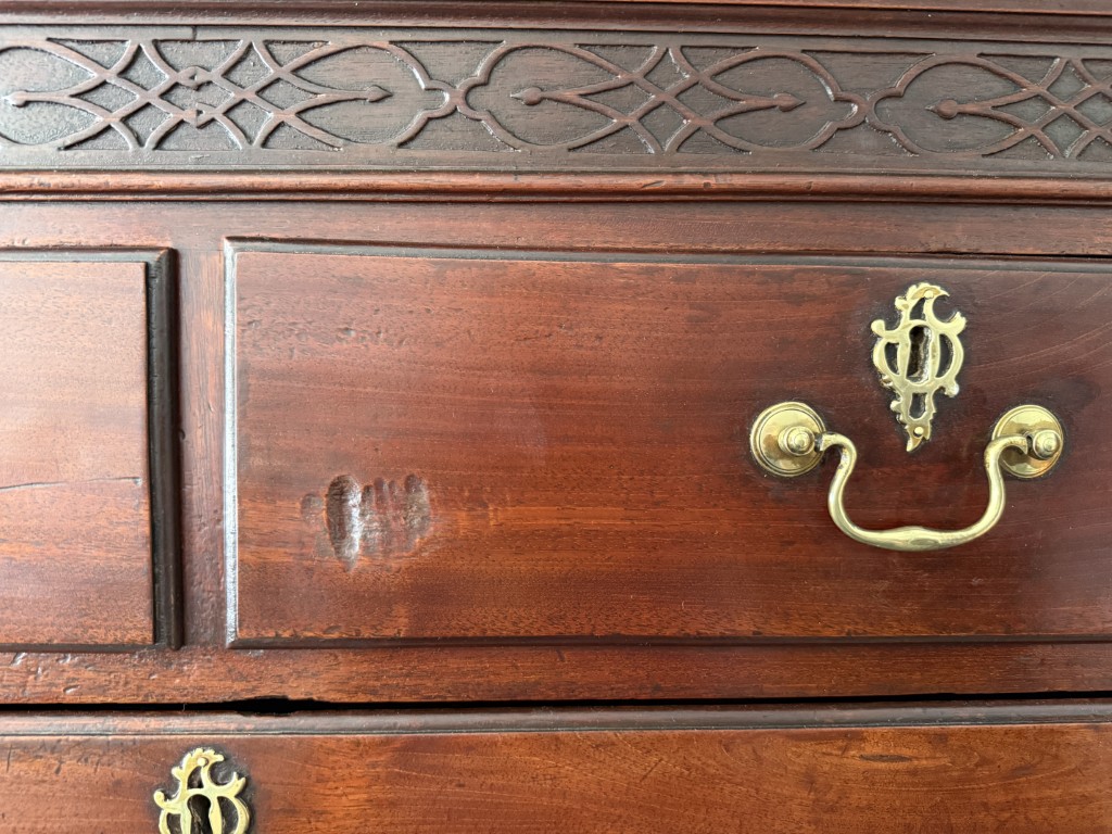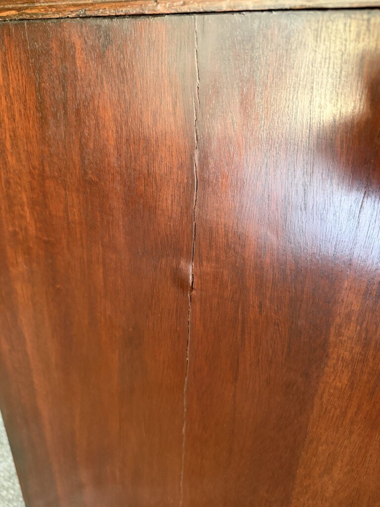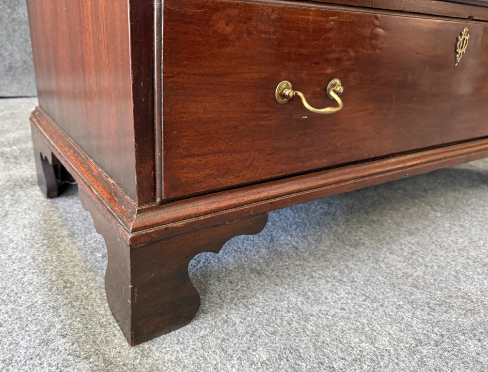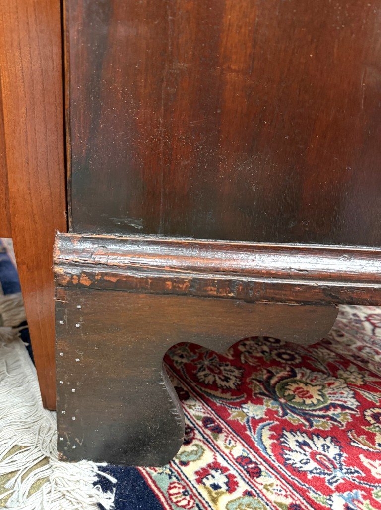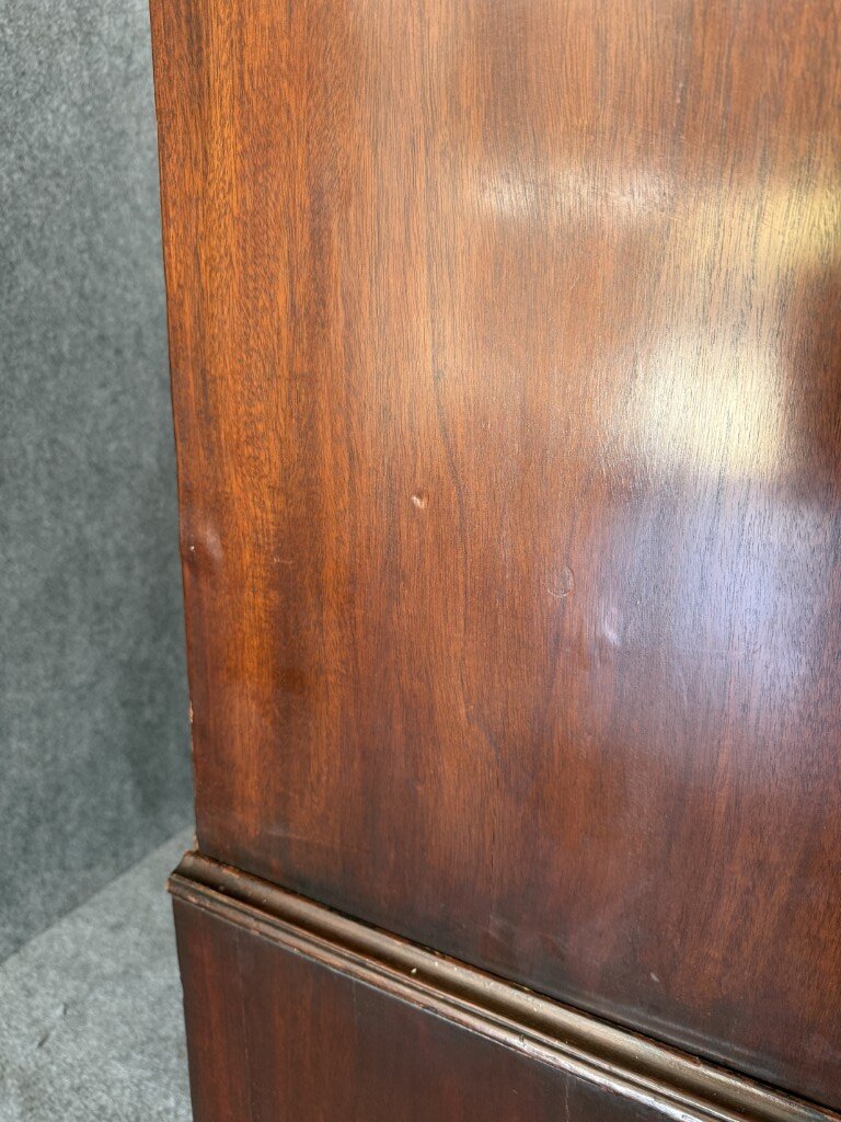 Your happiness with this item is of the utmost importance to us so please review the photographs carefully for condition. We endeavor to try and list any issues we may observe; we may not necessarily note all minor nicks and dings or we may simply miss something. Please inspect carefully to ensure your full happiness with this item. For this particular piece we found wear consistent with age and prior use, including large dents on several drawers, cracks on both front bracket feet, stress cracks on both sides of the base, a few bubbles in veneer on sides, and the back left foot was repaired with parallel rows of finishing nails.