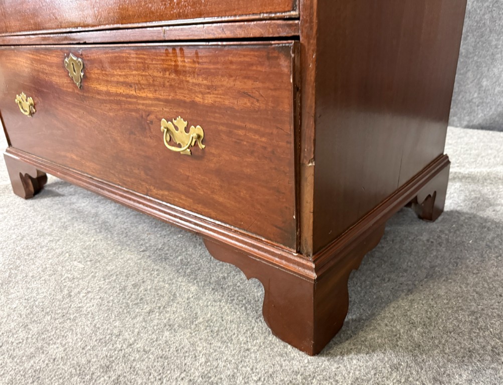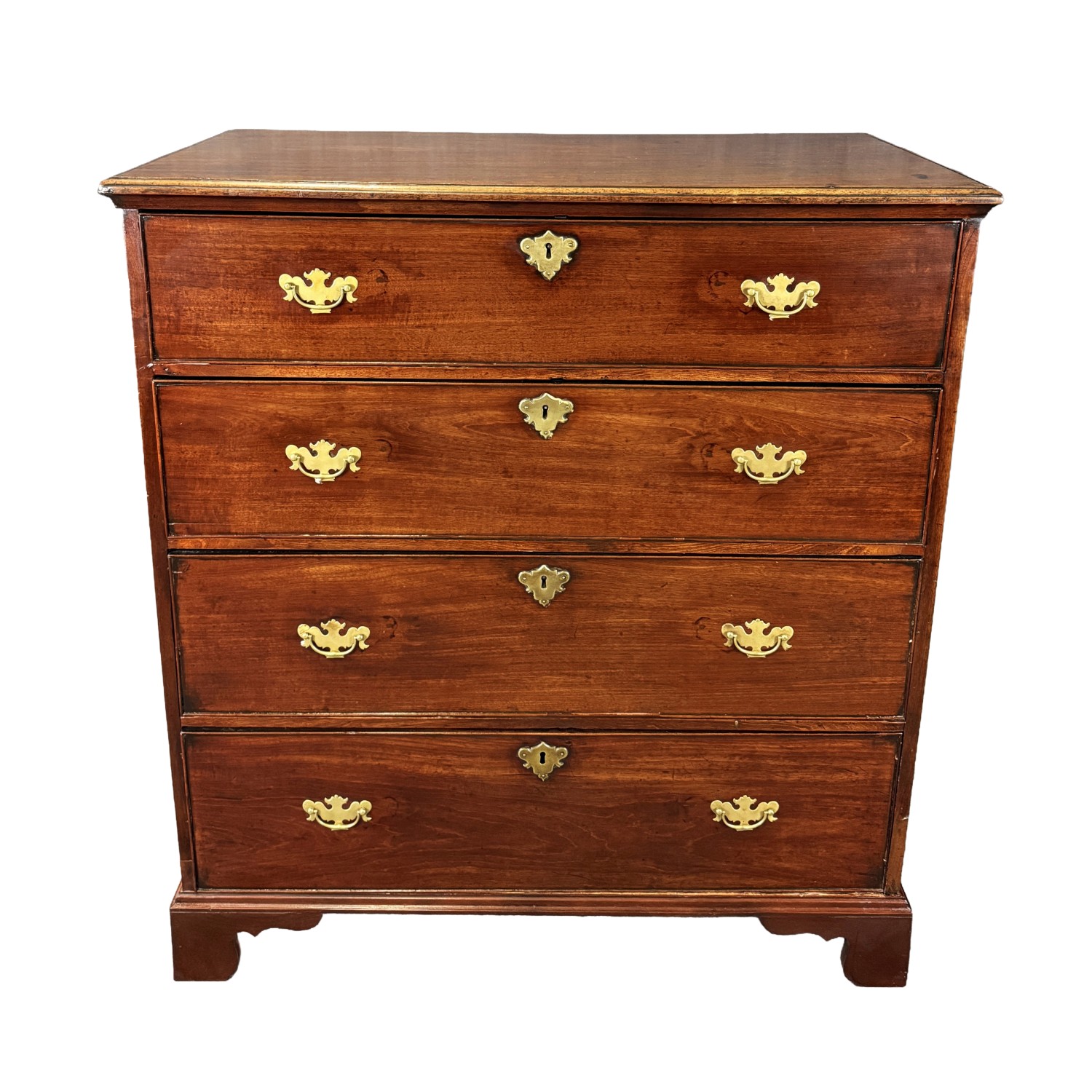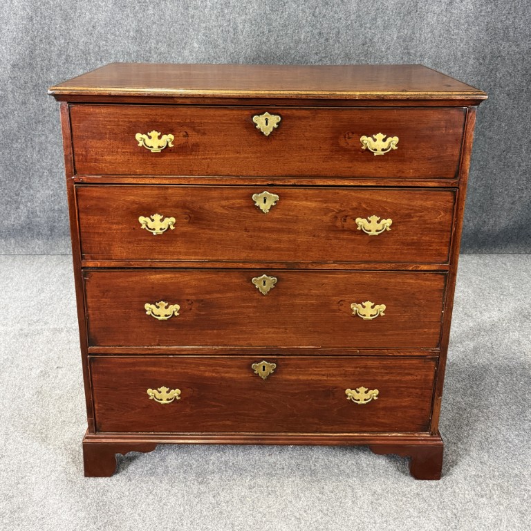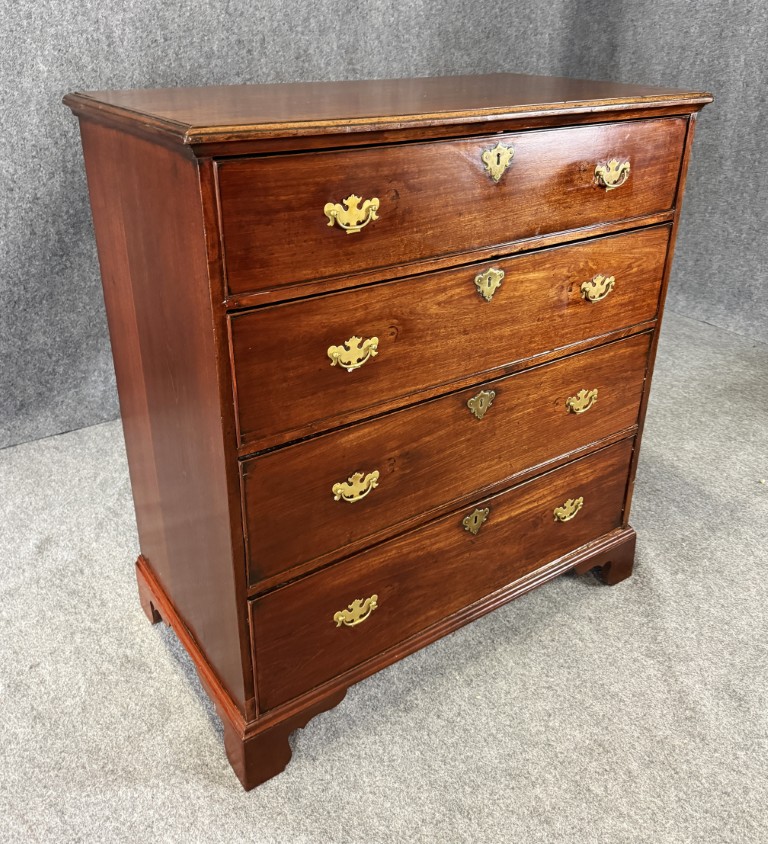 This 18th century chest is crafted from solid mahogany and features four spacious drawers fitted with classic brass pulls and escutcheons. The warm patina, simple bracket feet, and clean lines reflect the understated elegance and craftsmanship typical of fine early American furniture.
