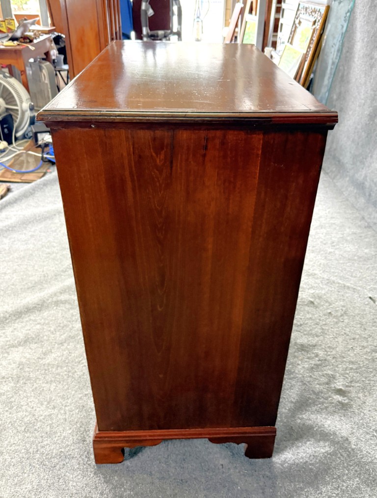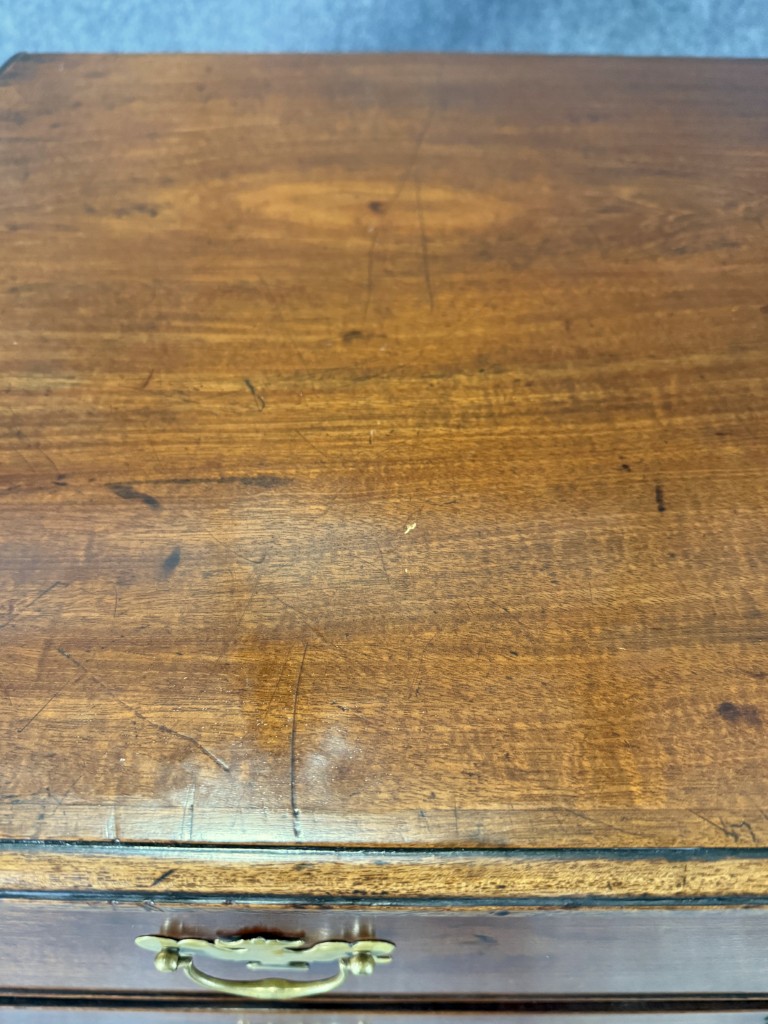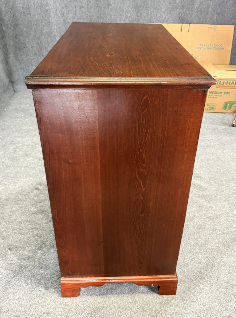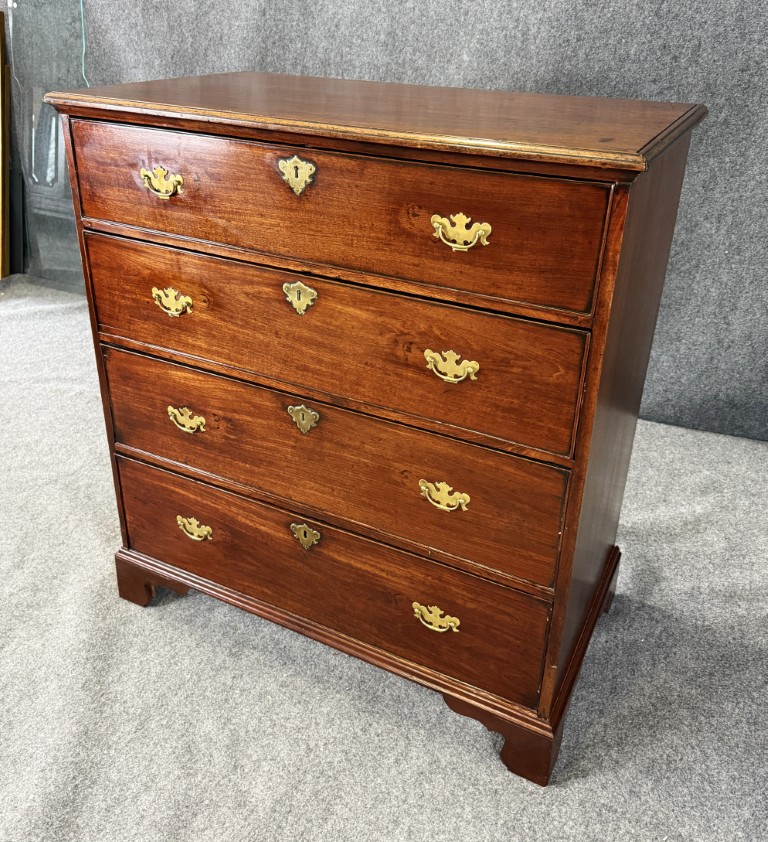 This 18th century chest is crafted from solid mahogany and features four spacious drawers fitted with classic brass pulls and escutcheons. The warm patina, simple bracket feet, and clean lines reflect the understated elegance and craftsmanship typical of fine early American furniture.