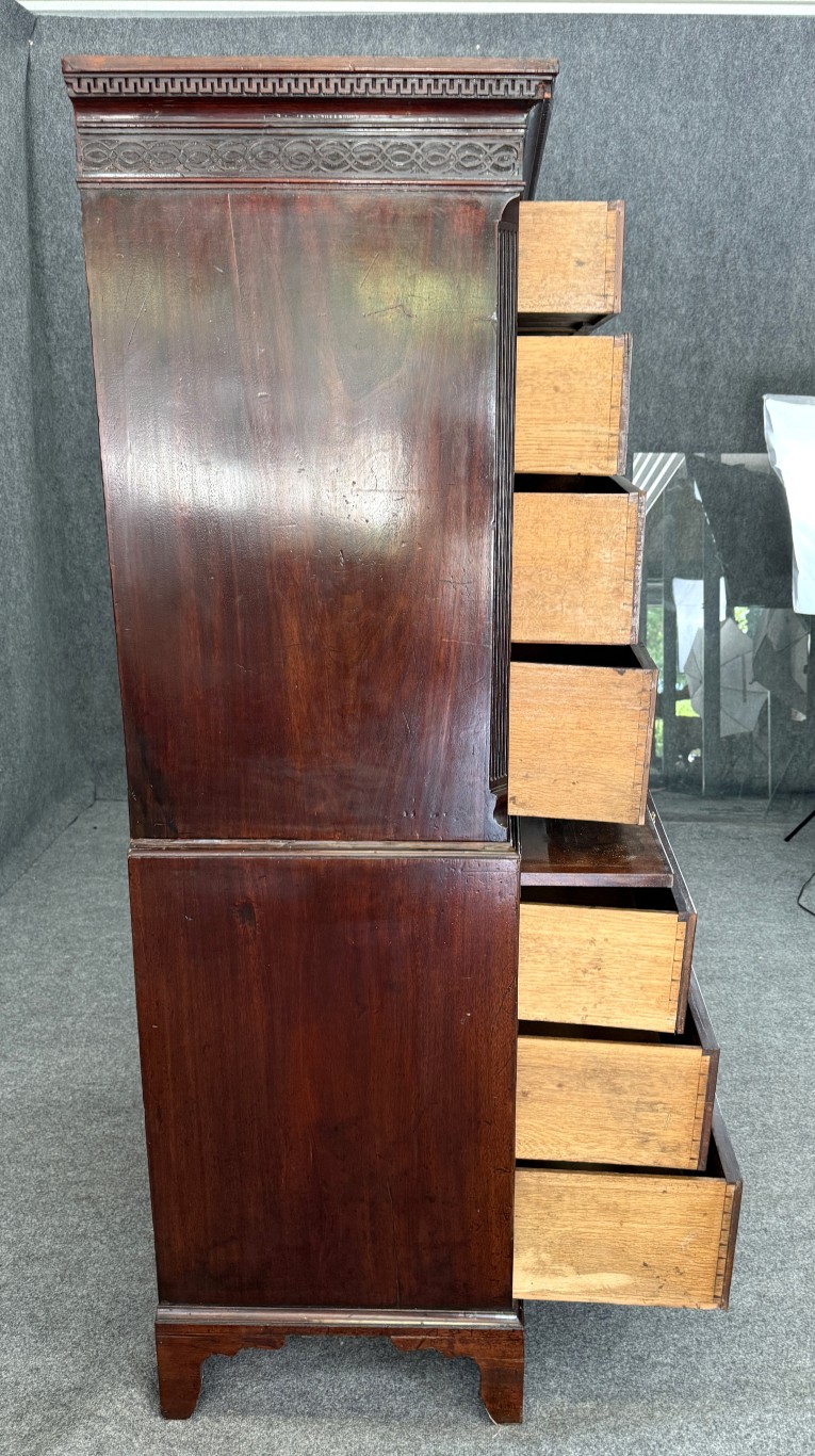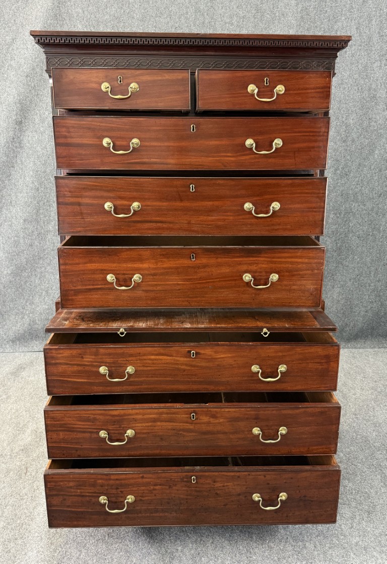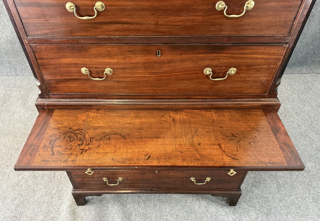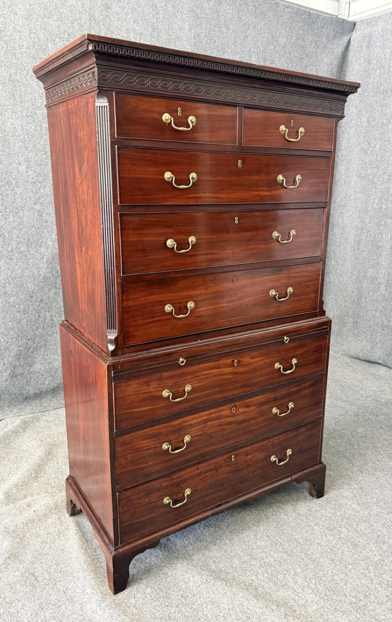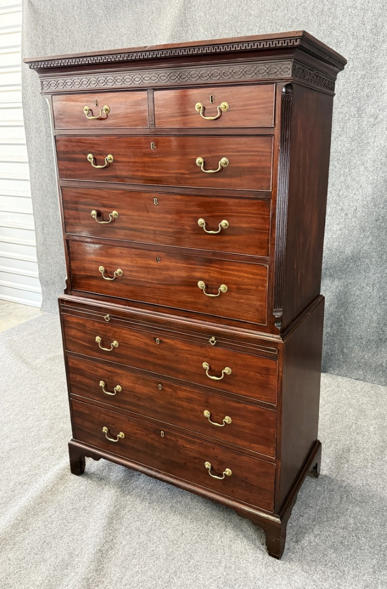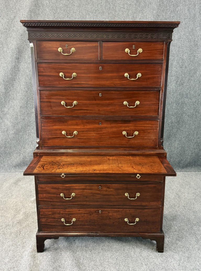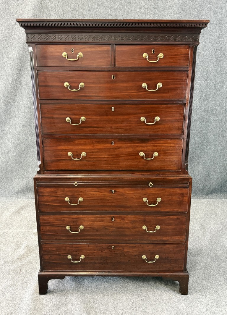 This 18th Century solid mahogany chest on chest is distinguished by its pull-out dressing table cleverly incorporated into the lower case. It features finely carved Greek key and interlaced ribbon motifs along the cornice, reeded quarter columns, and brass bail pulls. The warm mahogany finish and bracket feet highlight the elegant proportions and craftsmanship of the Georgian period.