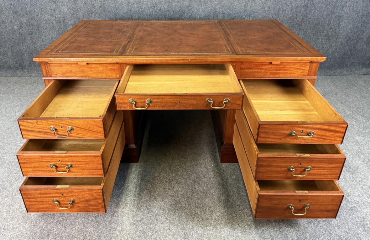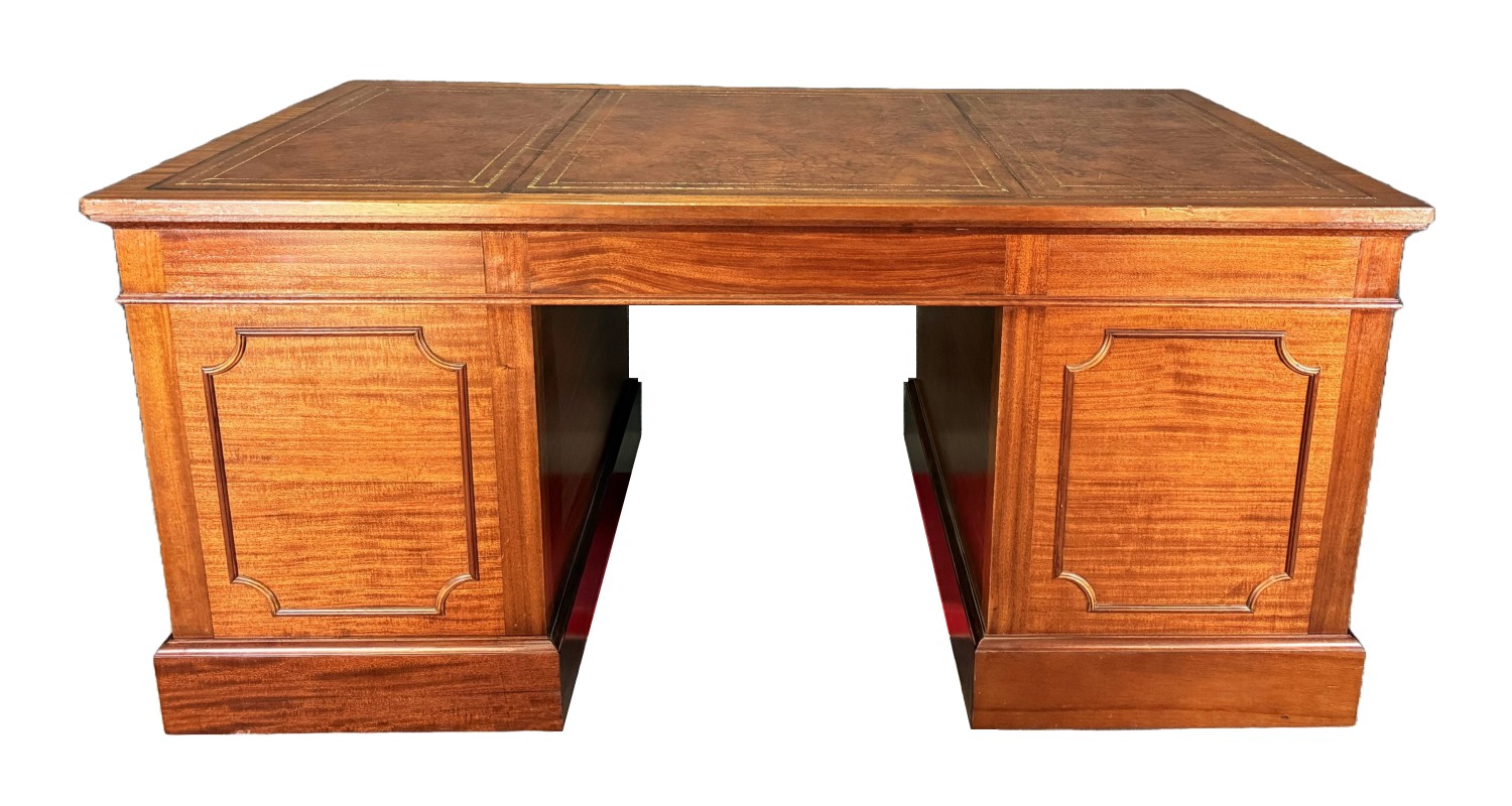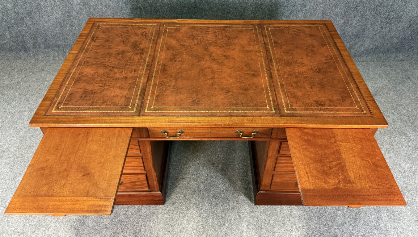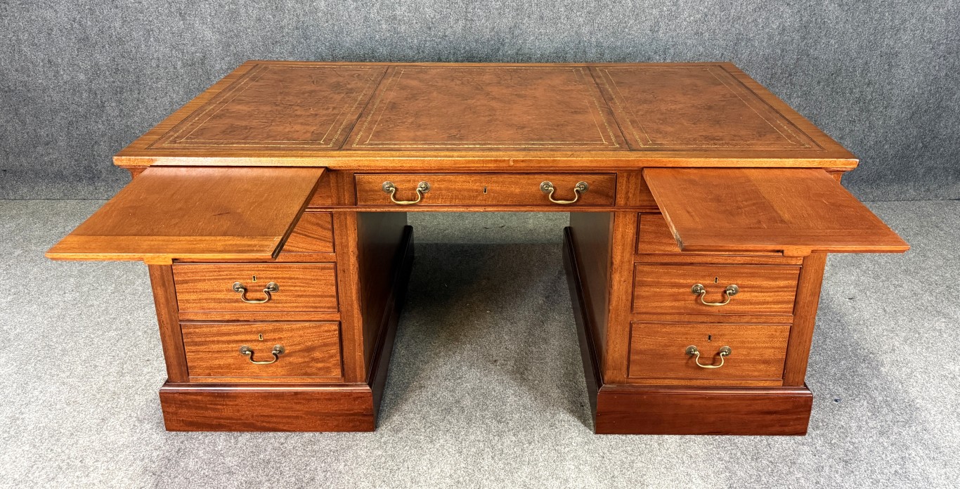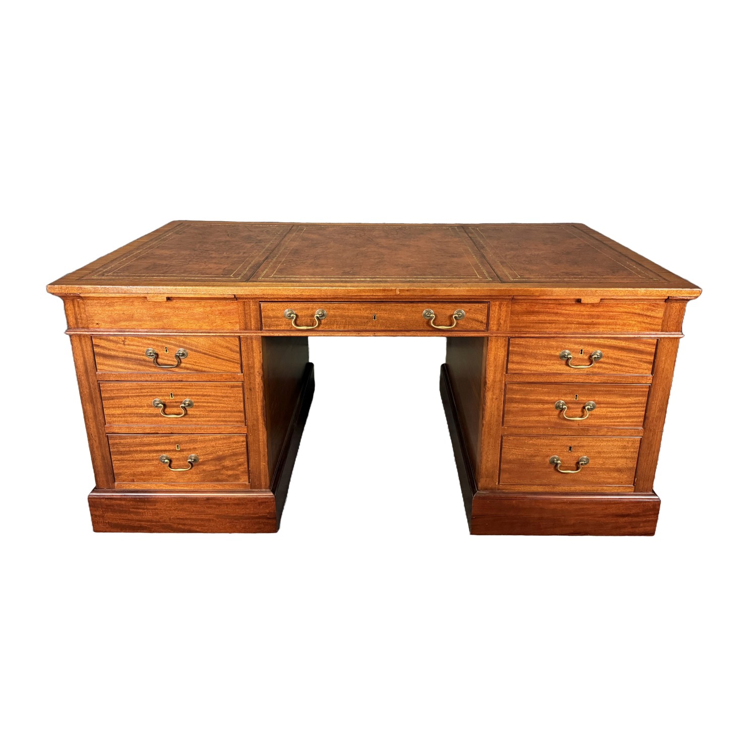 This 19th century mahogany executive desk features a richly figured leather-inlaid top with gilt tooling, flanked by paneled pedestal bases that provide substantial drawer storage. The broad work surface is enhanced by pull-out writing slides, offering added functionality while maintaining a refined, traditional profile. Its solid construction and classic proportions make it an impressive centerpiece for a study or office.