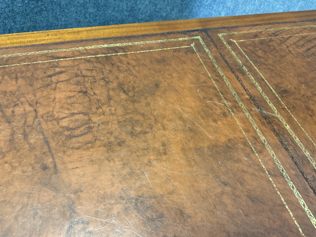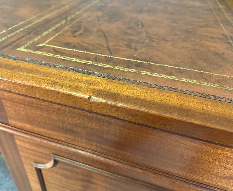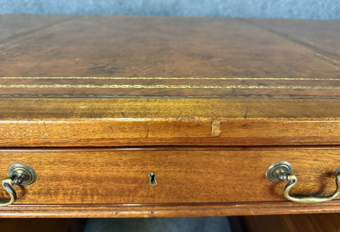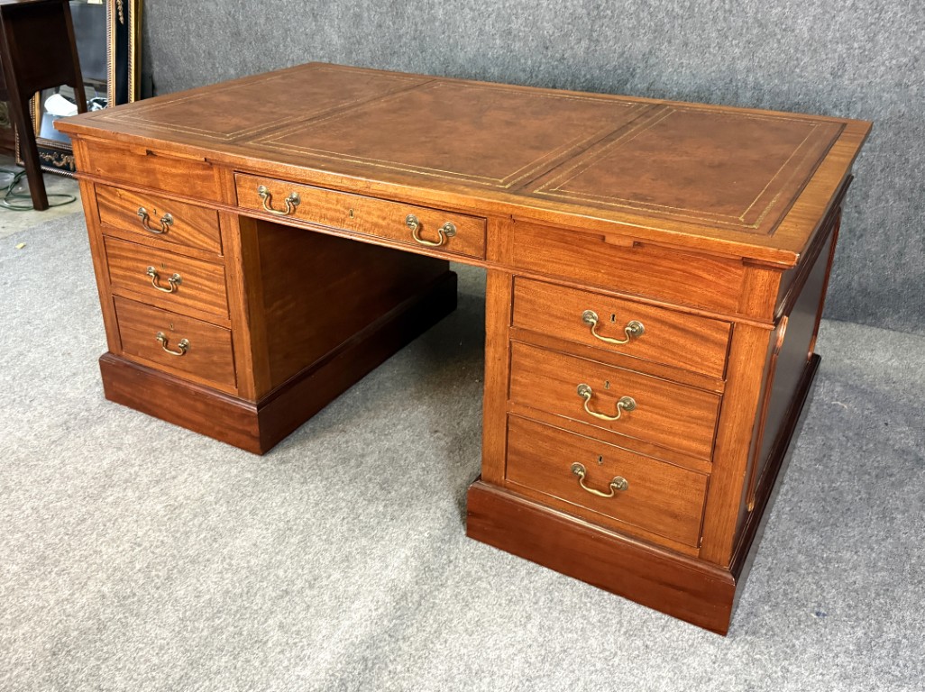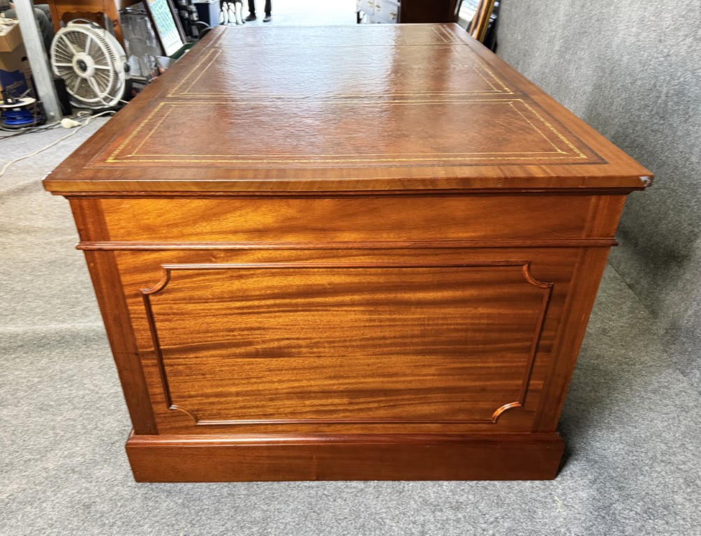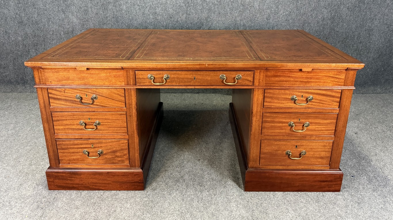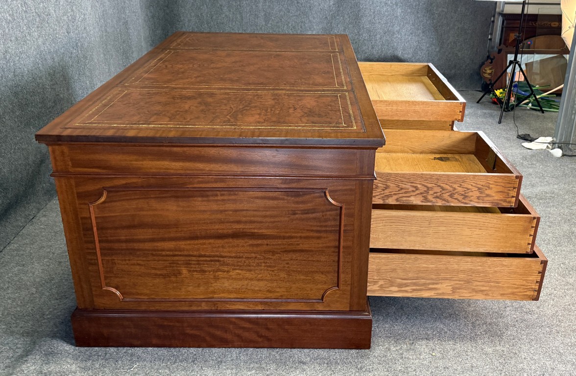 This 19th century mahogany executive desk features a richly figured leather-inlaid top with gilt tooling, flanked by paneled pedestal bases that provide substantial drawer storage. The broad work surface is enhanced by pull-out writing slides, offering added functionality while maintaining a refined, traditional profile. Its solid construction and classic proportions make it an impressive centerpiece for a study or office.