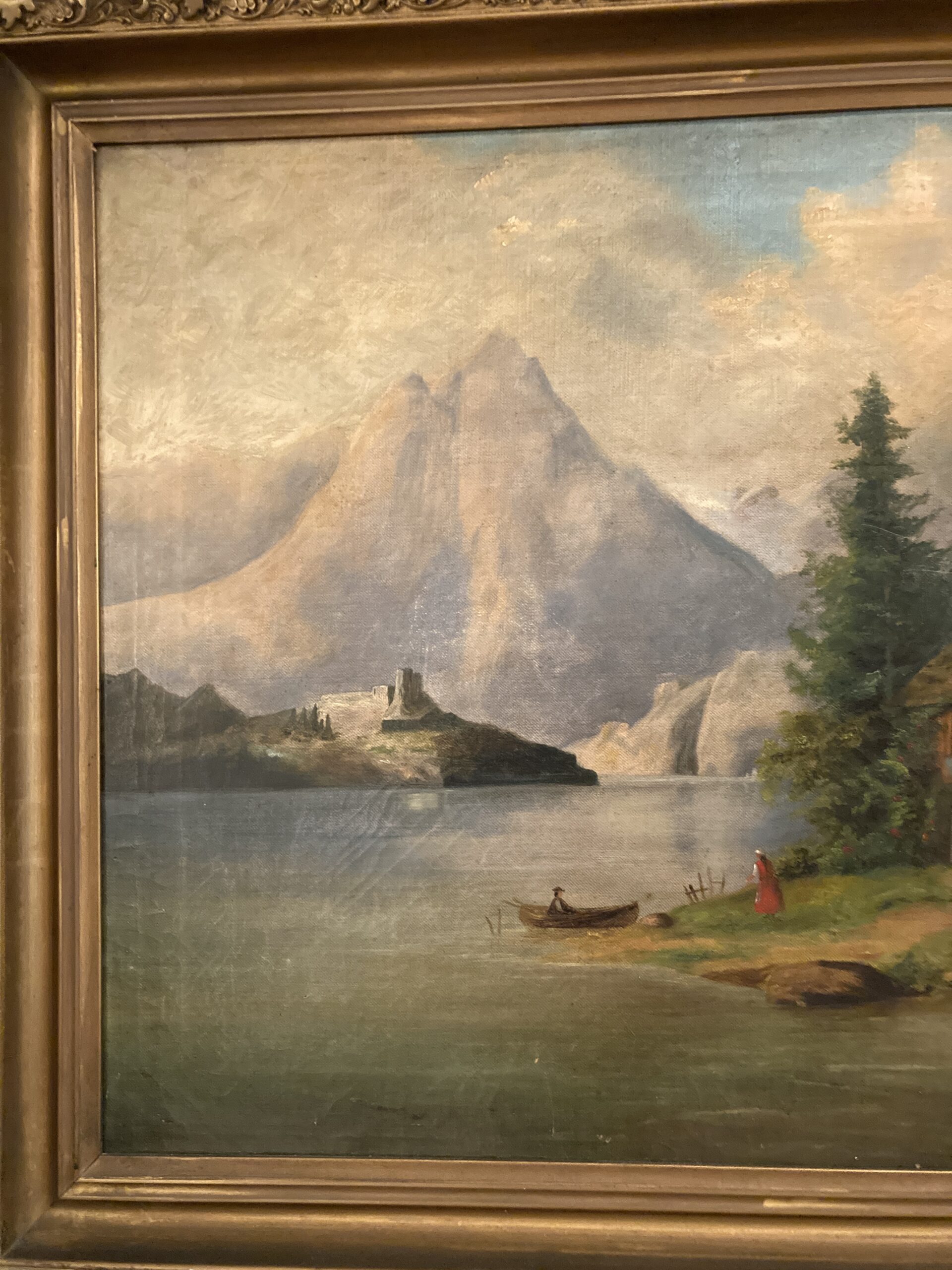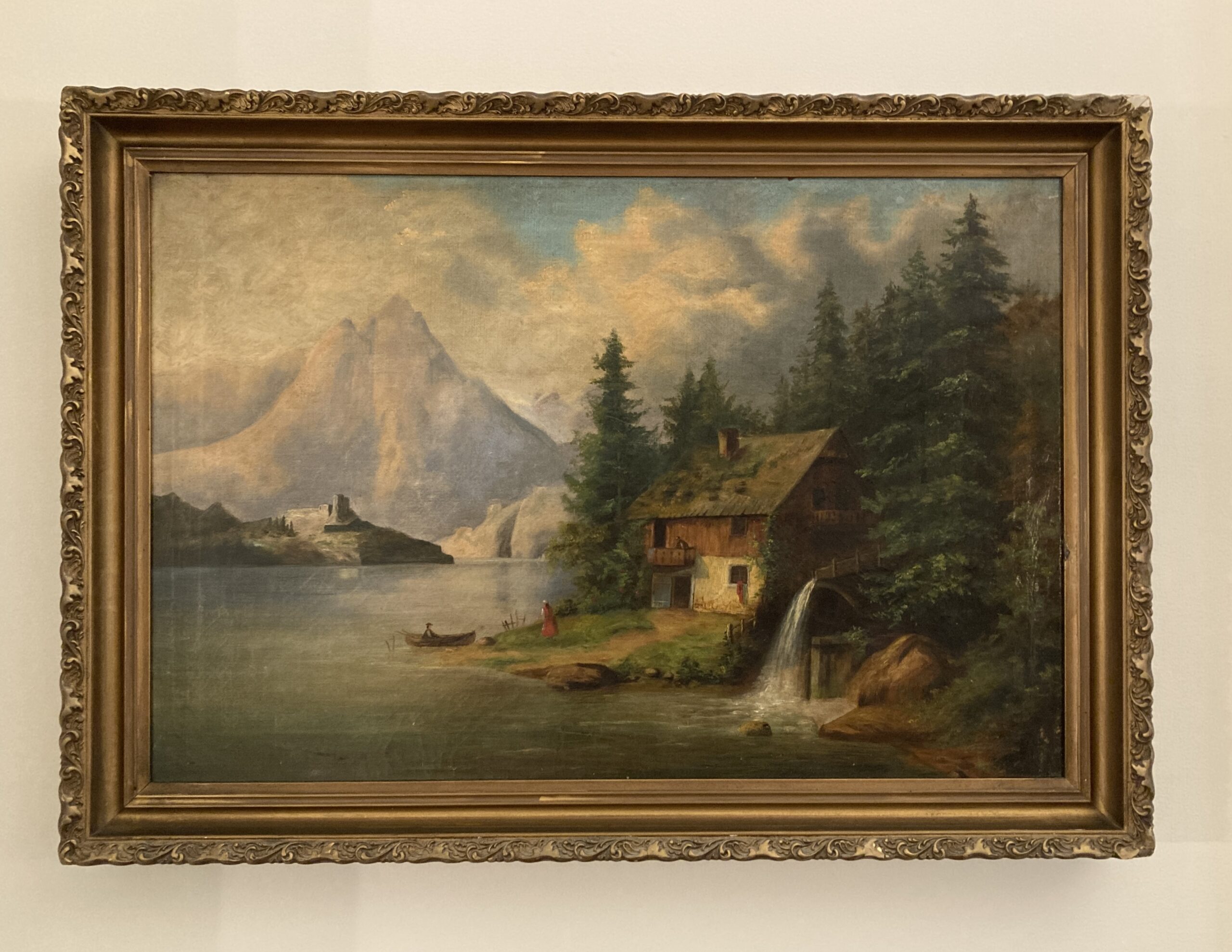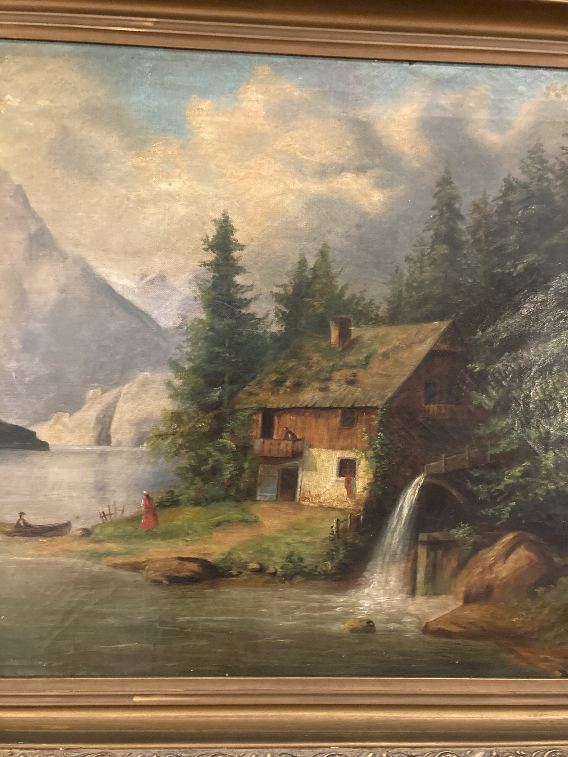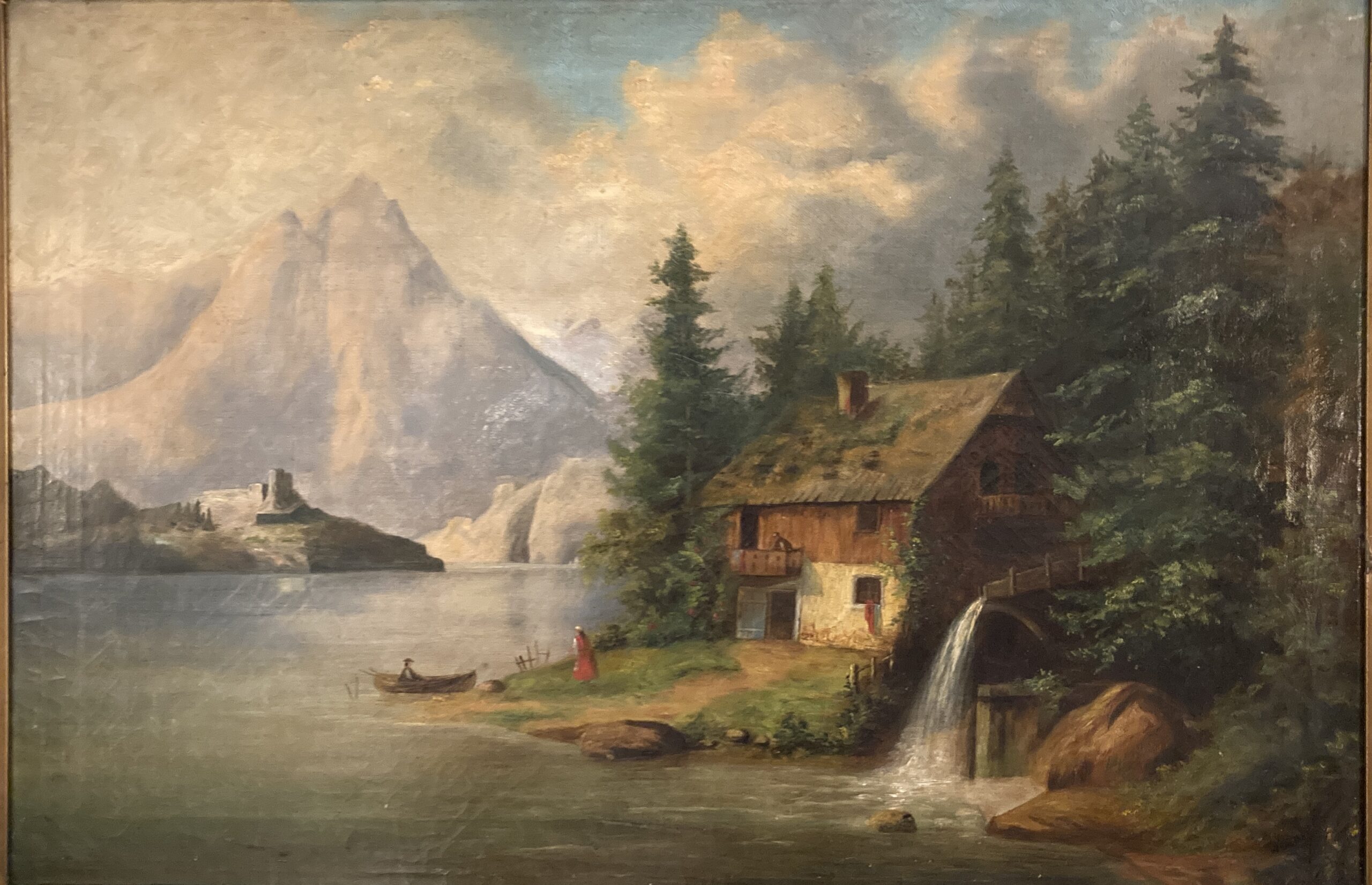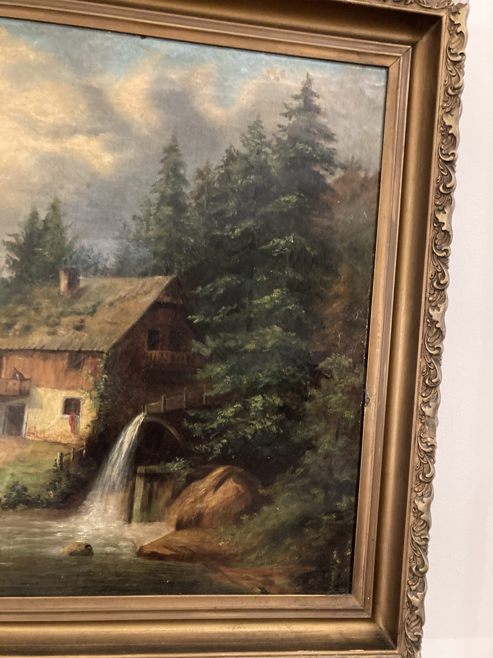 19th Century Original Oil on Canvas Painting of Alpine Landscape with Mill