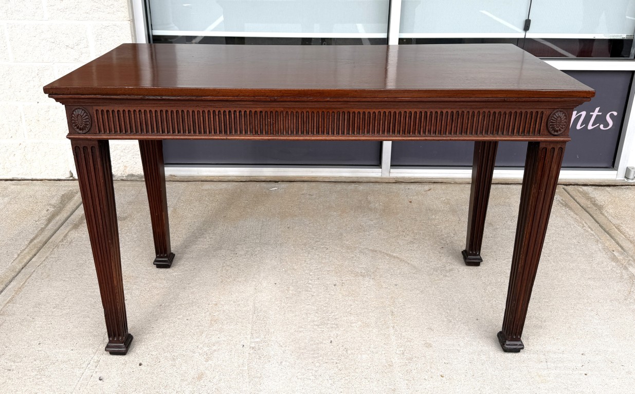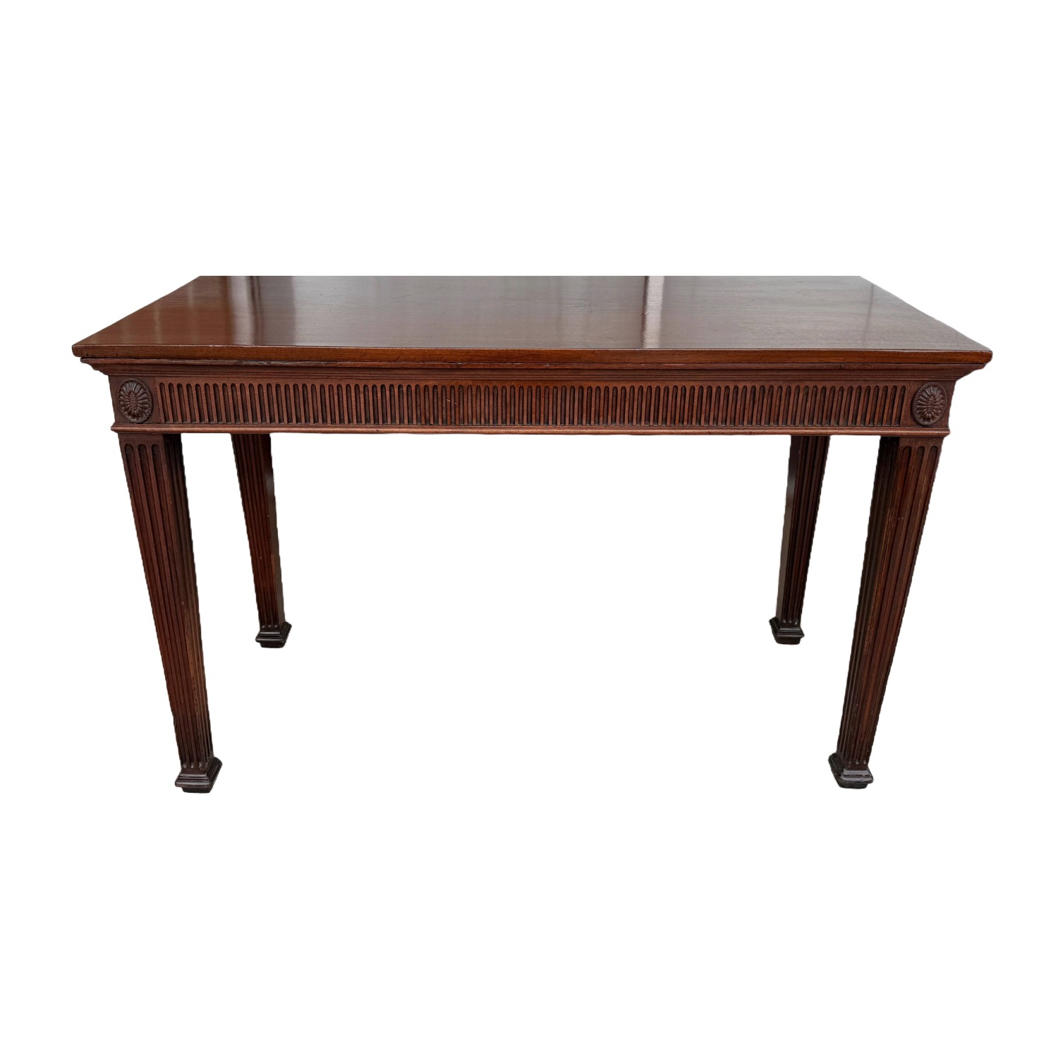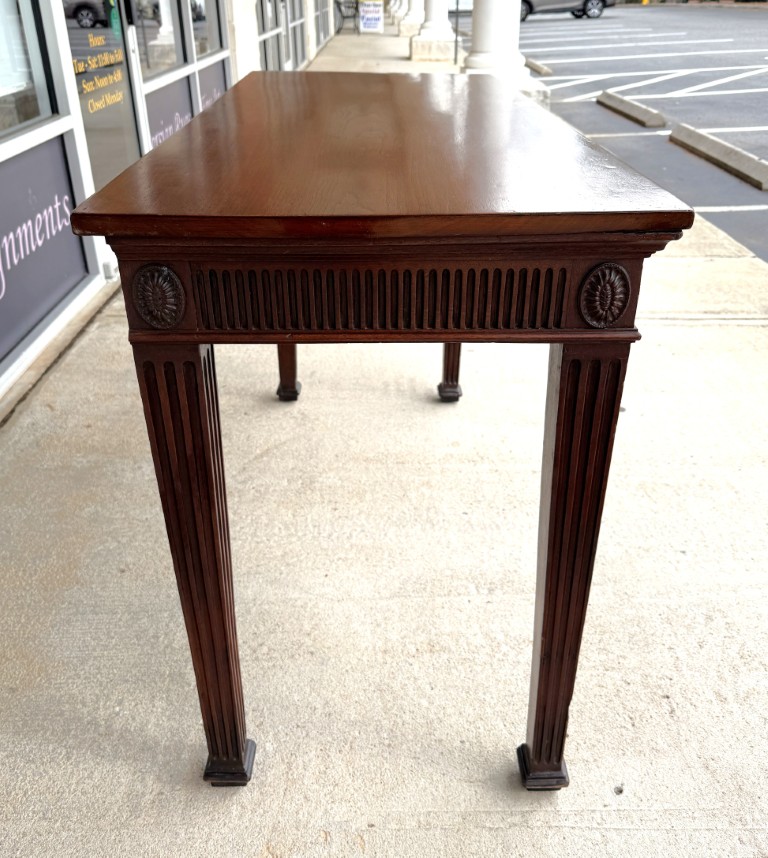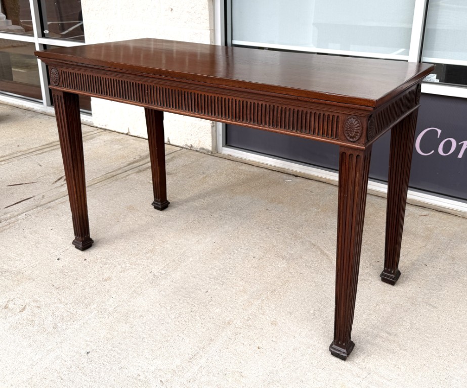 This 19th century solid mahogany foyer table features crisp tapering legs and a beautifully fluted frieze accented with carved rosette details at the corners. Richly finished with classic period proportions, it makes an elegant statement in an entryway, hallway, or behind a sofa.