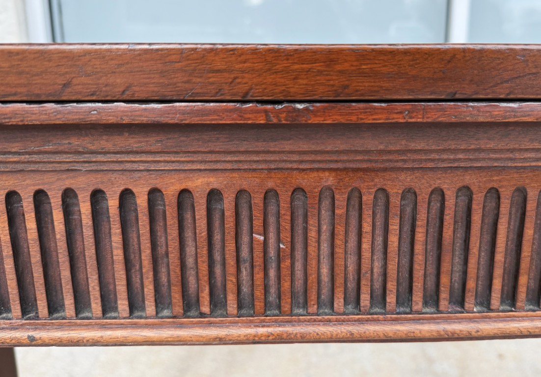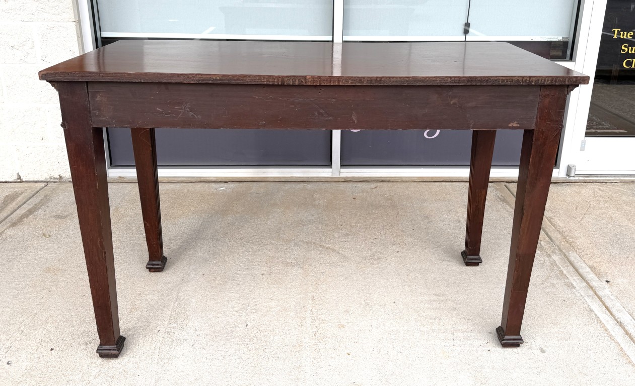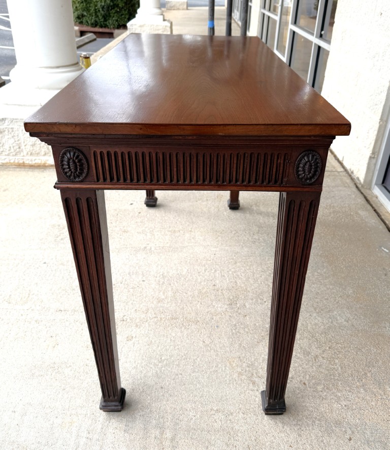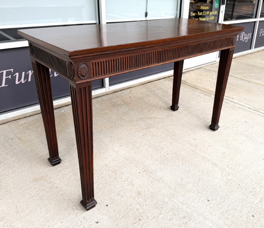 This 19th century solid mahogany foyer table features crisp tapering legs and a beautifully fluted frieze accented with carved rosette details at the corners. Richly finished with classic period proportions, it makes an elegant statement in an entryway, hallway, or behind a sofa.