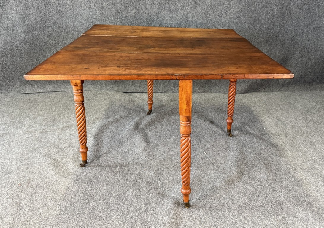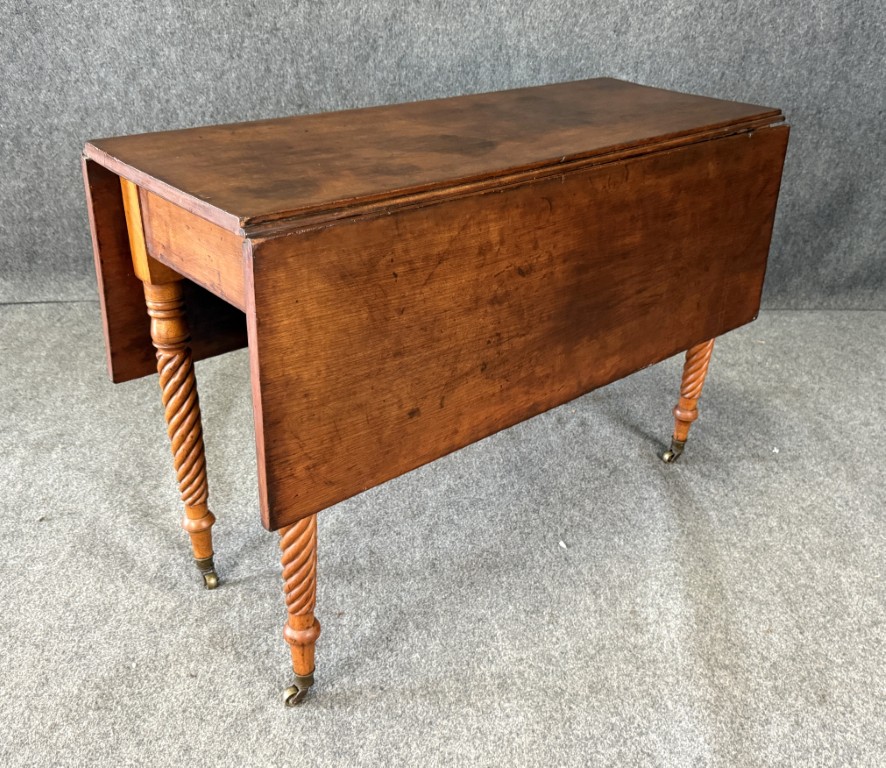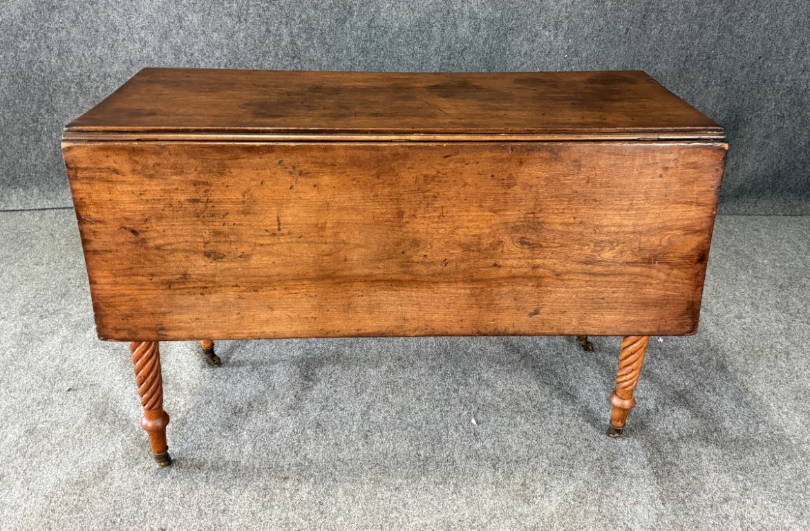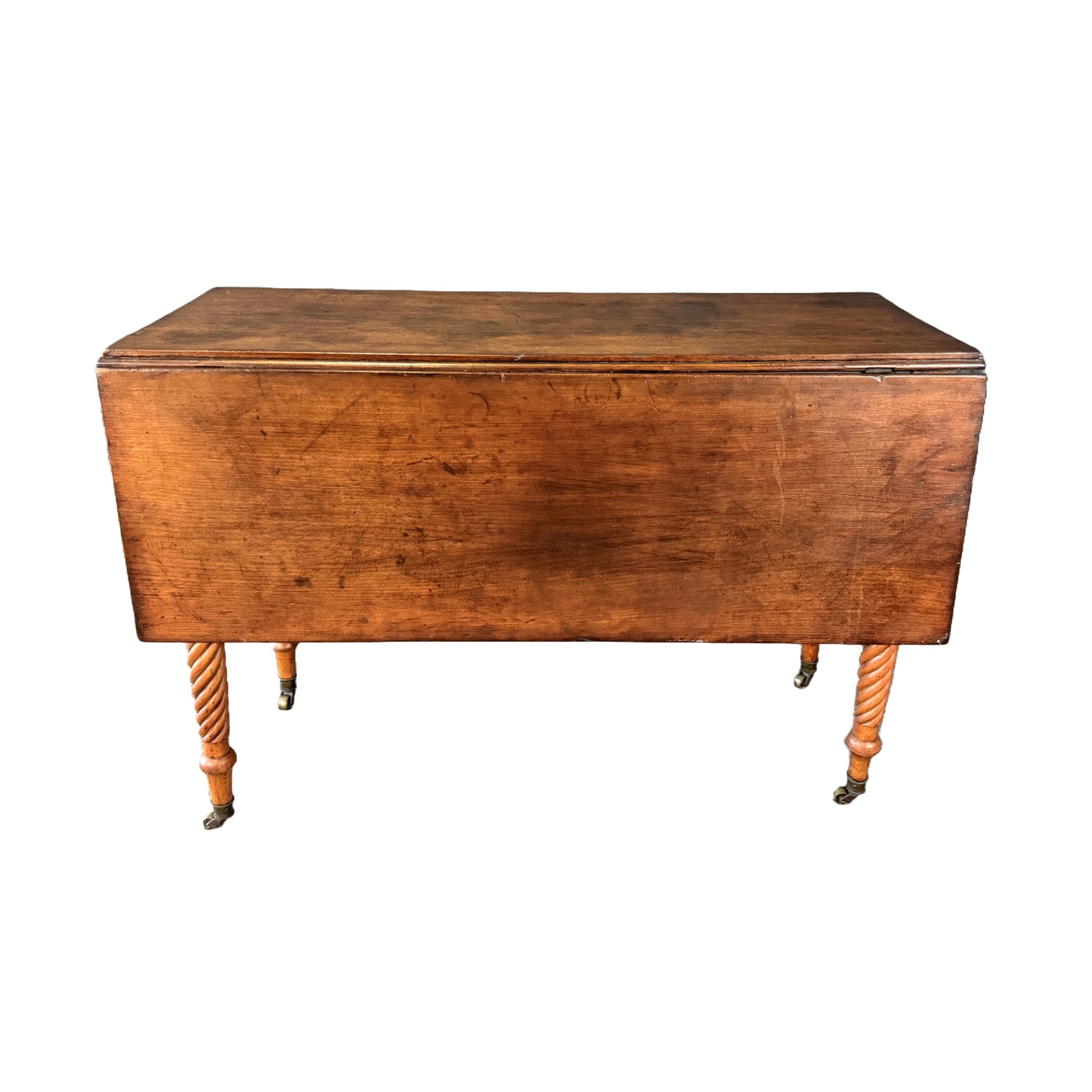 This 19th century solid oak dropleaf table features beautifully turned rope-twist legs on brass casters, combining function with decorative detail. With its hinged leaves, it can be expanded for dining or folded for compact storage or use as a console or sofa table, making it both practical and charming.