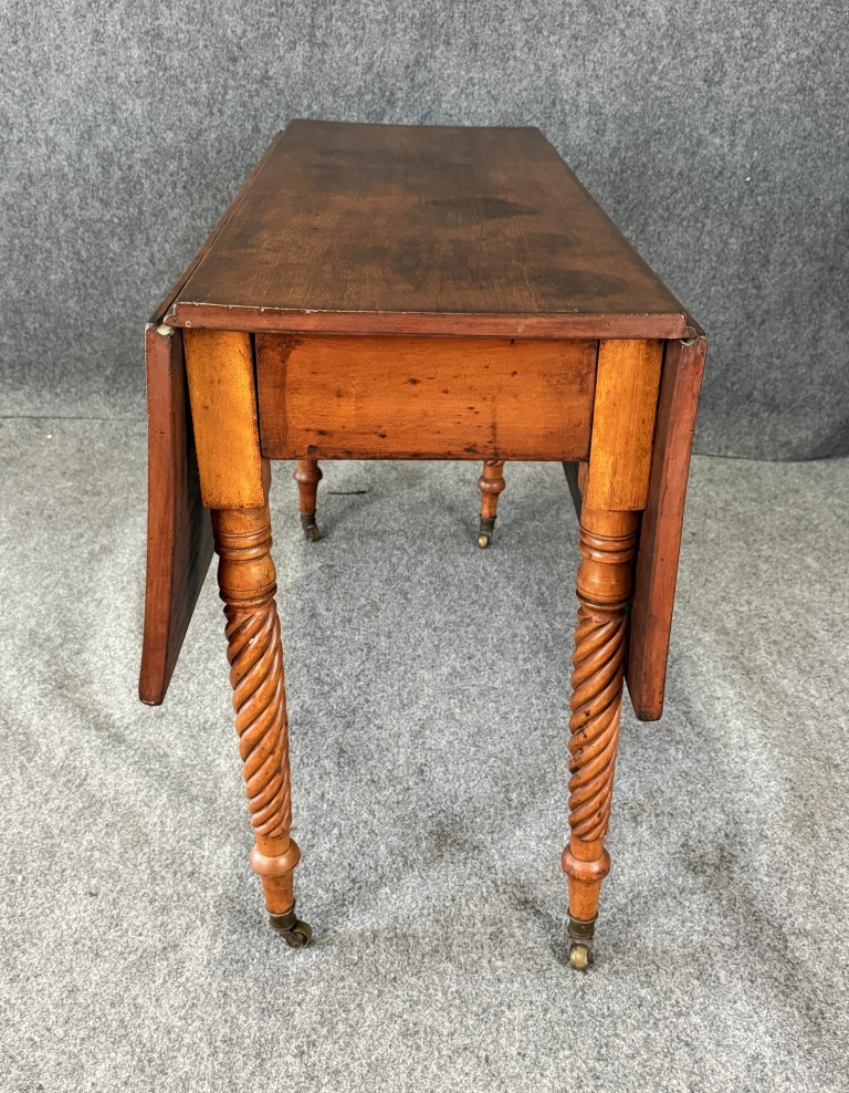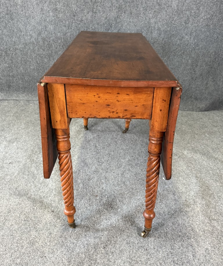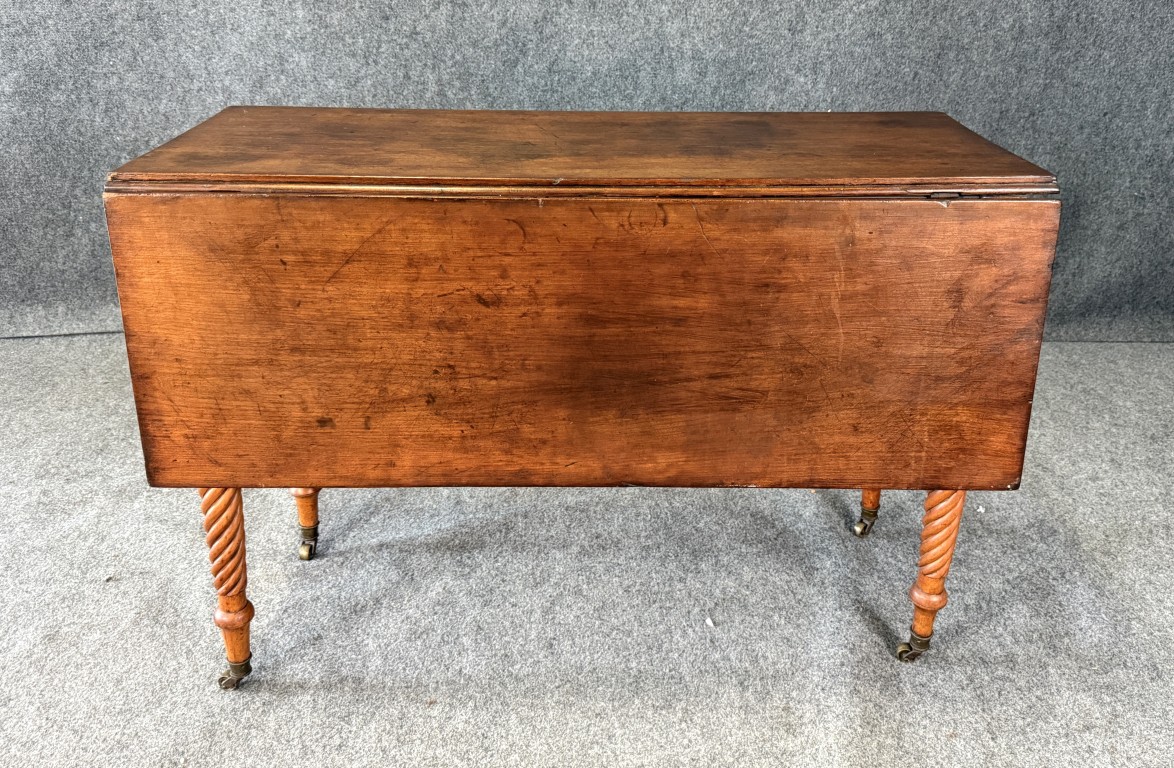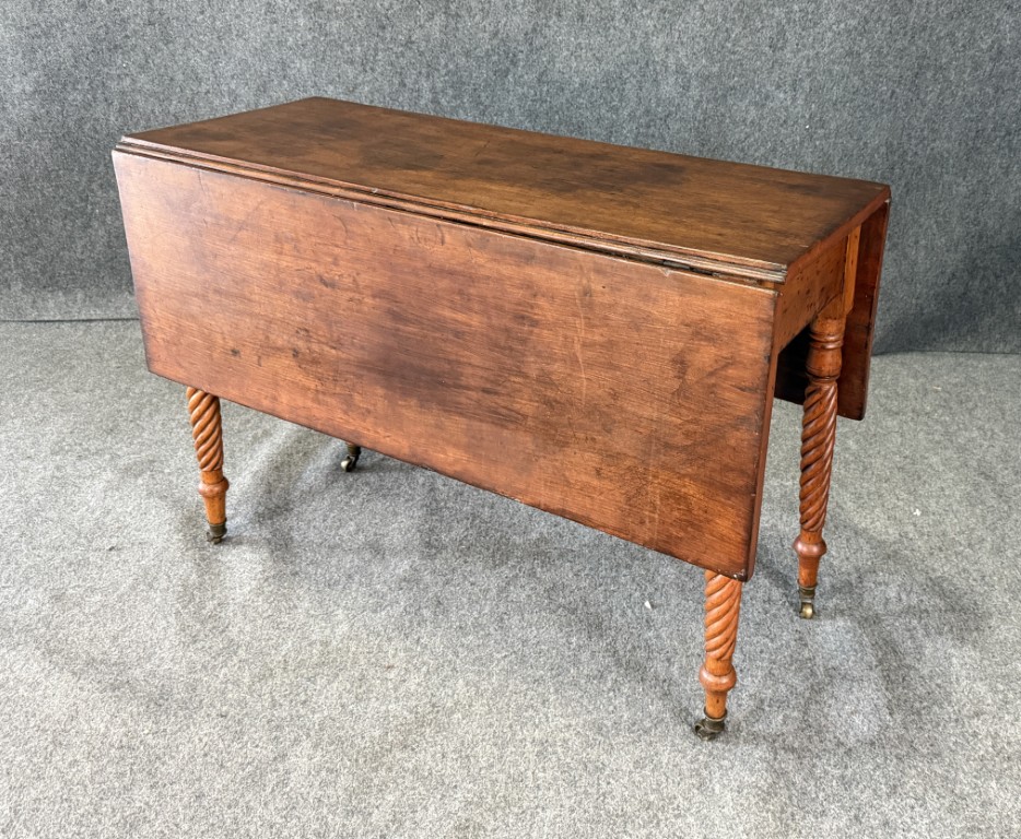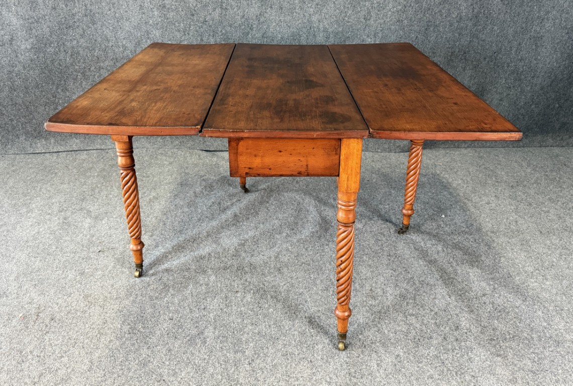 This 19th century solid oak dropleaf table features beautifully turned rope-twist legs on brass casters, combining function with decorative detail. With its hinged leaves, it can be expanded for dining or folded for compact storage or use as a console or sofa table, making it both practical and charming.