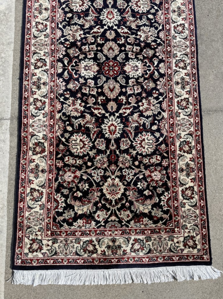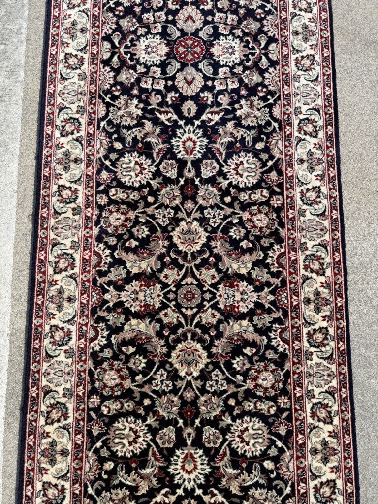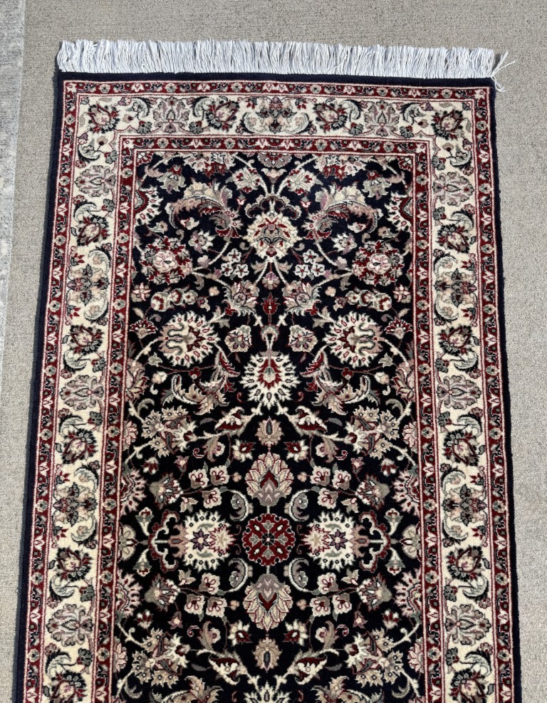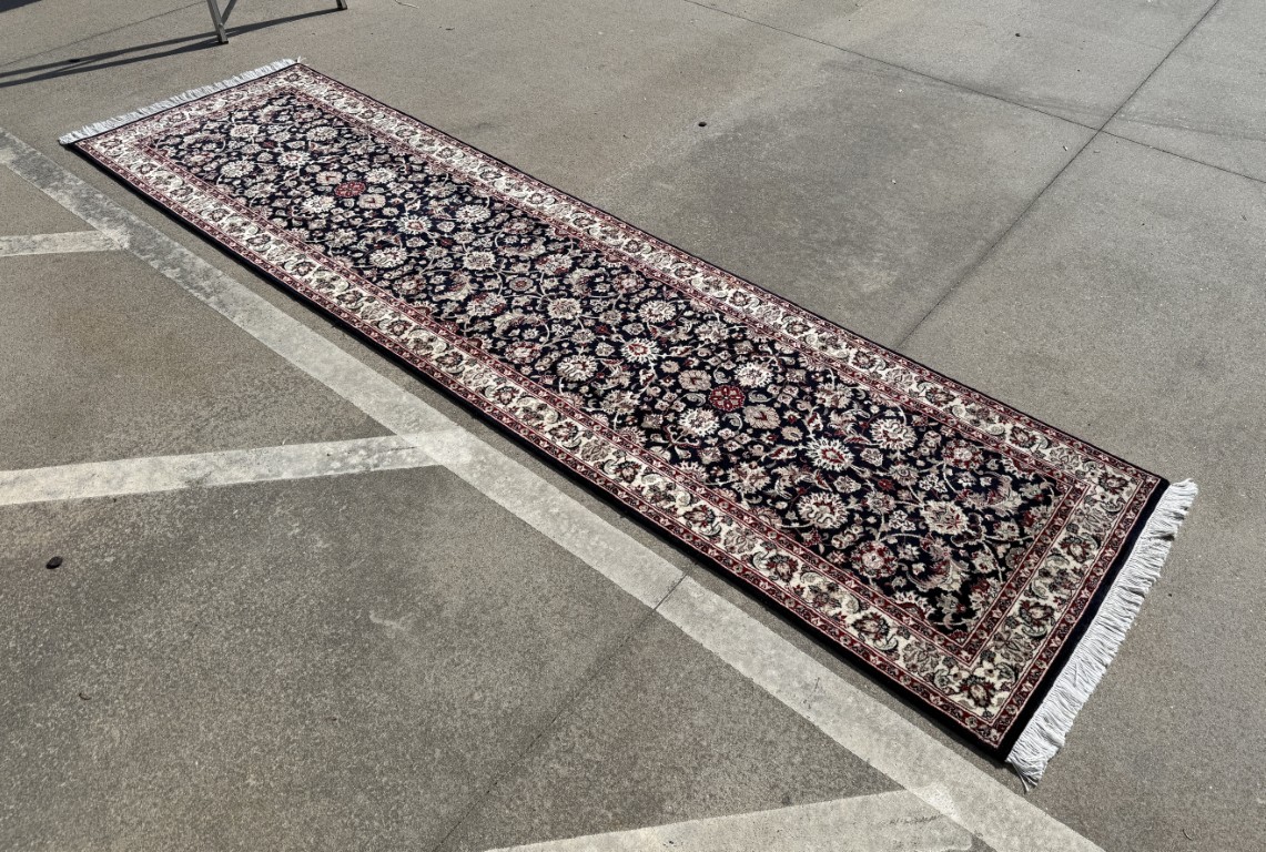 This 3×10 Hand-Knotted Tabriz Style Runner features an elegant allover floral and vine design woven in shades of ivory, red, and beige against a black field. Expertly crafted with fine detailing, it brings the refined symmetry and sophistication characteristic of traditional Persian Tabriz rugs to hallways and long spaces.