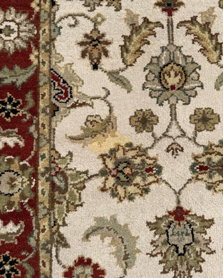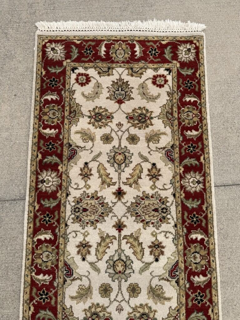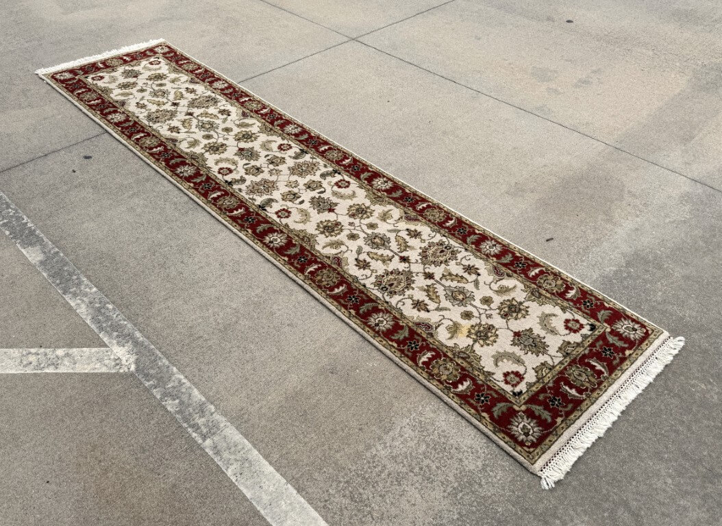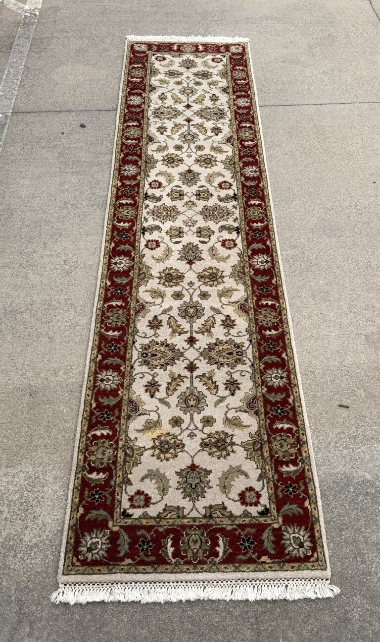 This 3×10 hand-knotted runner features an elegant ivory field filled with finely detailed floral and vine motifs, framed by a rich red border that creates a striking contrast. The design is inspired by classic Persian Tabriz-style rugs, known for their intricate botanical patterns and refined symmetry, making it an excellent choice for hallways or narrow spaces.