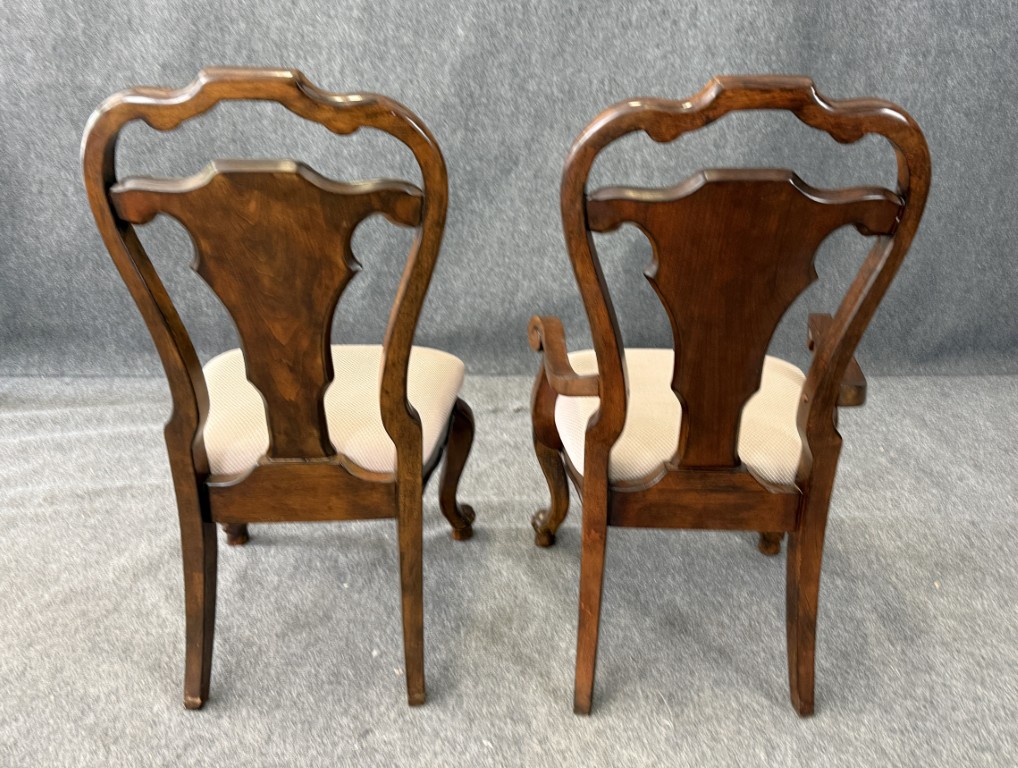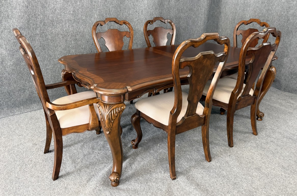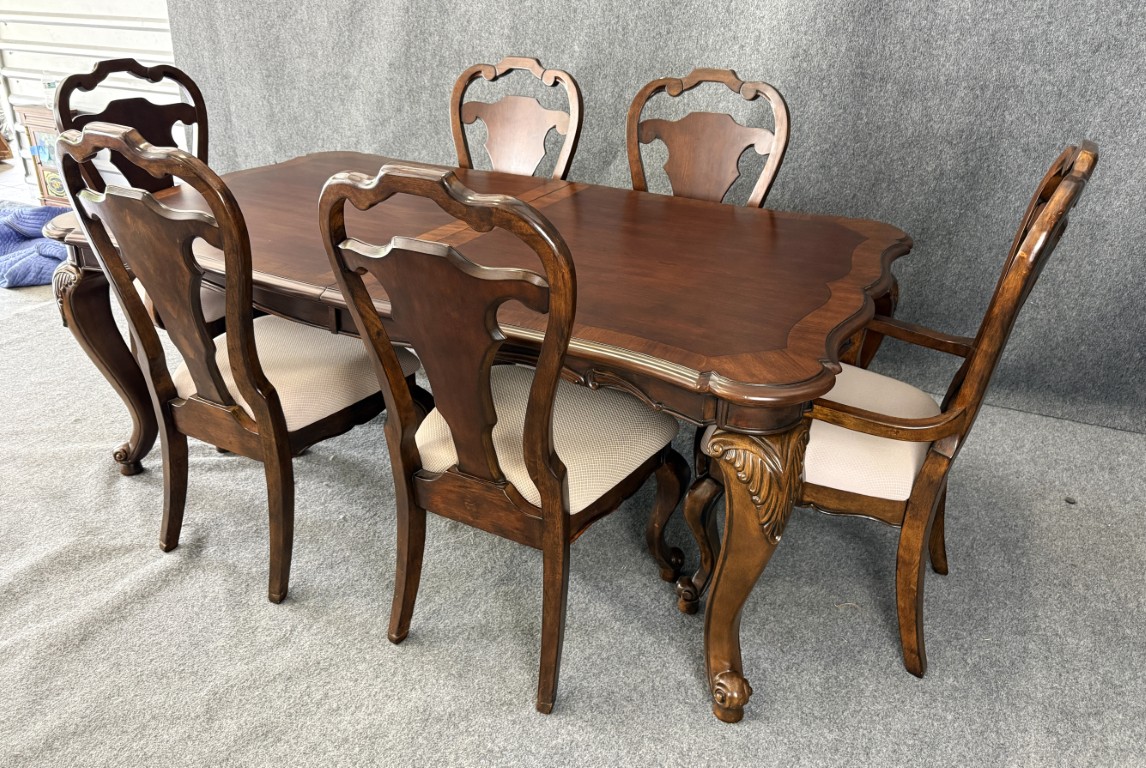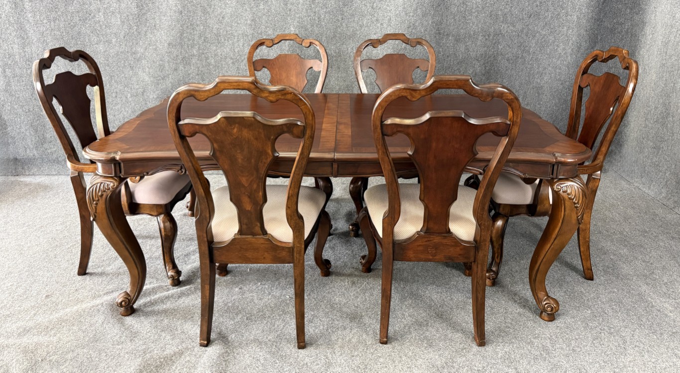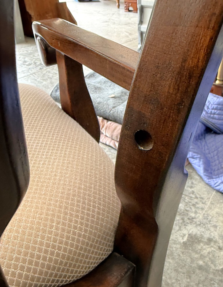 Your happiness with this item is of the utmost importance to us so please review the photographs carefully for condition. We endeavor to try and list any issues we may observe; we may not necessarily note all minor nicks and dings or we may simply miss something. Please inspect carefully to ensure your full happiness with this item. For this particular piece we found wear consistent with age and prior use, including some finish loss on table feet and edge of table, minor surface scratches on table top, and one textured spot on one leaf. There is one rub mark on top of one side chair, one front foot of an arm chair with wear, the other arm chair has finish loss on the bottom of the middle back slat, and one arm chair missing hole cap.