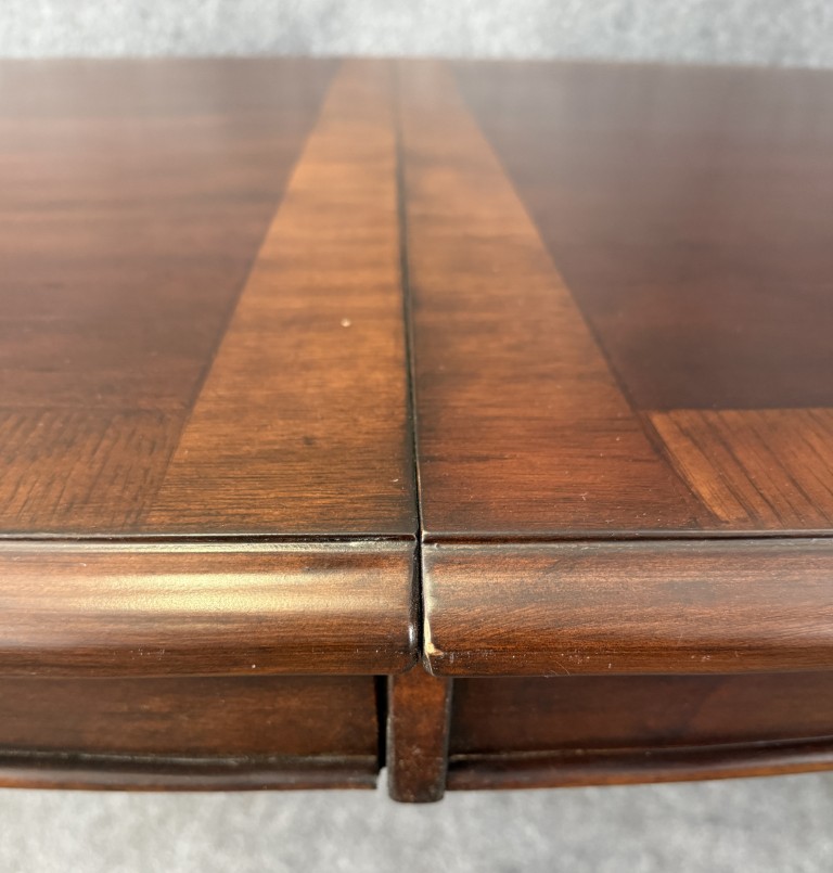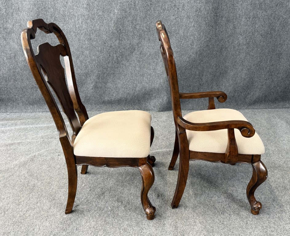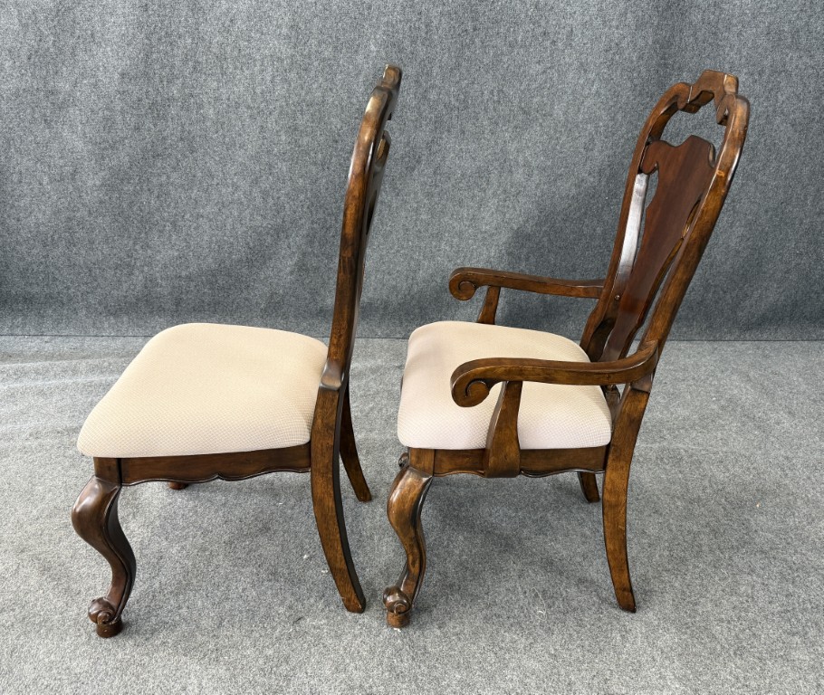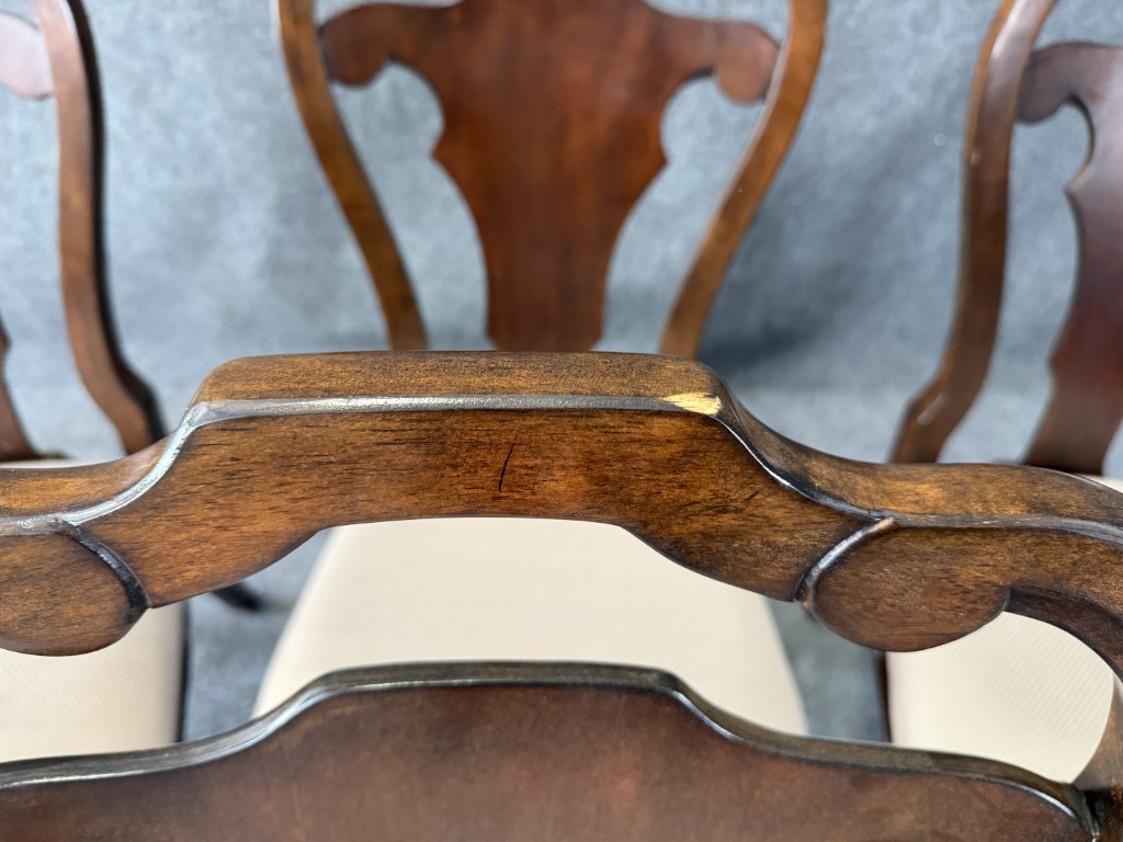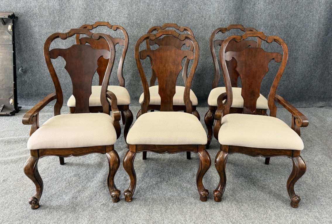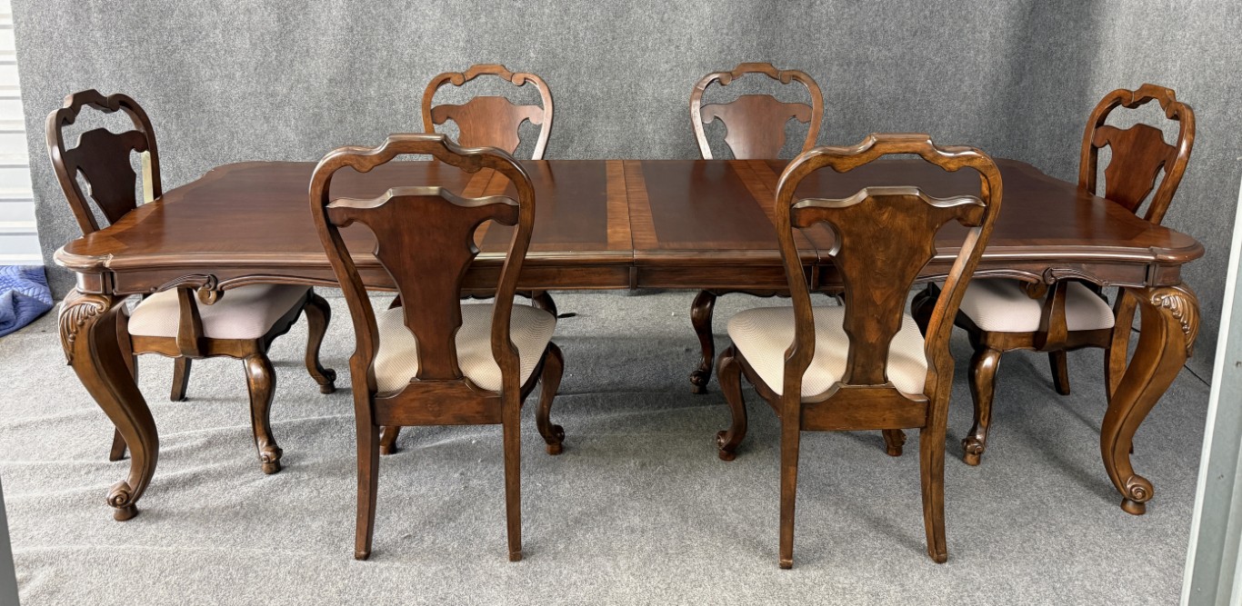 Your happiness with this item is of the utmost importance to us so please review the photographs carefully for condition. We endeavor to try and list any issues we may observe; we may not necessarily note all minor nicks and dings or we may simply miss something. Please inspect carefully to ensure your full happiness with this item. For this particular piece we found wear consistent with age and prior use, including some finish loss on table feet and edge of table, minor surface scratches on table top, and one textured spot on one leaf. There is one rub mark on top of one side chair, one front foot of an arm chair with wear, the other arm chair has finish loss on the bottom of the middle back slat, and one arm chair missing hole cap.