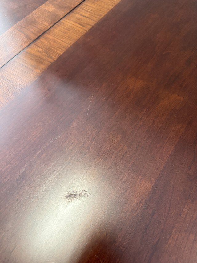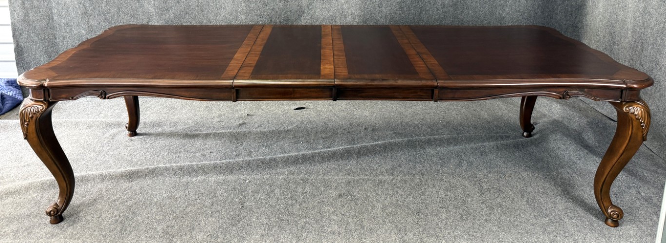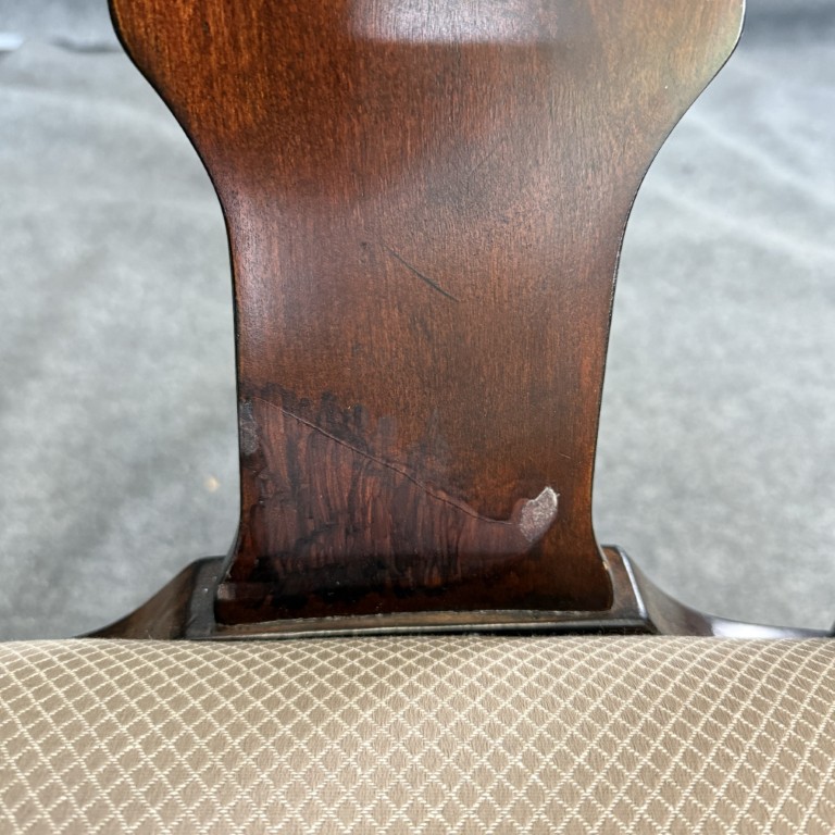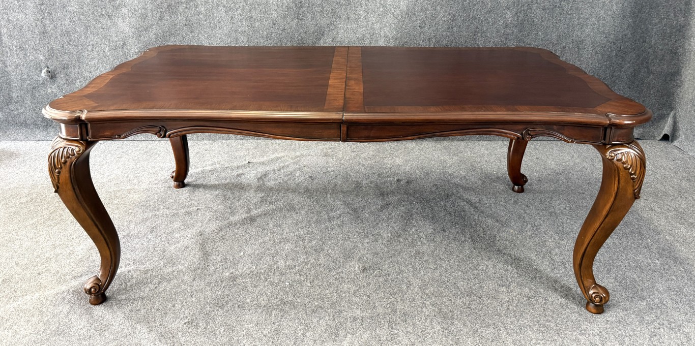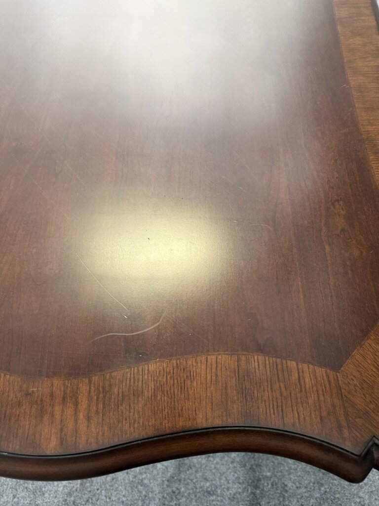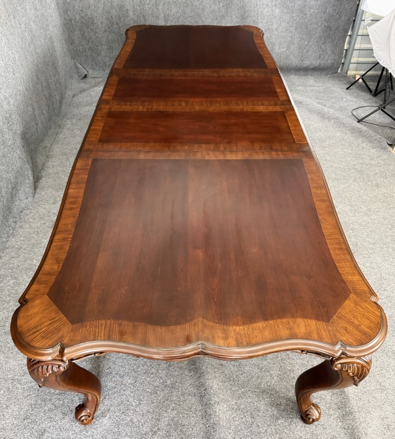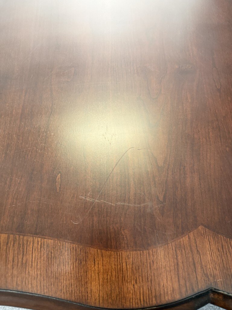 Your happiness with this item is of the utmost importance to us so please review the photographs carefully for condition. We endeavor to try and list any issues we may observe; we may not necessarily note all minor nicks and dings or we may simply miss something. Please inspect carefully to ensure your full happiness with this item. For this particular piece we found wear consistent with age and prior use, including some finish loss on table feet and edge of table, minor surface scratches on table top, and one textured spot on one leaf. There is one rub mark on top of one side chair, one front foot of an arm chair with wear, the other arm chair has finish loss on the bottom of the middle back slat, and one arm chair missing hole cap.
