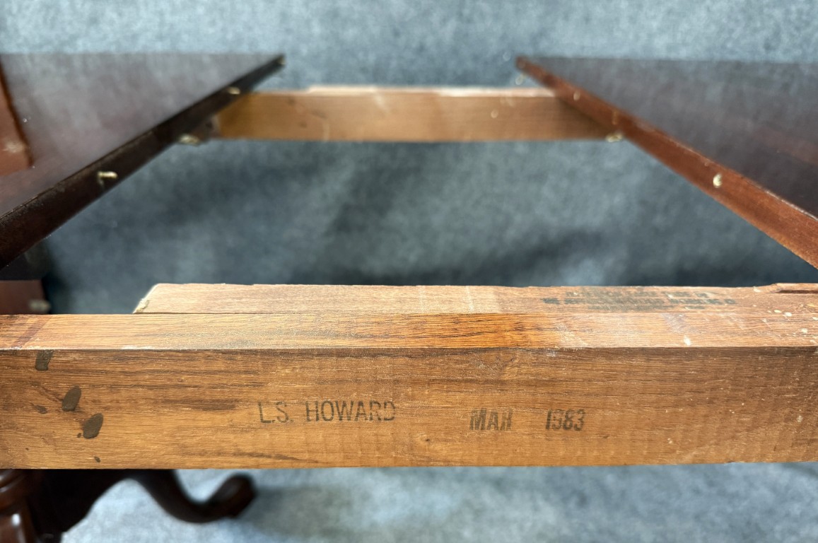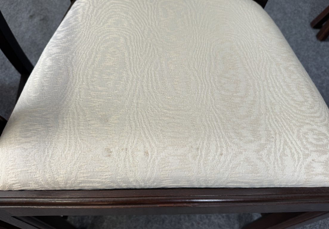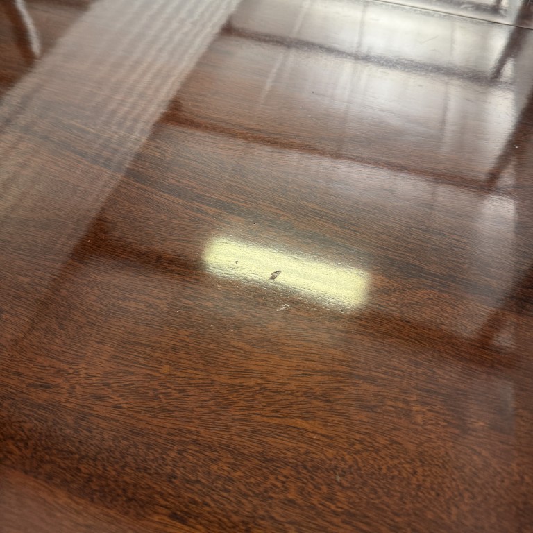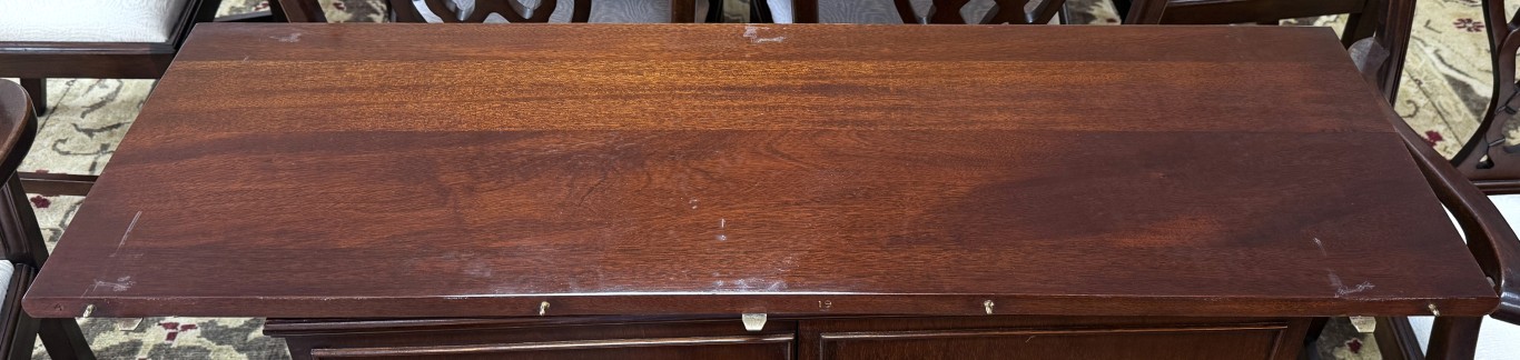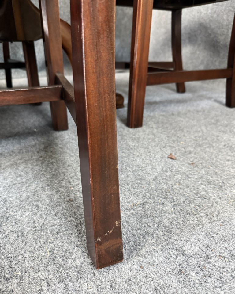 Your happiness with this item is of the utmost importance to us so please review the photographs carefully for condition. We endeavor to try and list any issues we may observe; we may not necessarily note all minor nicks and dings or we may simply miss something. Please inspect carefully to ensure your full happiness with this item. For this particular piece we found wear consistent with age and prior use, including minor crackling to the lacquered finish, one leaf significantly scratched (this damage took place after the photos of the entire table were photographed, so see photo of individual leaf for reference), and minor scuffs and stains on a few chairs.