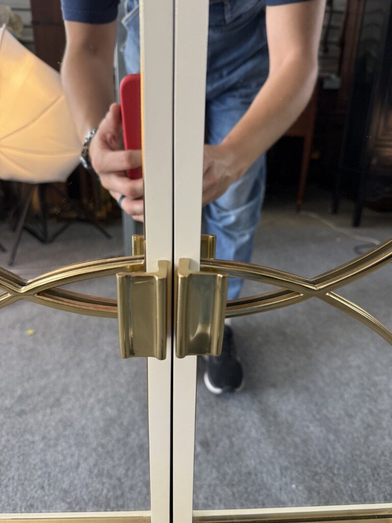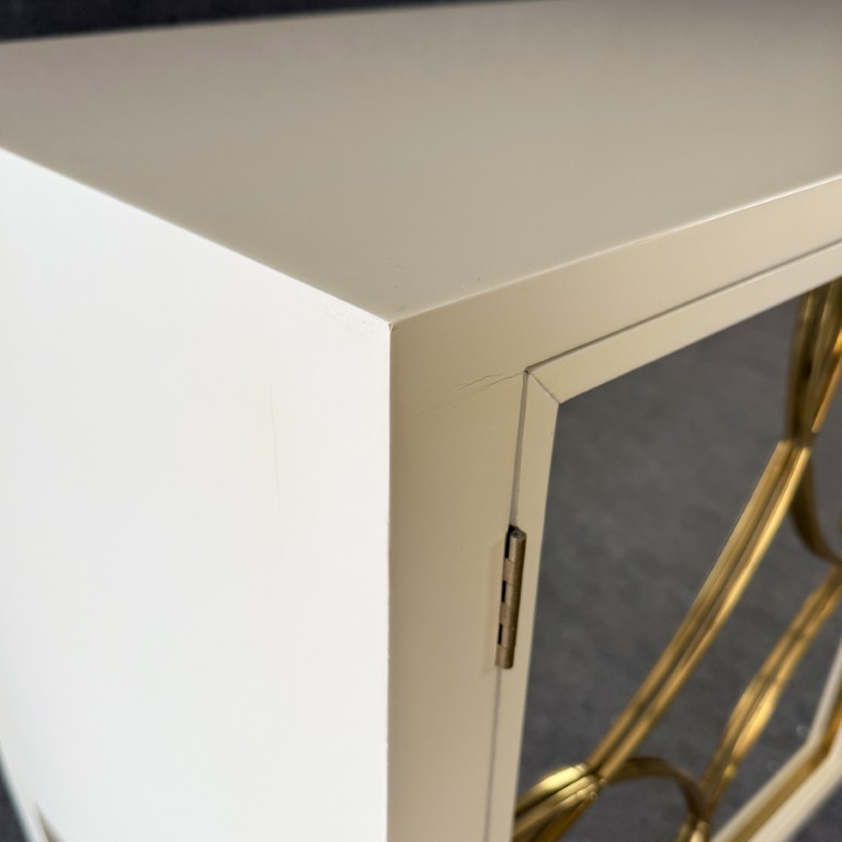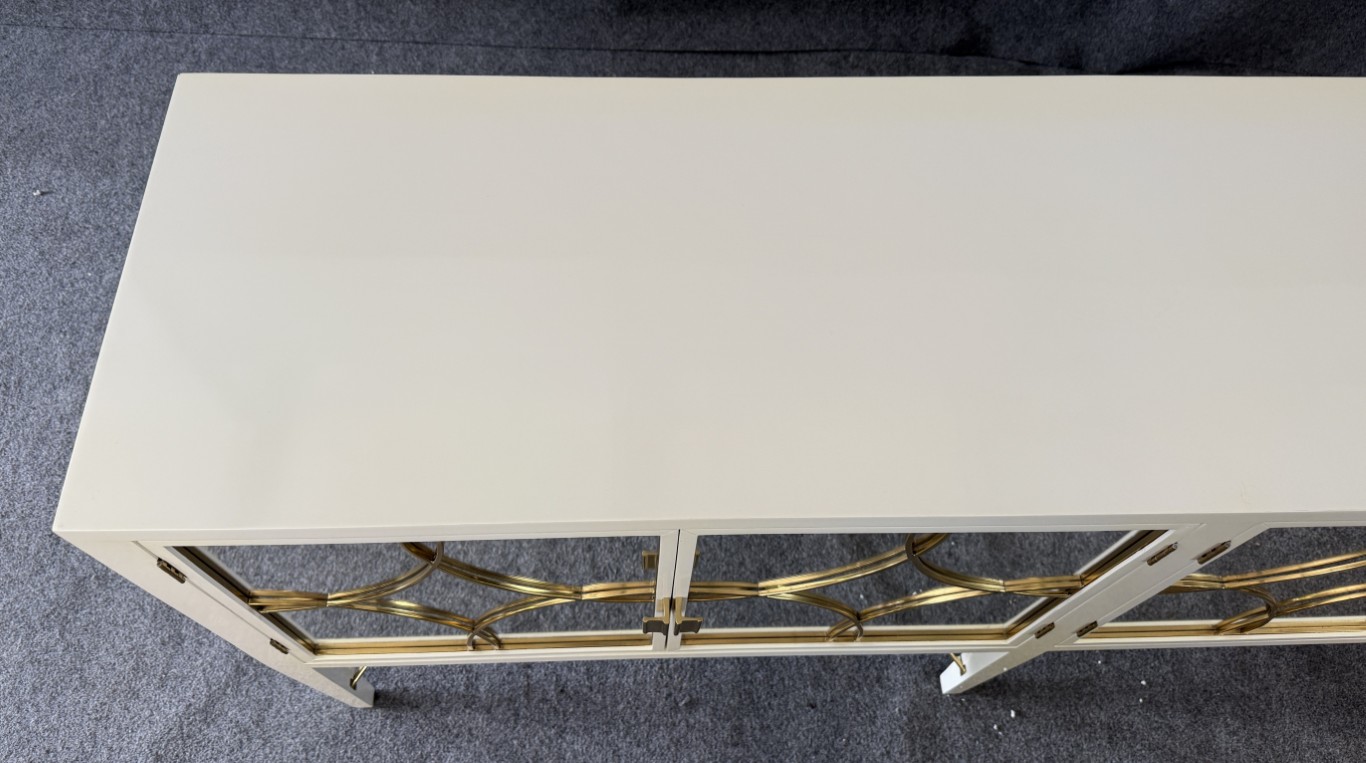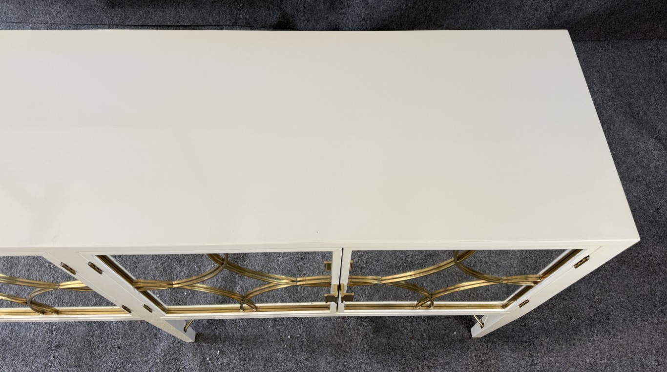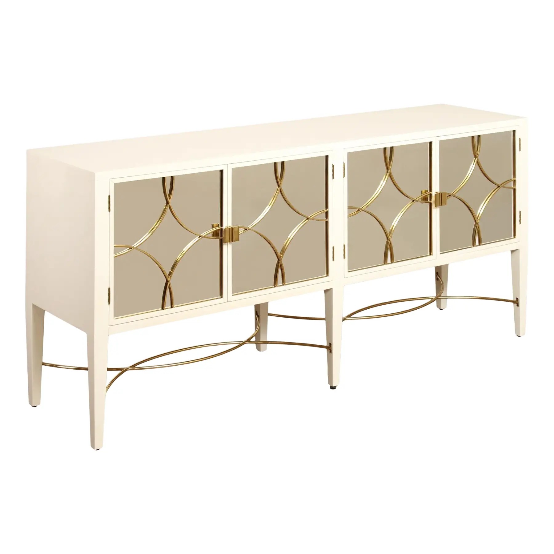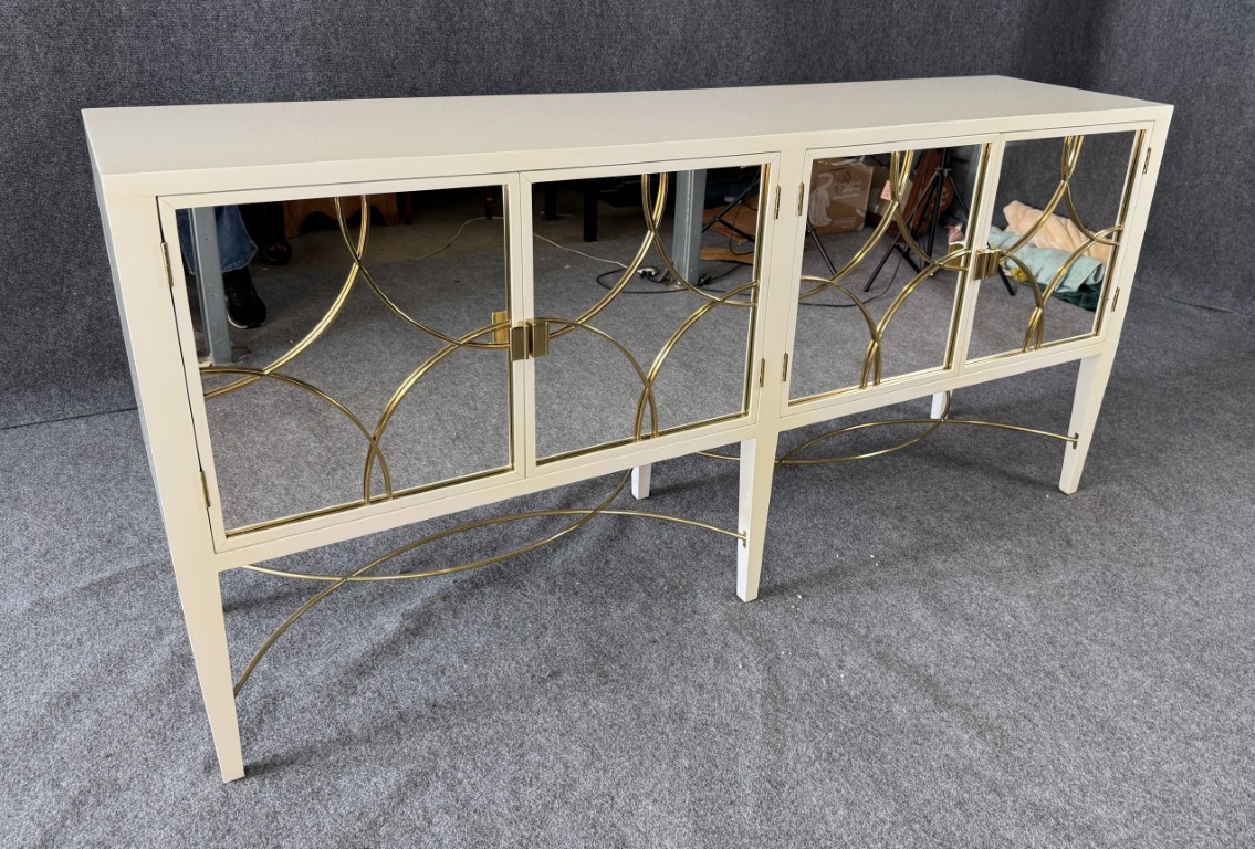 This Alden Parkes Designs White Lacquer Mirror Door Sideboard features a sleek lacquered finish with mirrored doors accented by interlocking gold circle overlays. The elegant brass detailing continues along the curved stretcher base, adding a touch of sophistication and glamour. Inside, adjustable shelving provides generous storage, making it both a statement piece and a functional addition to any contemporary space.