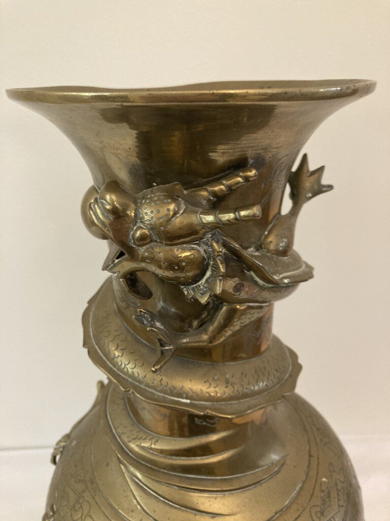 Antique Chinese Bronze Vase with Dragon Motif Signed with character marks.