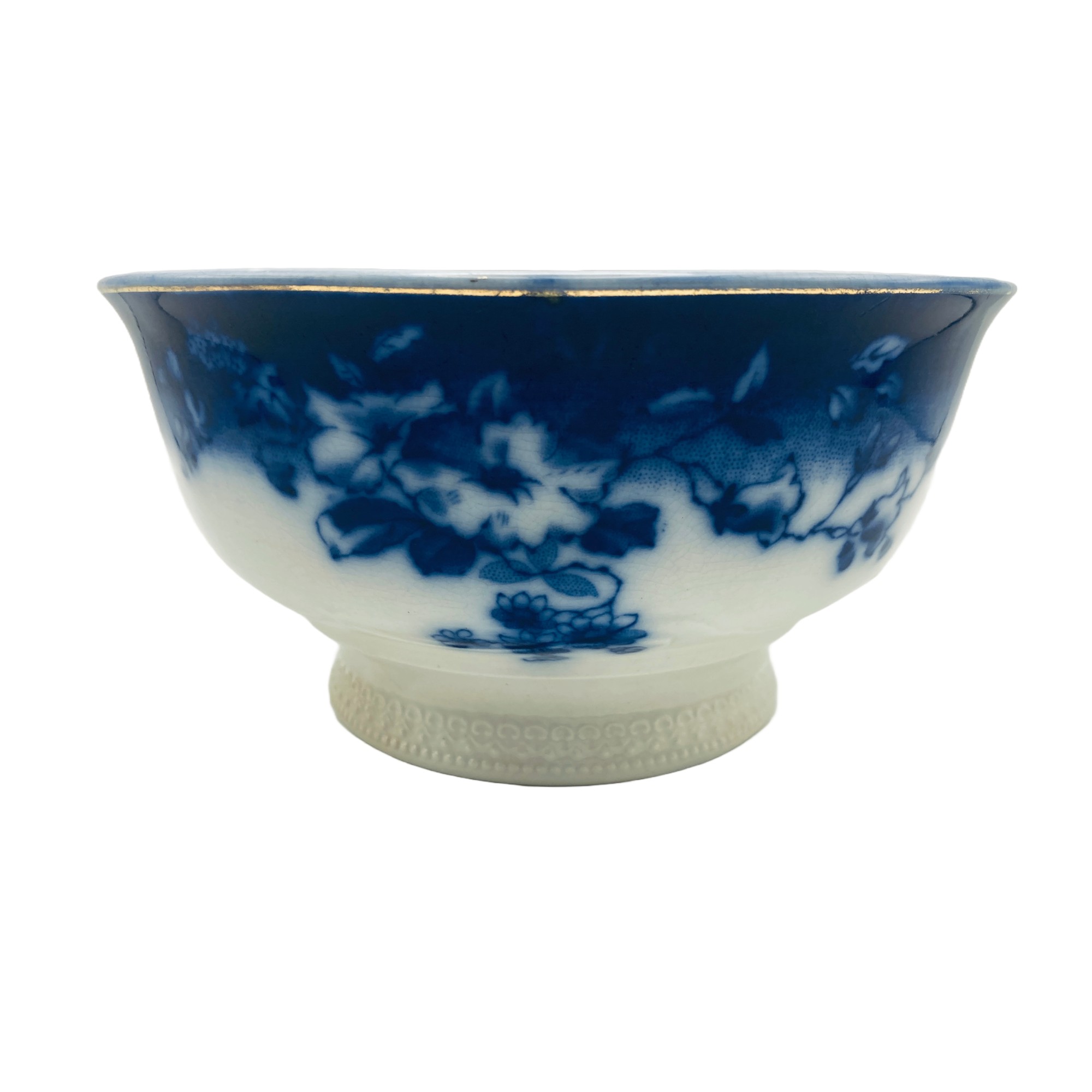 Unusual shape and size, similar to the size of a cereal bowl. Embossed detail at base and gold accents to rim.