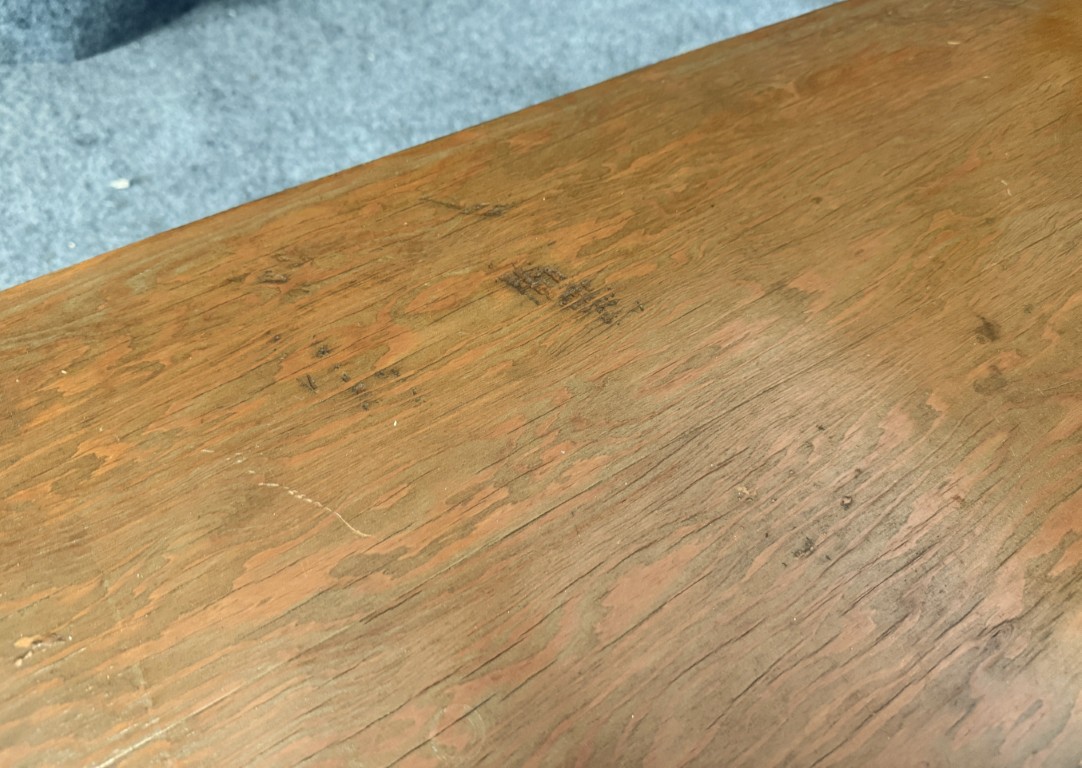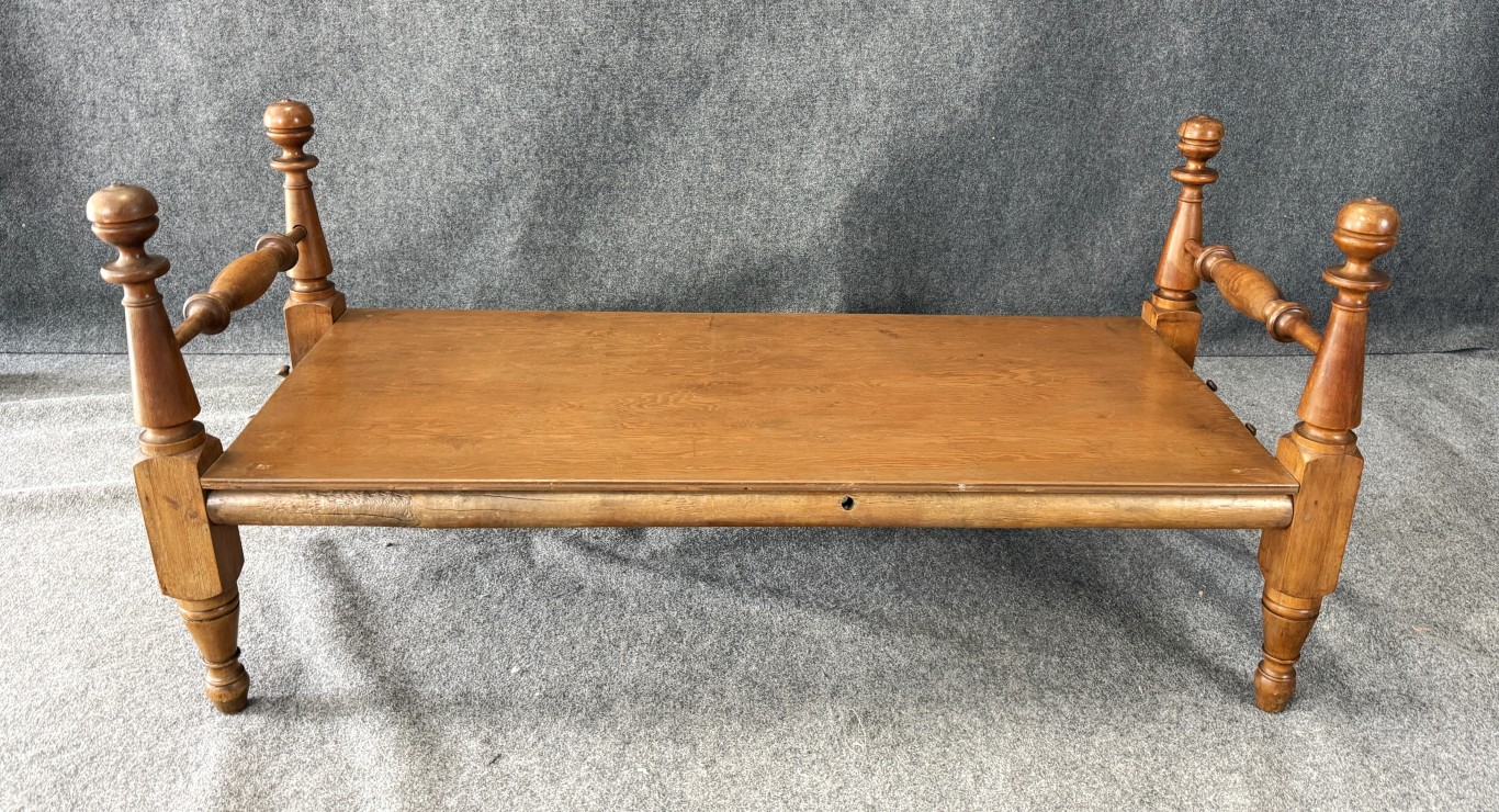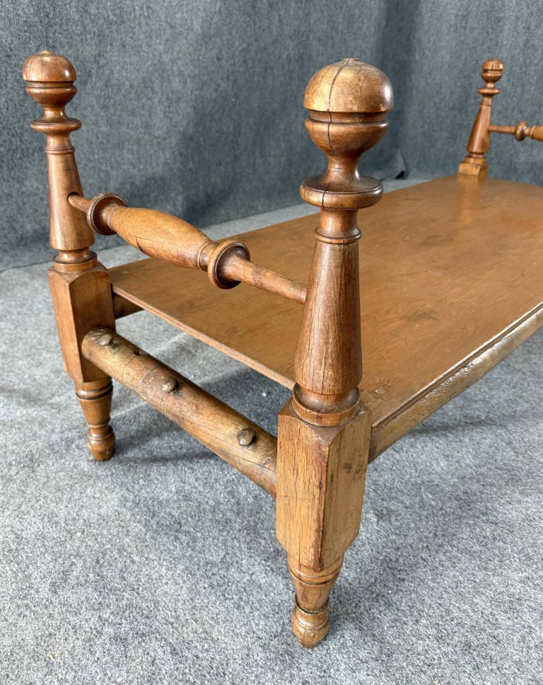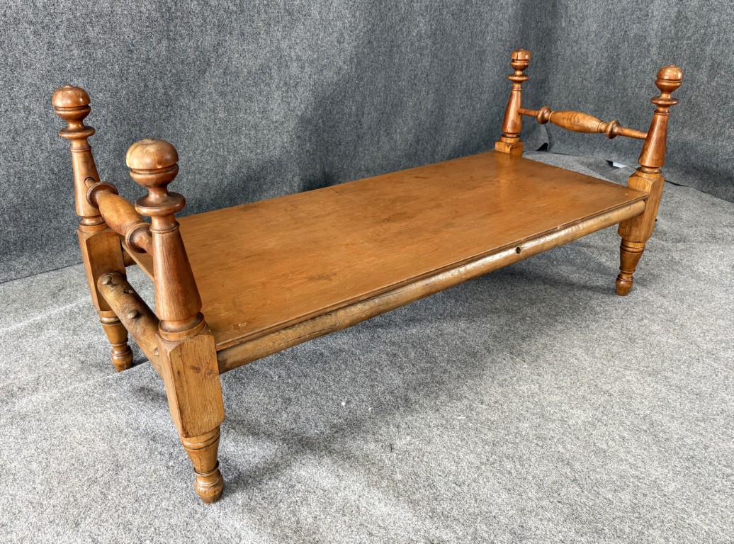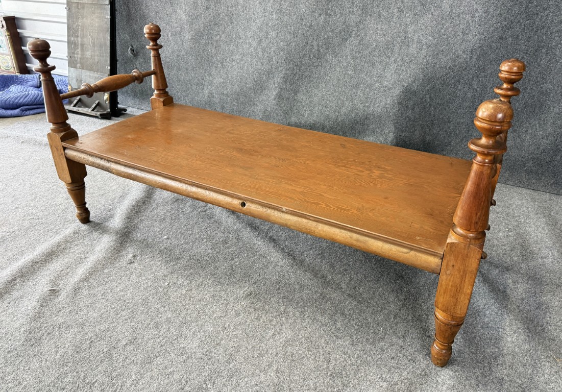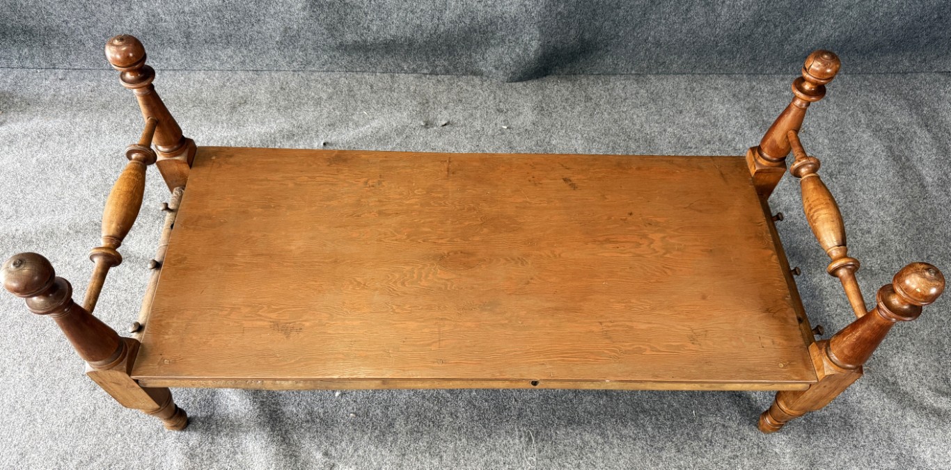 Your happiness with this item is of the utmost importance to us so please review the photographs carefully for condition. We endeavor to try and list any issues we may observe; we may not necessarily note all minor nicks and dings or we may simply miss something. Please inspect carefully to ensure your full happiness with this item. For this particular piece we found wear consistent with age and prior use, including chipped finials and a few dark spots and scratches on the bench top. Please note the tabletop was a later addition, turning this frame into a bench.