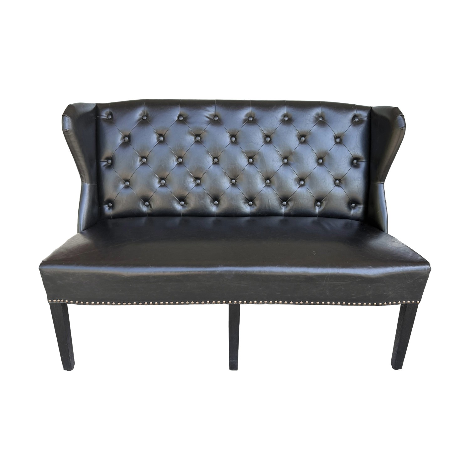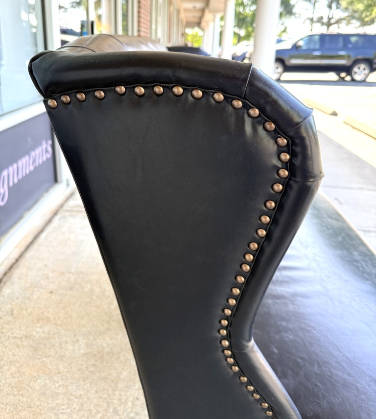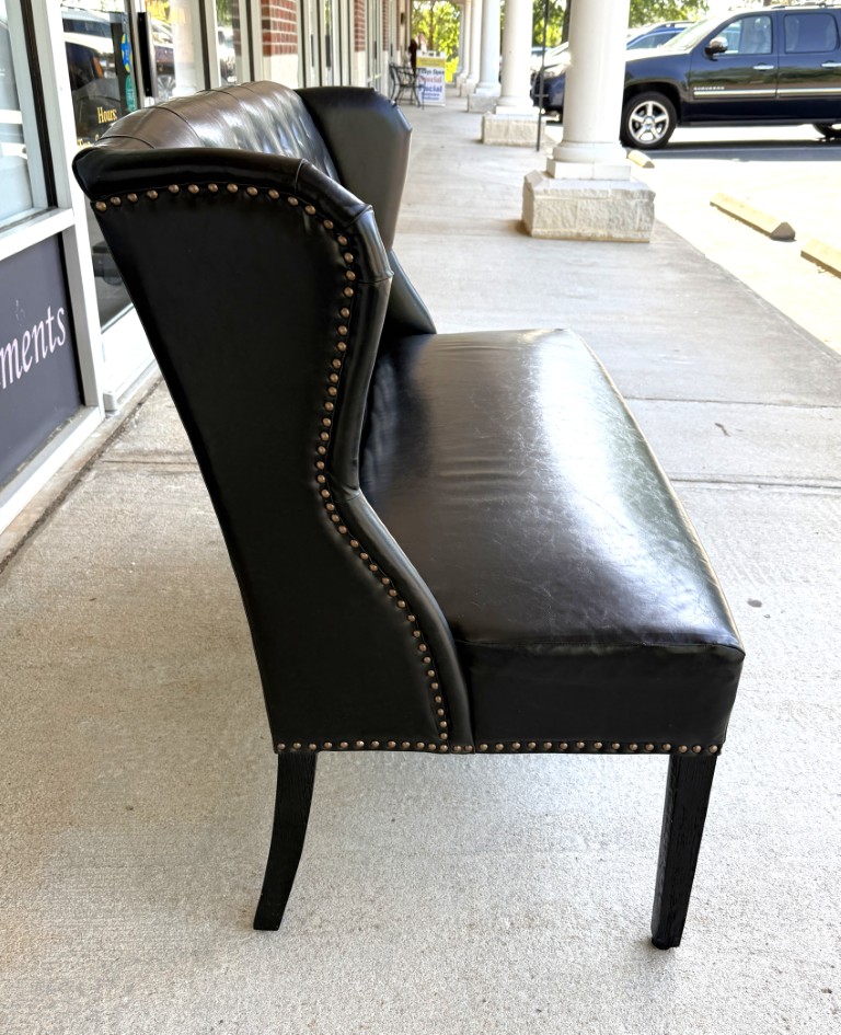 This Arhaus black tufted leather settee features a classic design with deep button tufting, wingback sides, and elegant nailhead trim for a refined, tailored look. Its sleek silhouette and rich black leather upholstery make it a sophisticated statement piece ideal for entryways, offices, or intimate seating areas. Arhaus is known for its high-end, artisan-crafted furniture, often built with premium materials and traditional techniques that emphasize both durability and timeless design.
