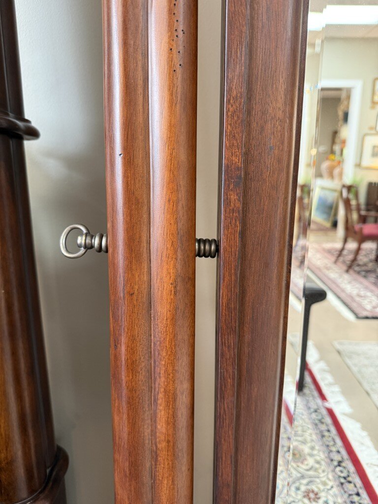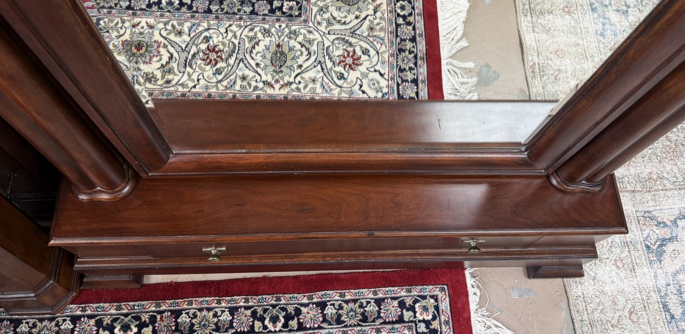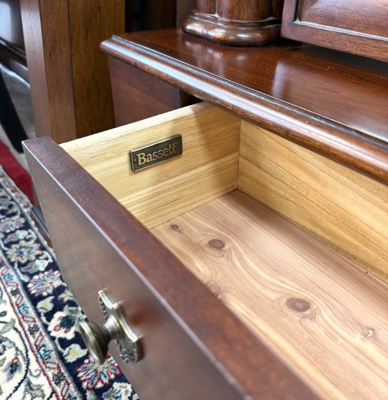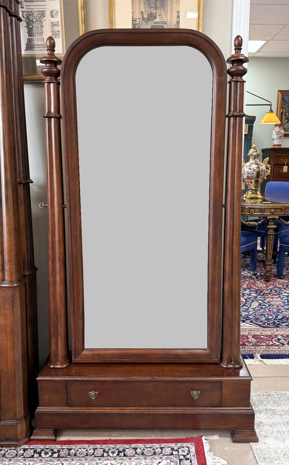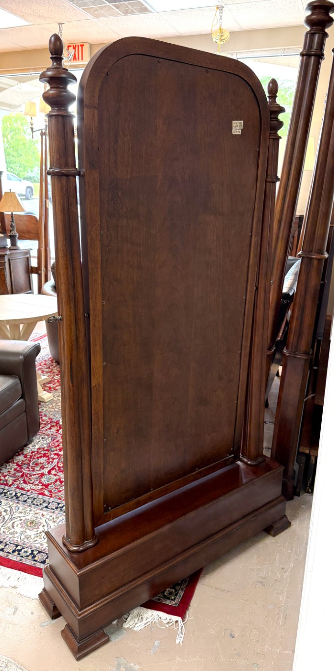 This Bassett Furniture floor mirror features a warm wood frame with turned side columns and a gracefully arched top, offering a classic, timeless presence. A built-in lower drawer provides convenient hidden storage, crafted with a clean interior and quality construction consistent with Bassett’s reputation for durable, well-made furniture.