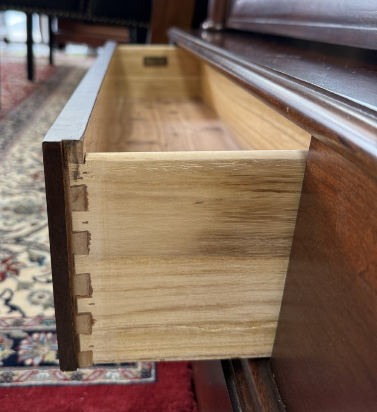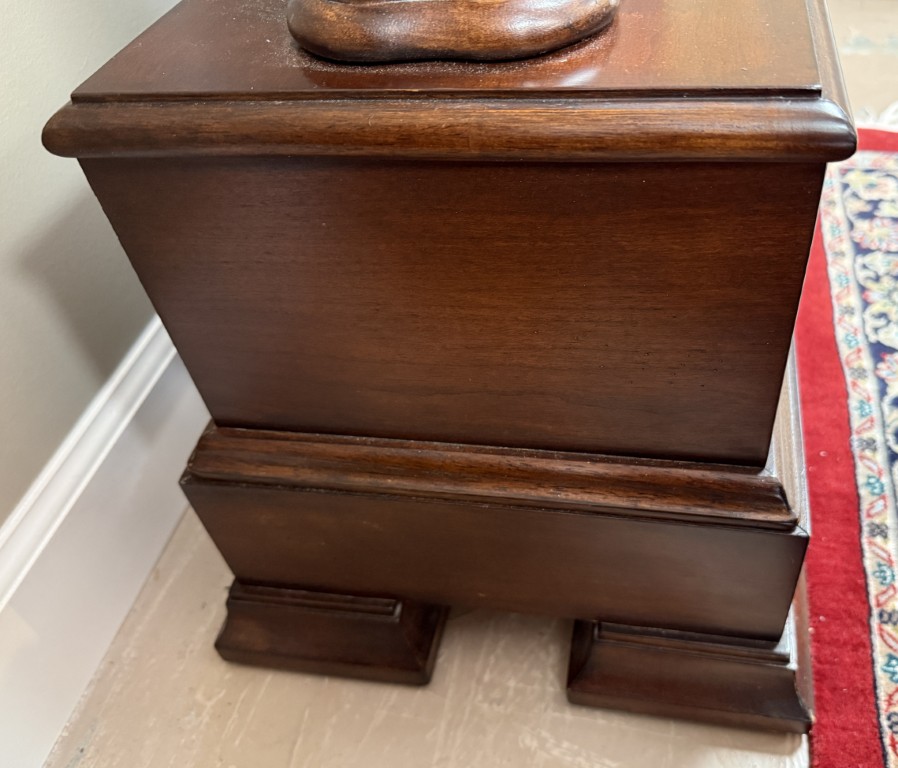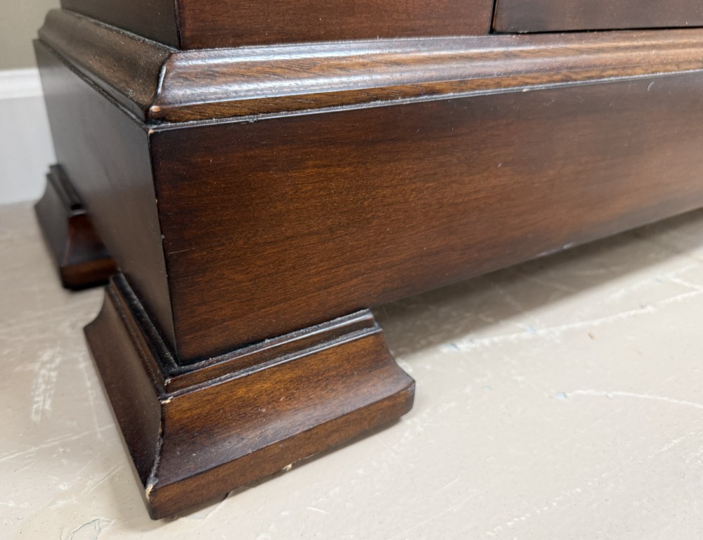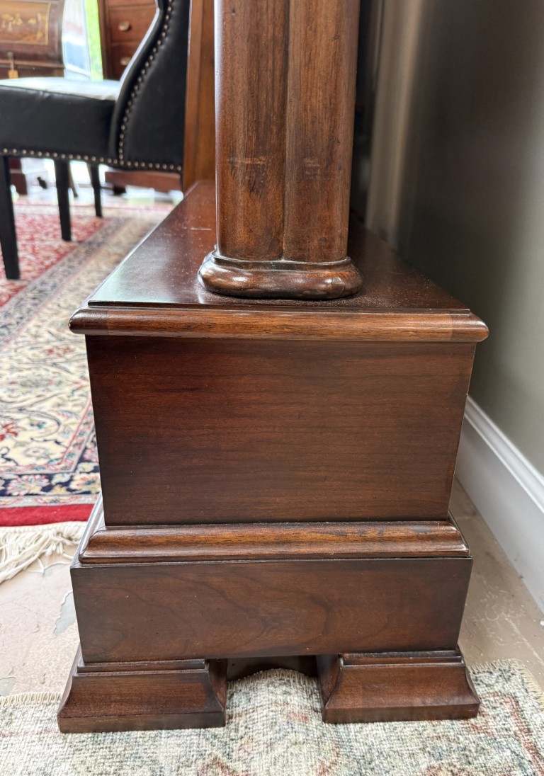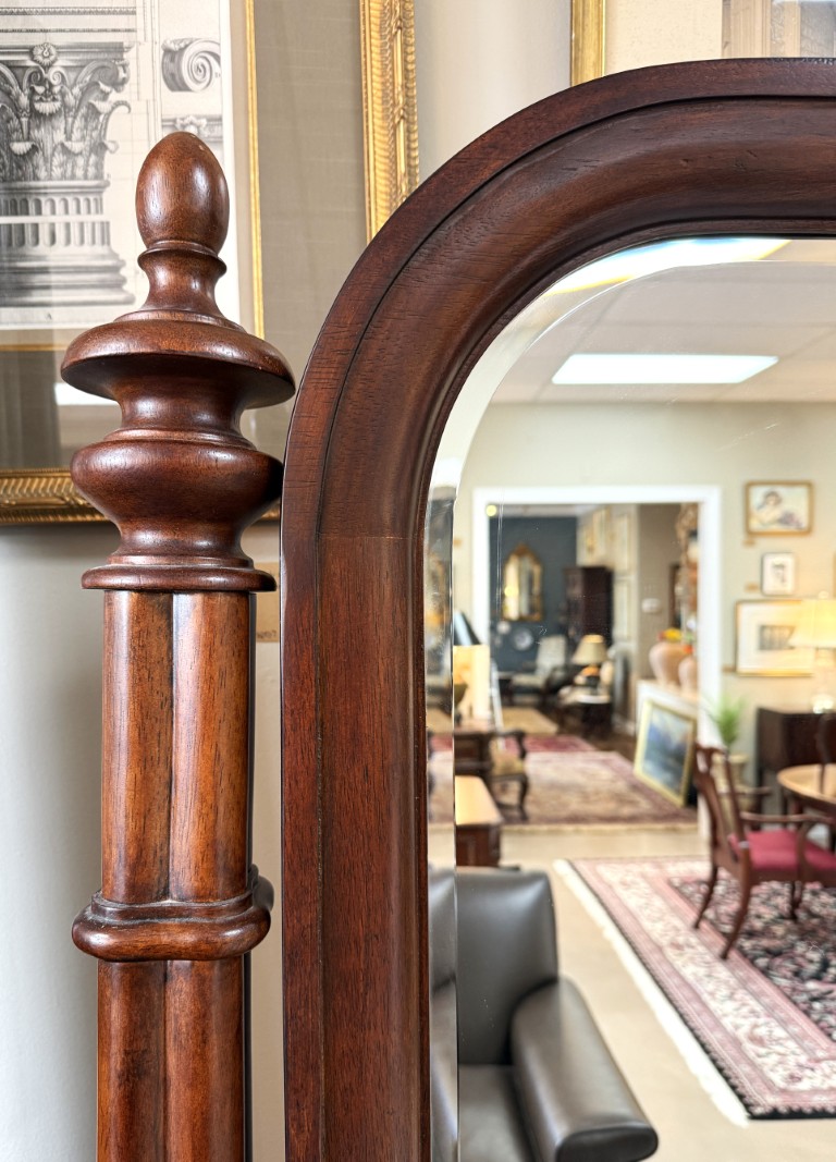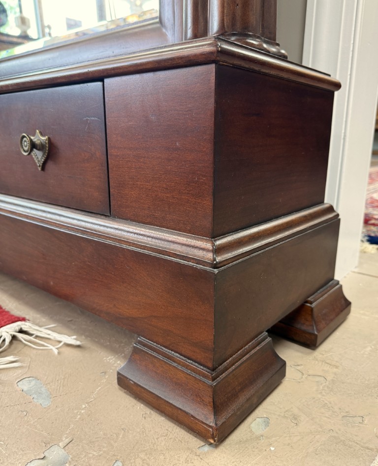 This Bassett Furniture floor mirror features a warm wood frame with turned side columns and a gracefully arched top, offering a classic, timeless presence. A built-in lower drawer provides convenient hidden storage, crafted with a clean interior and quality construction consistent with Bassett’s reputation for durable, well-made furniture.