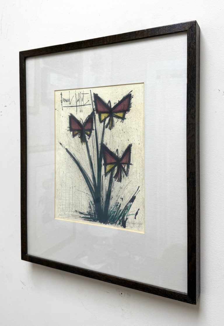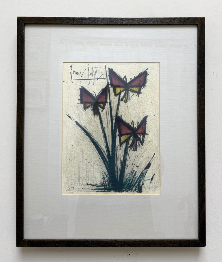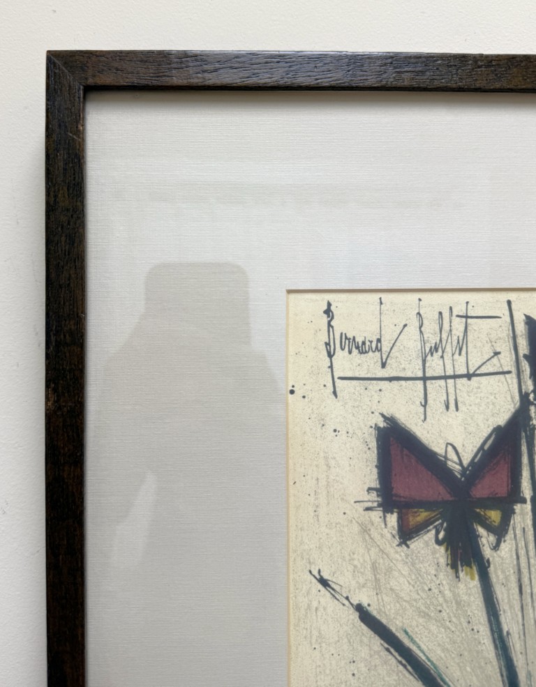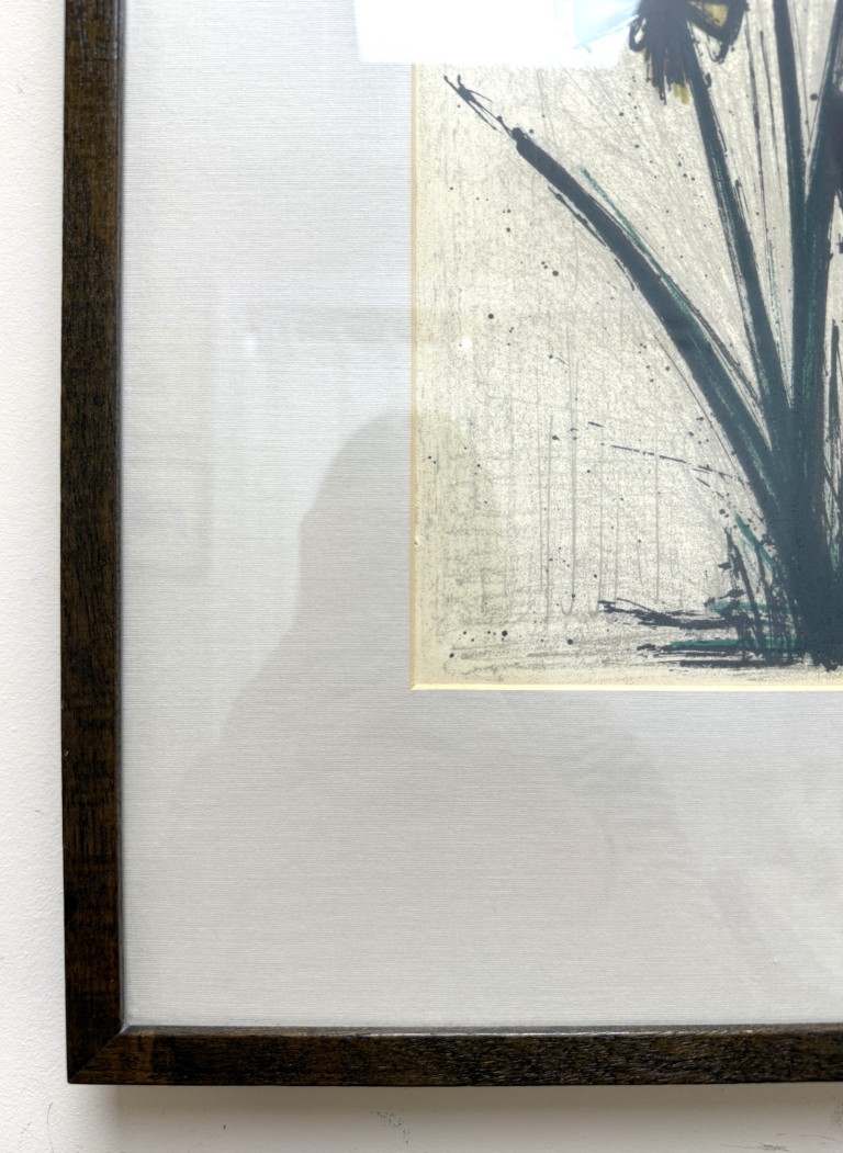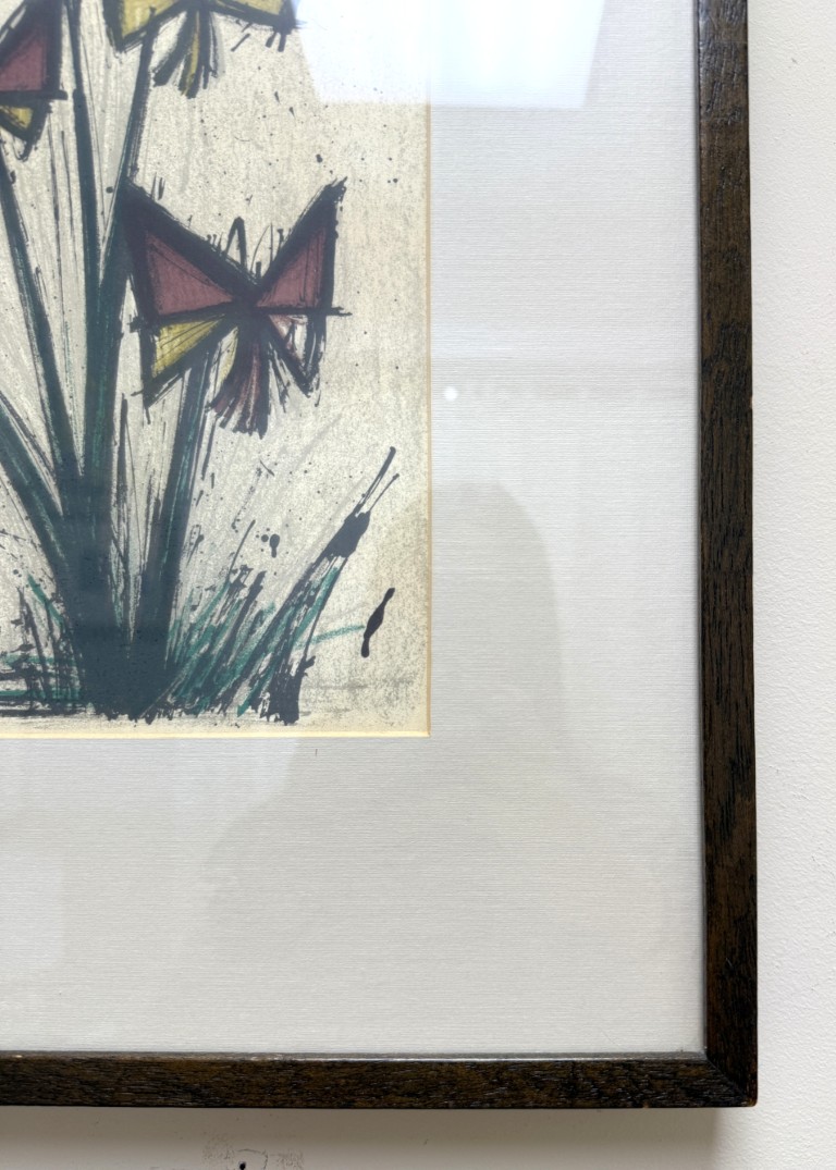 This Bernard Buffet “Pensees” mid-century lithograph features his signature angular style, depicting abstracted blossoms in bold red and yellow hues that convey both vitality and restraint in his distinct modernist hand. Born in Paris in 1928, Buffet rose to prominence as one of France’s leading post-war artists, celebrated for his distinctive linear style and emotional precision. His works, which have achieved multimillion-dollar auction results, remain enduring symbols of 20th-century modernism. Even his lithographs have seen strong results with one print, Circus Dancer, selling for £86,080 in 2012.