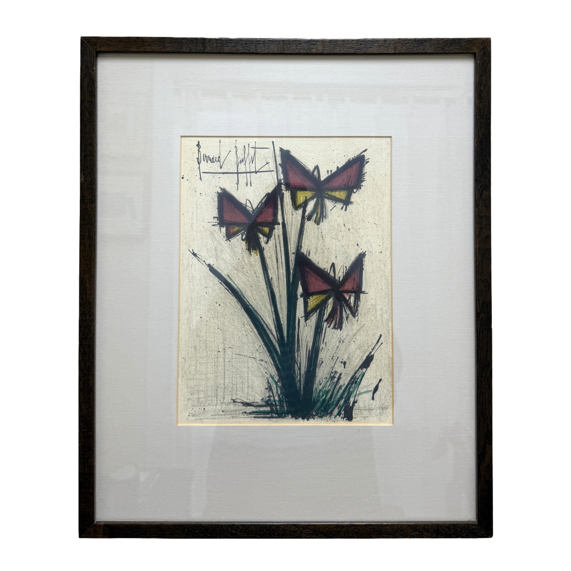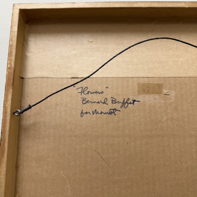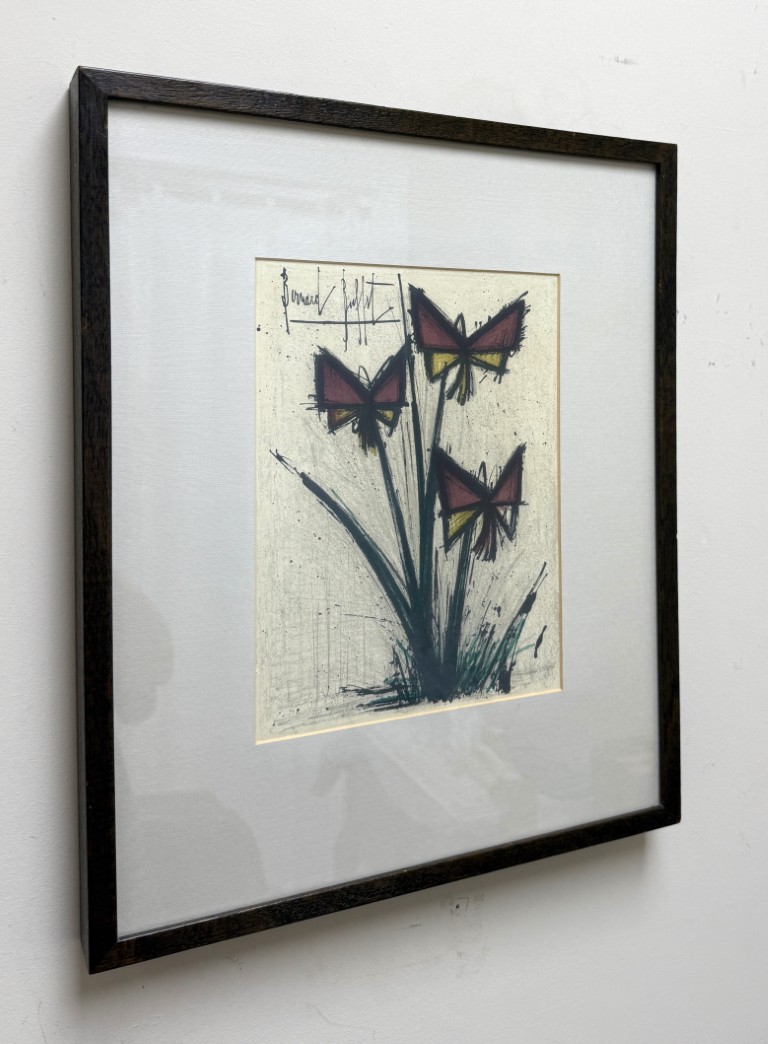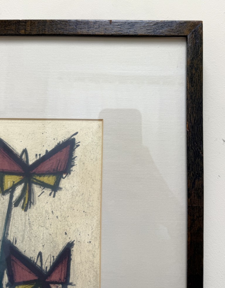 This Bernard Buffet “Pensees” mid-century lithograph features his signature angular style, depicting abstracted blossoms in bold red and yellow hues that convey both vitality and restraint in his distinct modernist hand. Born in Paris in 1928, Buffet rose to prominence as one of France’s leading post-war artists, celebrated for his distinctive linear style and emotional precision. His works, which have achieved multimillion-dollar auction results, remain enduring symbols of 20th-century modernism. Even his lithographs have seen strong results with one print, Circus Dancer, selling for £86,080 in 2012.