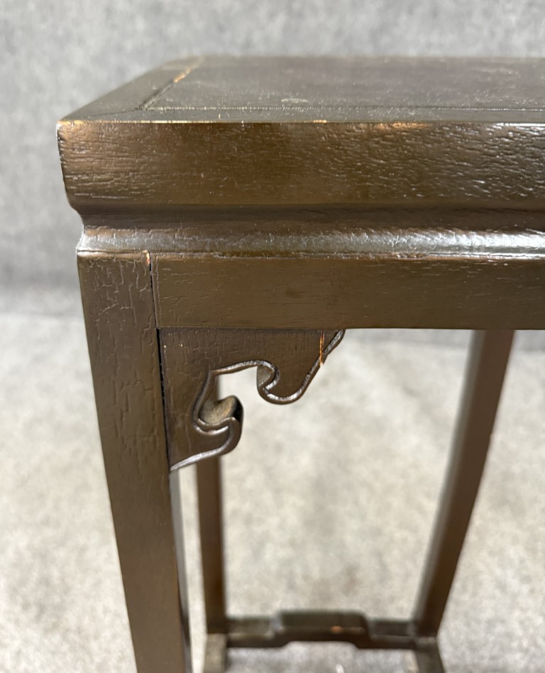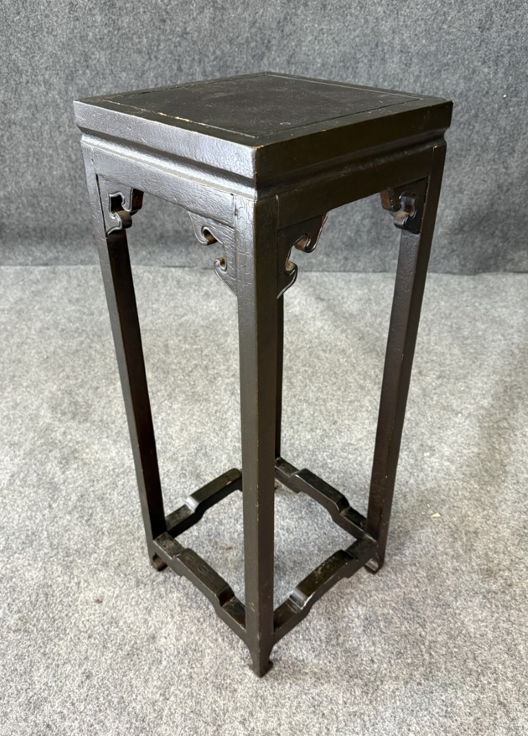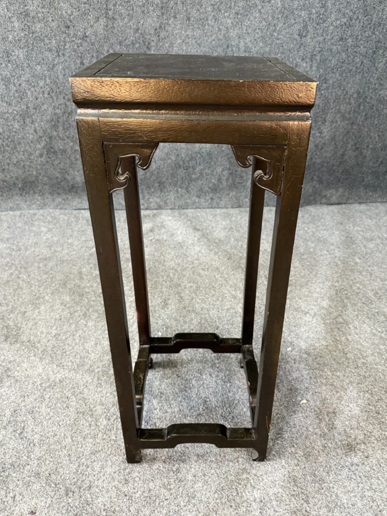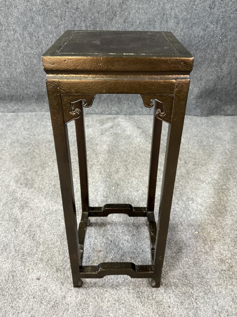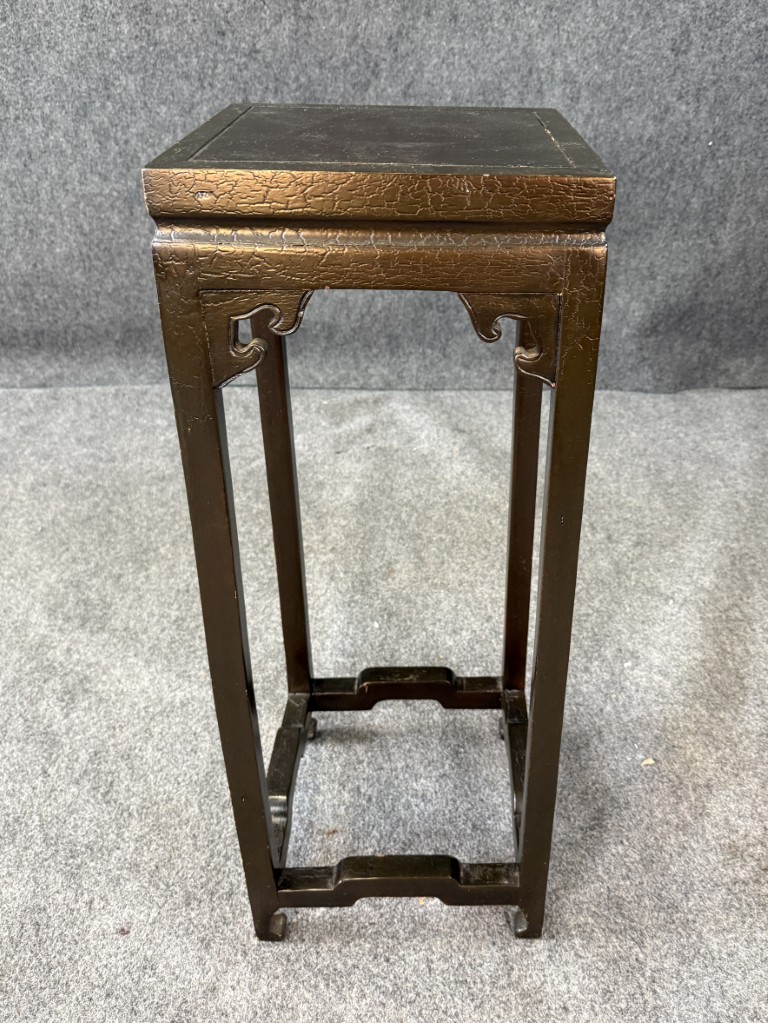Black Lacquered Asian Pedestal / Plant Stand with crackle detail on top.
