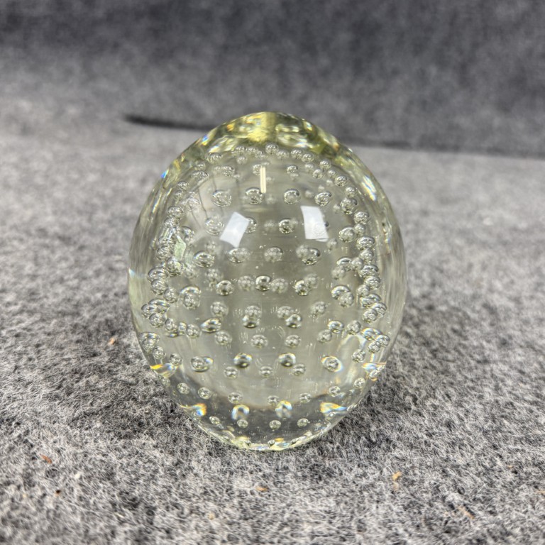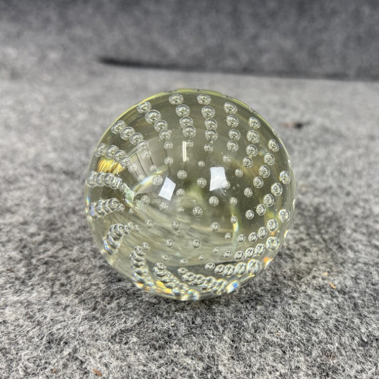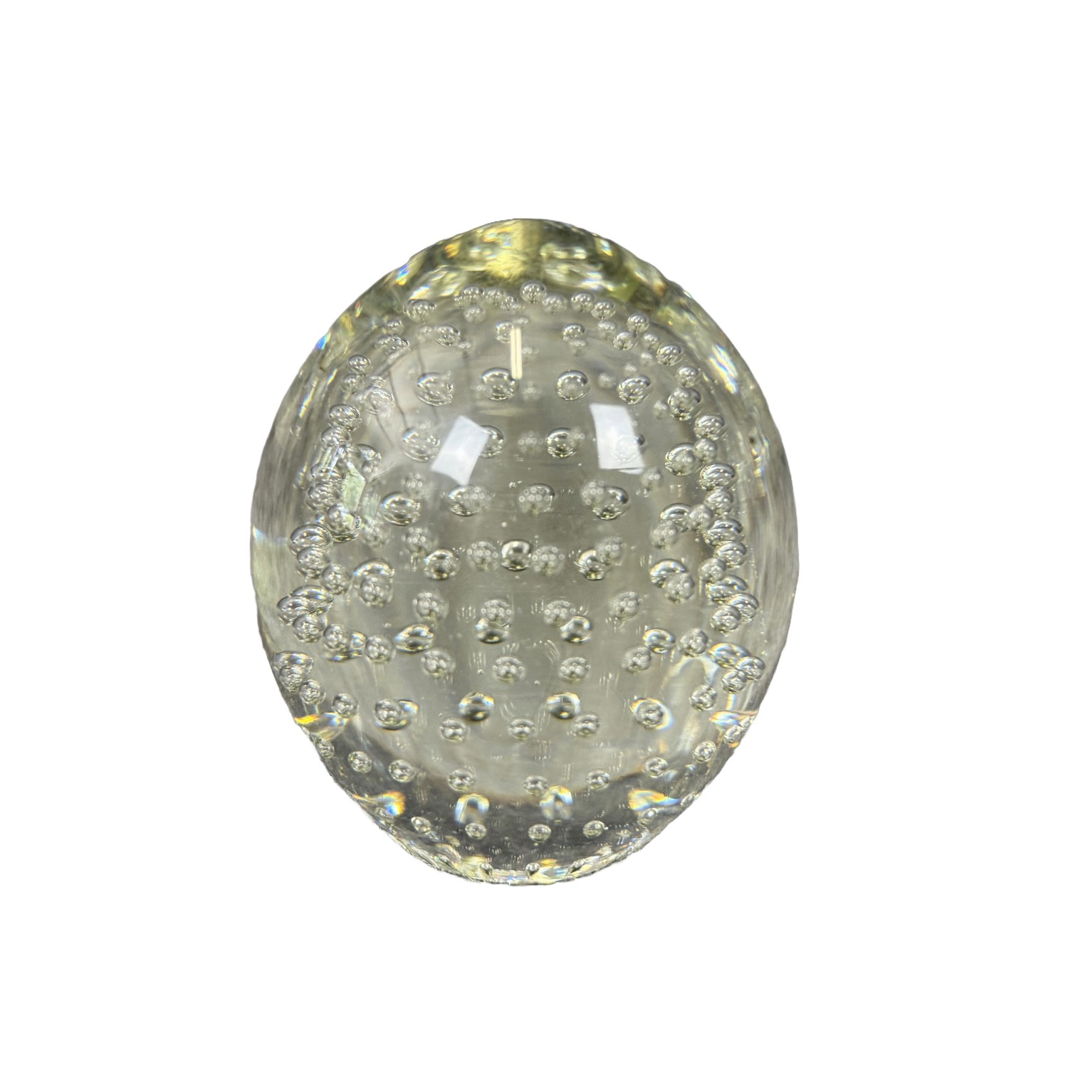 This blown glass paperweight features a clear, rounded form filled with delicately suspended air bubbles that create a mesmerizing, floating effect when viewed from any angle.
