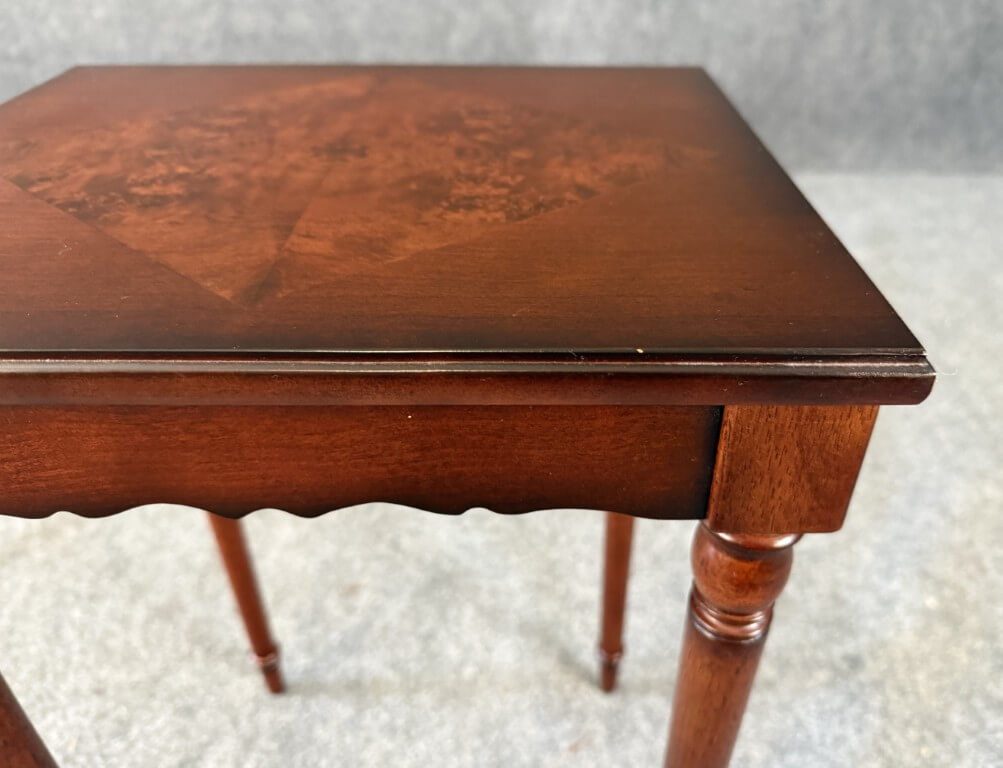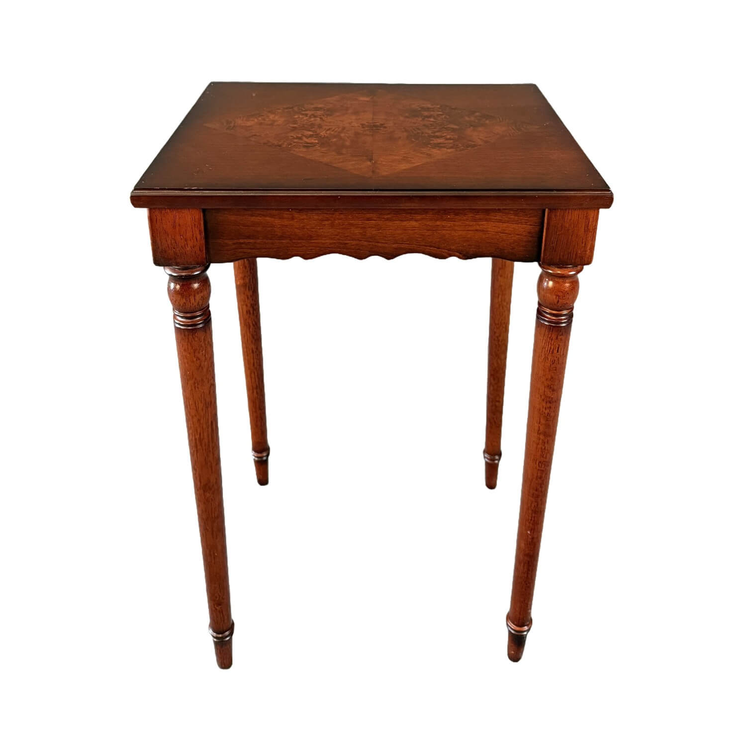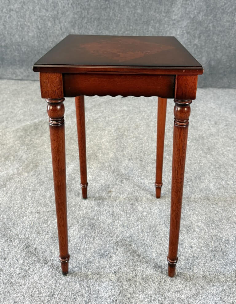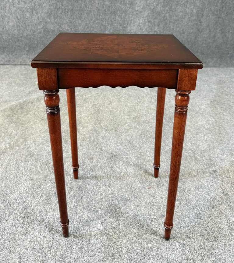 This Bombay book table features a richly toned wood finish highlighted by a striking burled wood inlay set in a diamond pattern across the top, creating elegant visual contrast. Slender turned legs and a scalloped apron lend the piece a graceful, traditional silhouette well suited for use beside a chair or sofa.