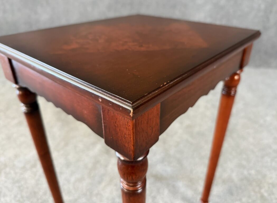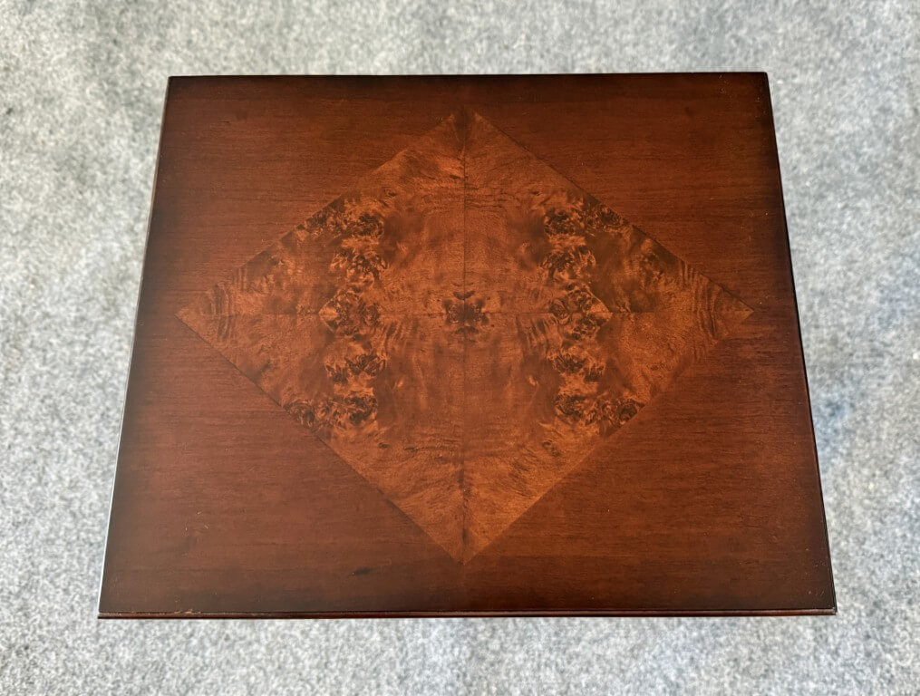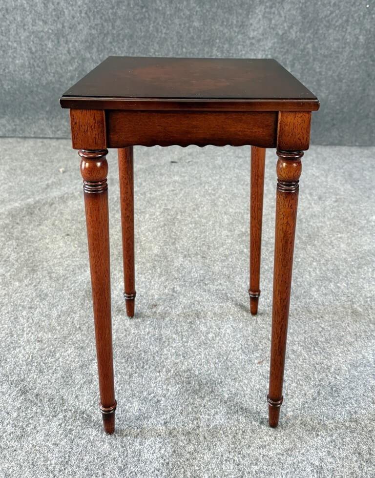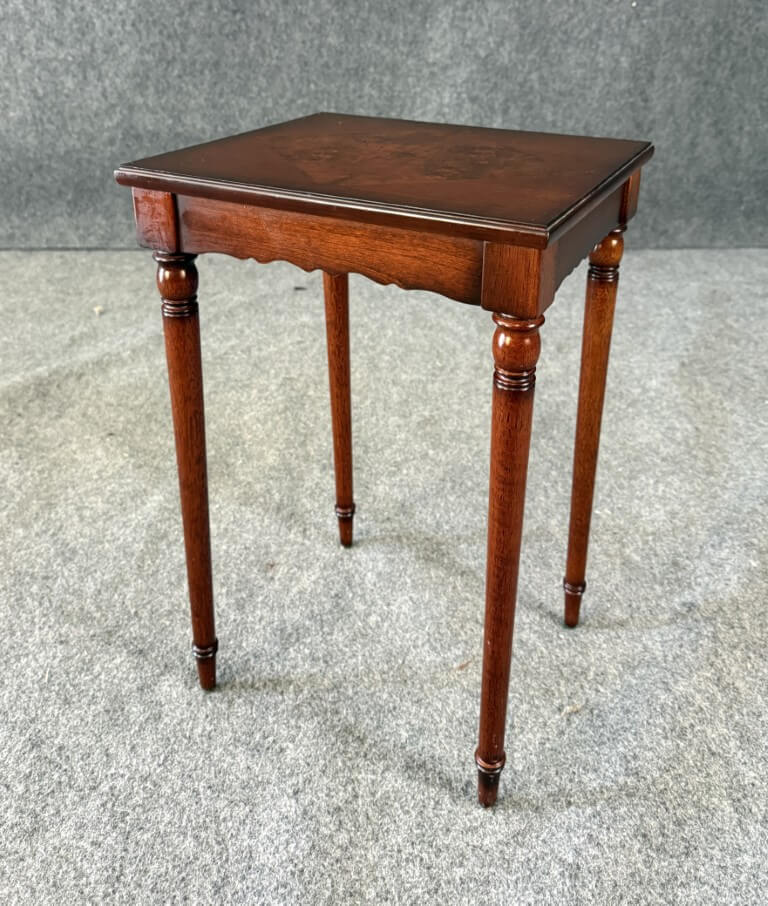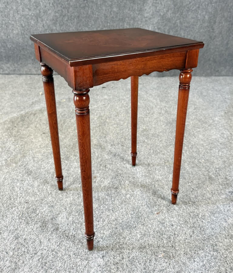 This Bombay book table features a richly toned wood finish highlighted by a striking burled wood inlay set in a diamond pattern across the top, creating elegant visual contrast. Slender turned legs and a scalloped apron lend the piece a graceful, traditional silhouette well suited for use beside a chair or sofa.