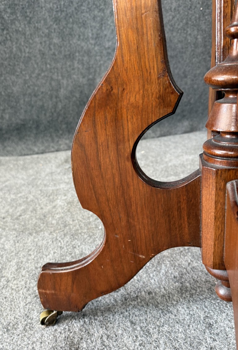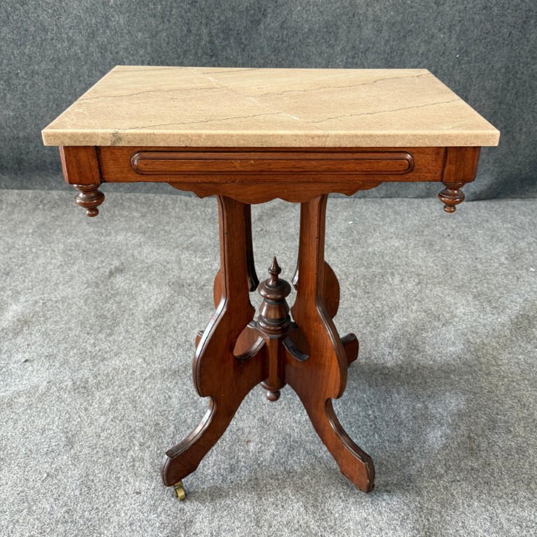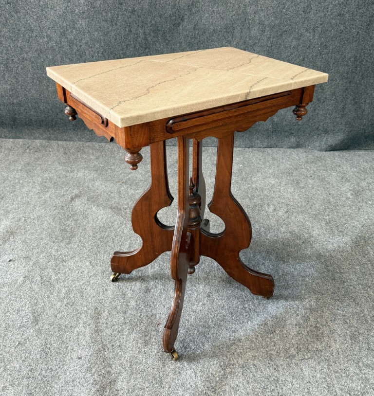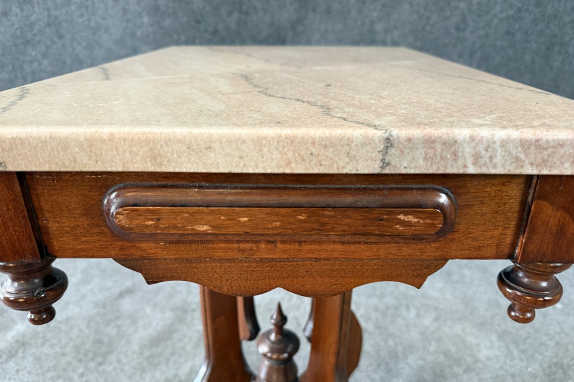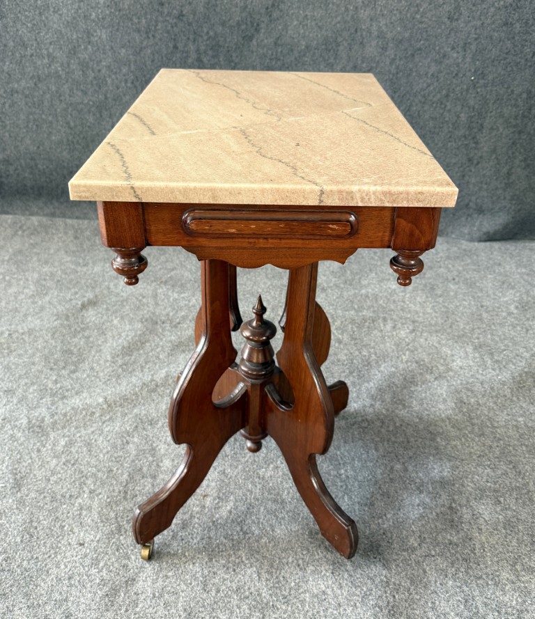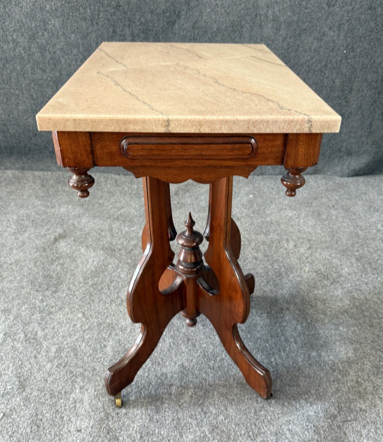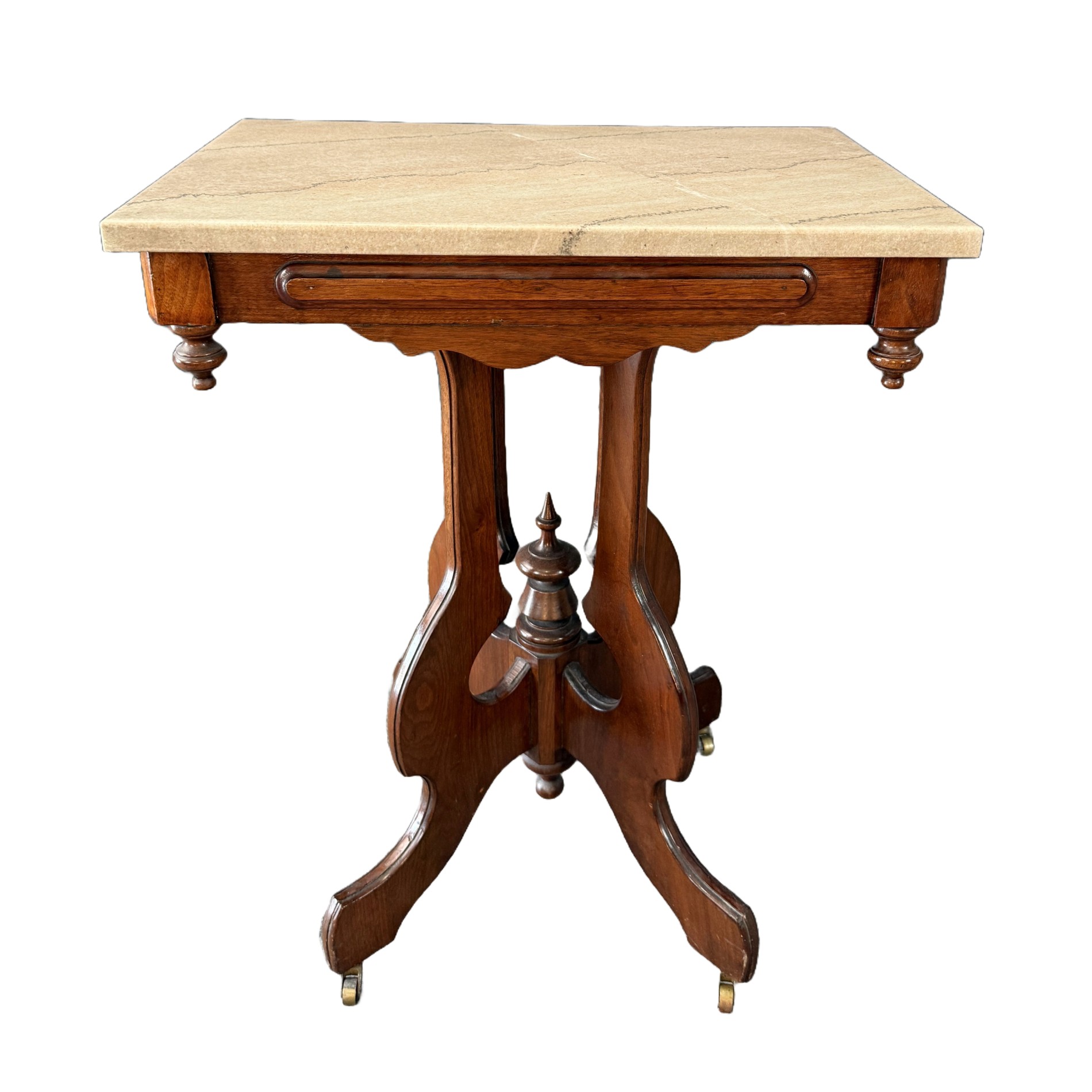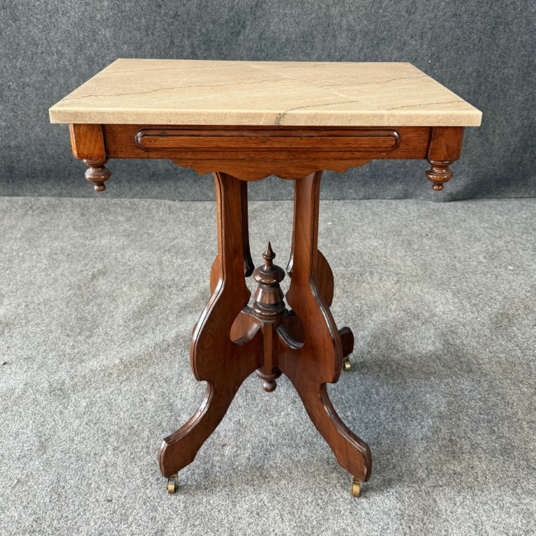 This c1880 marble top side table features a warm-toned marble surface with natural veining, resting on an ornate walnut base with turned finials and shaped legs. Its elegant design, complete with original brass casters, makes it both a decorative and functional piece for any antique-inspired space.