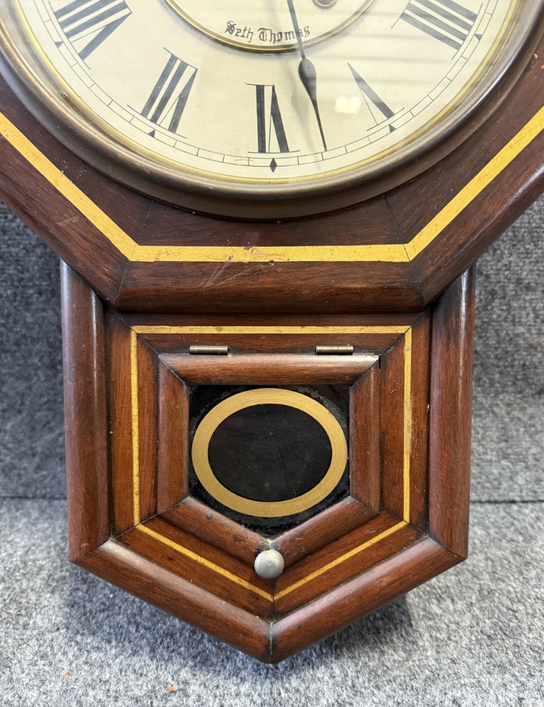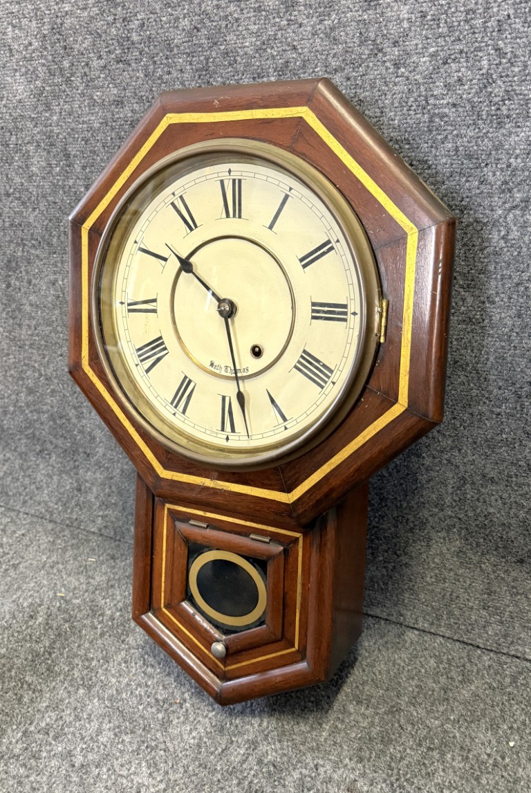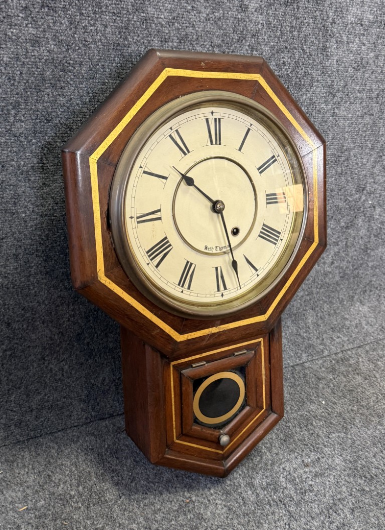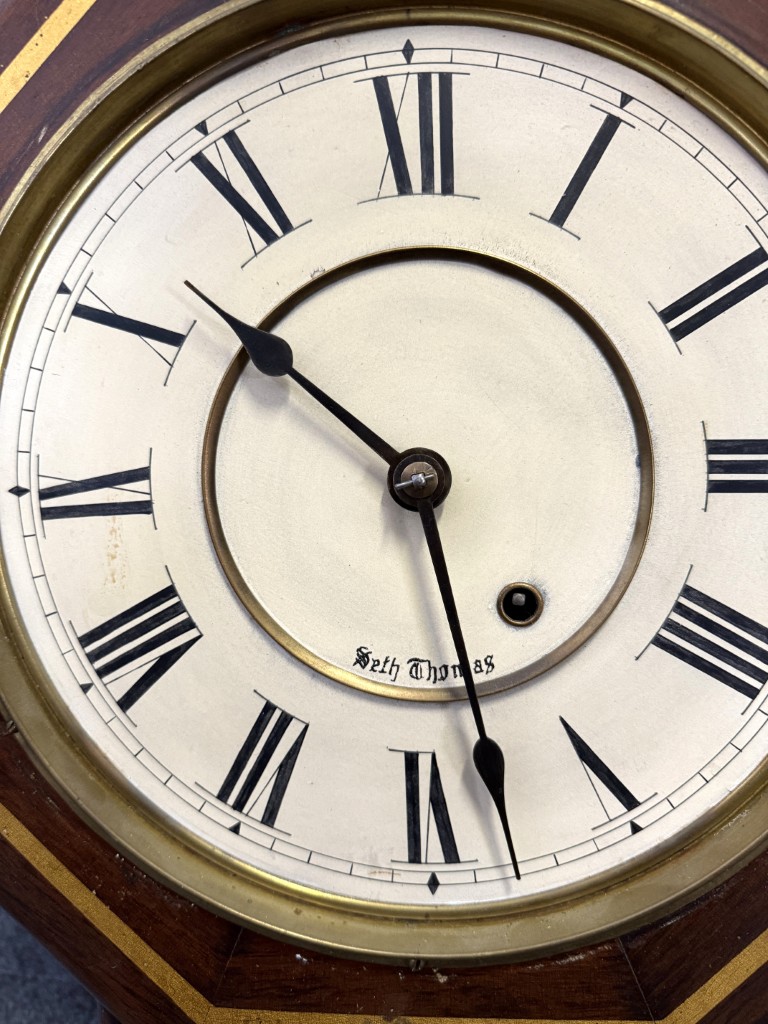 This c1900 Seth Thomas mahogany wall clock features an octagonal case with inlaid detailing, a lower glass pendulum window, and a dial with Roman numerals. Retaining its original mechanism, it remains a functional timepiece that reflects the enduring quality of Seth Thomas craftsmanship.