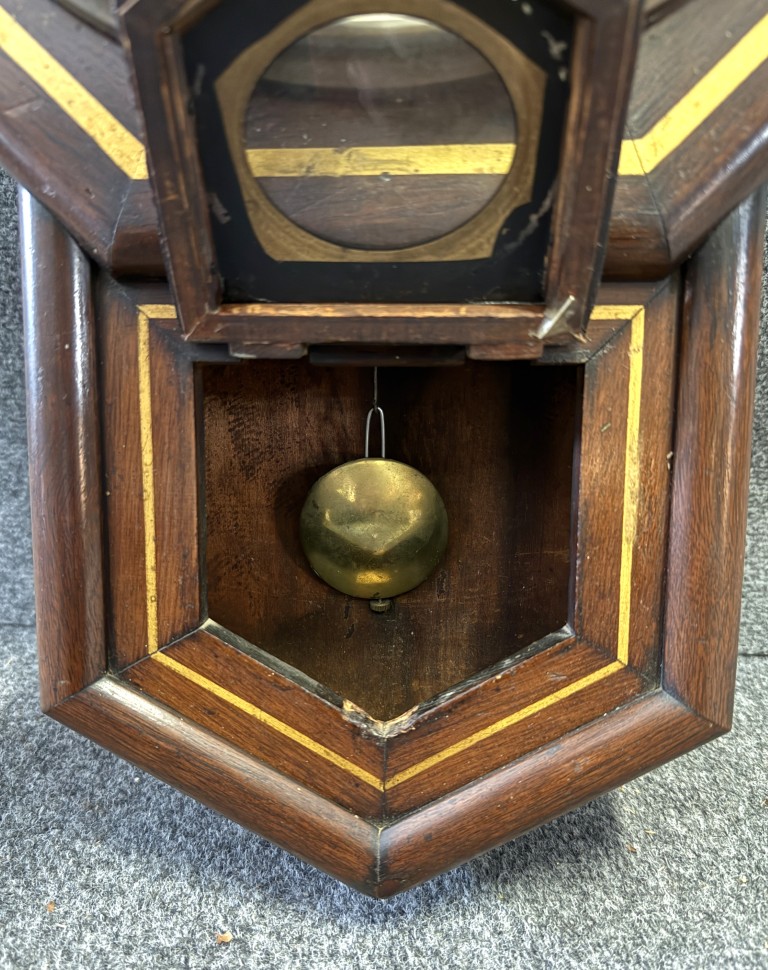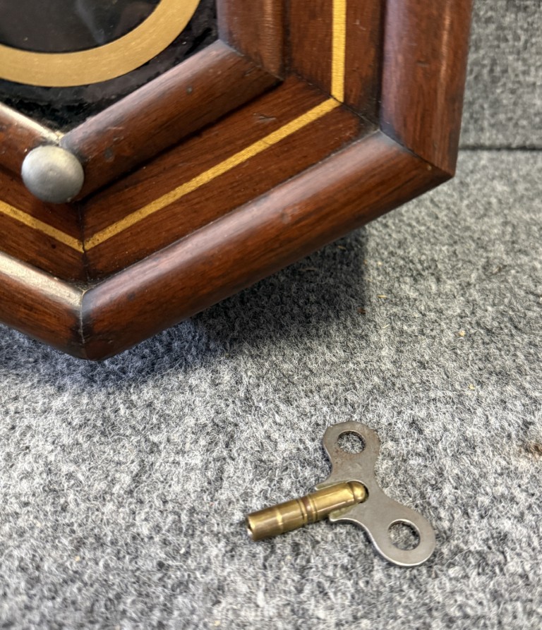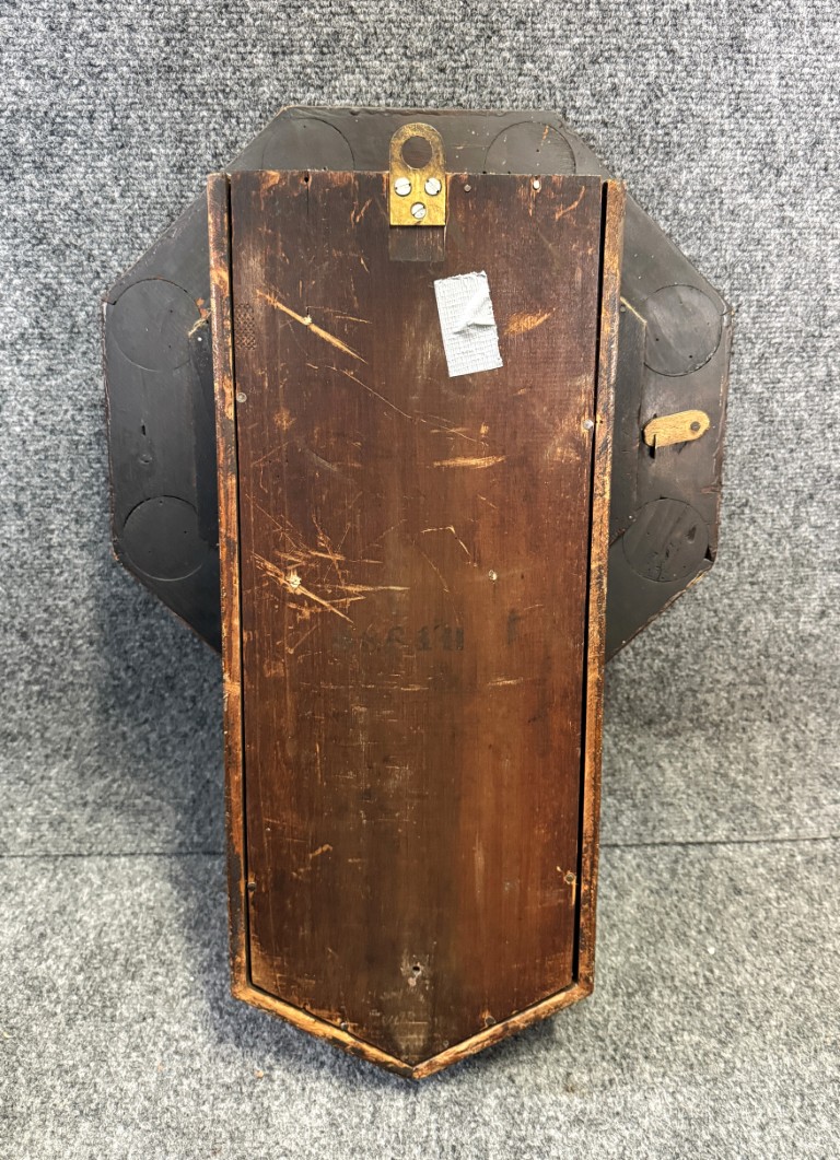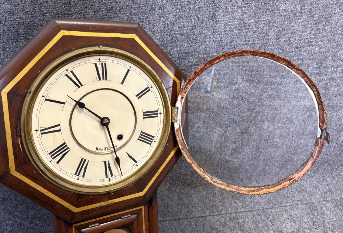 This c1900 Seth Thomas mahogany wall clock features an octagonal case with inlaid detailing, a lower glass pendulum window, and a dial with Roman numerals. Retaining its original mechanism, it remains a functional timepiece that reflects the enduring quality of Seth Thomas craftsmanship.