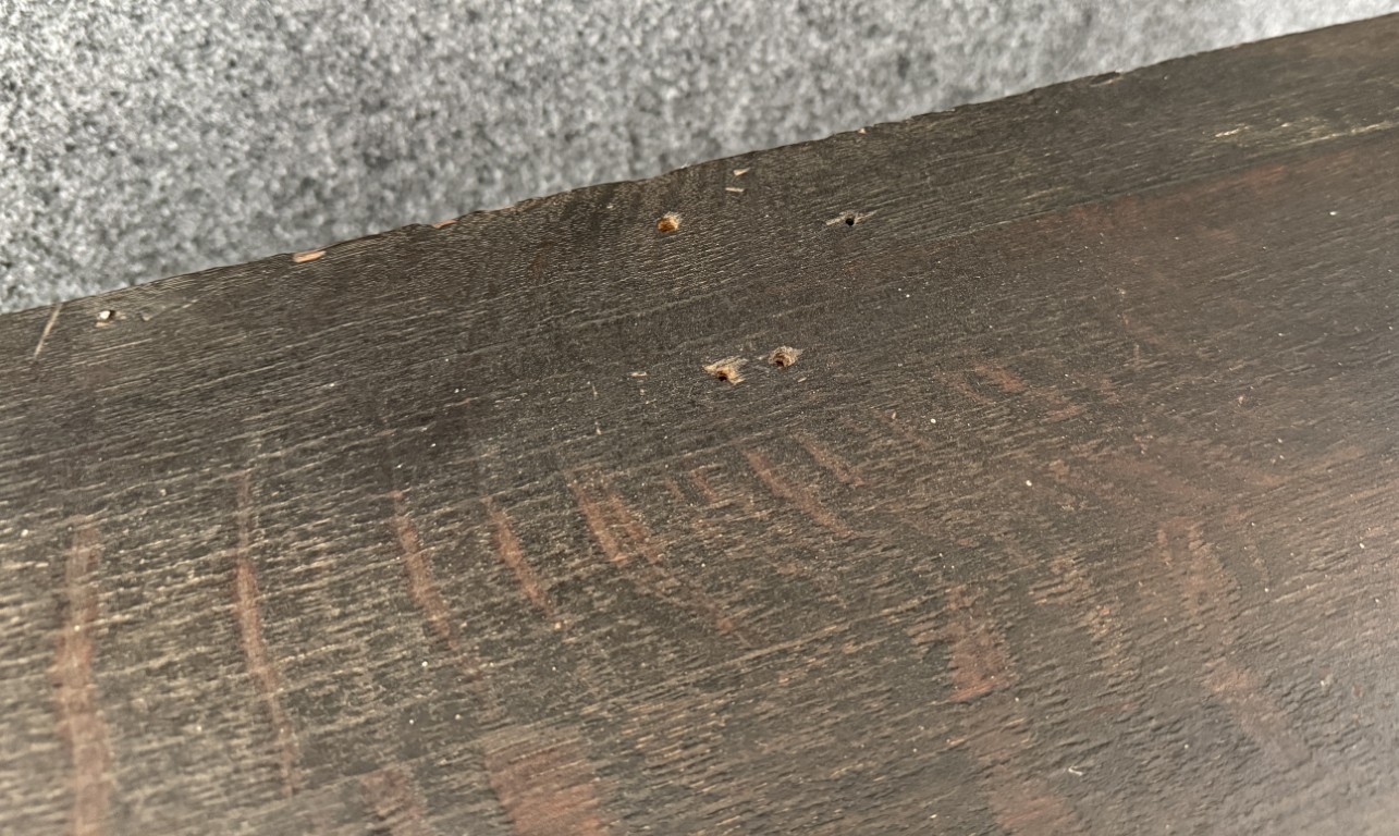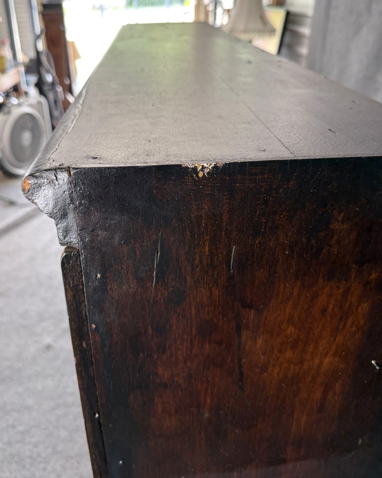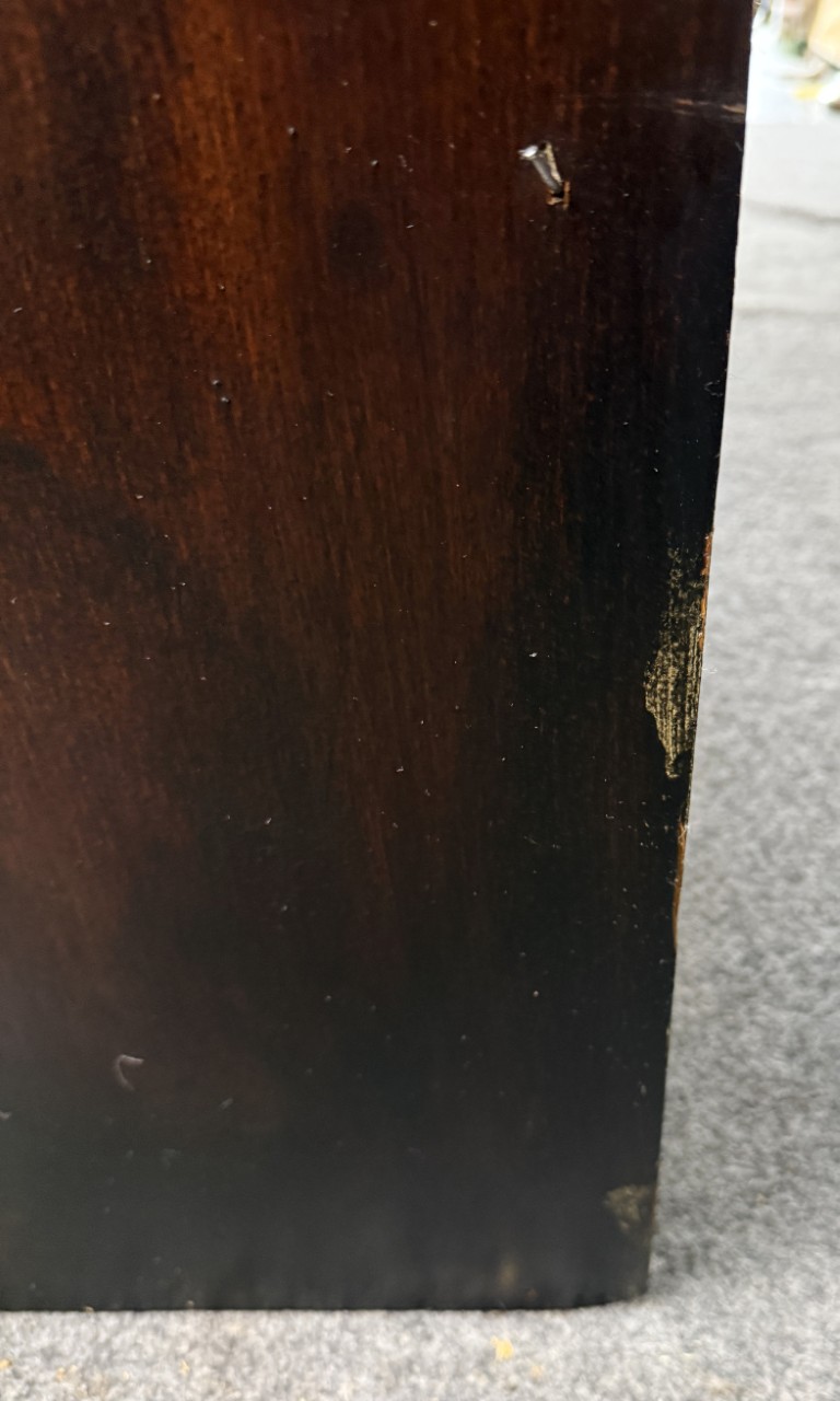Your happiness with this item is of the utmost importance to us so please review the photographs carefully for condition. We endeavor to try and list any issues we may observe; we may not necessarily note all minor nicks and dings or we may simply miss something. Please inspect carefully to ensure your full happiness with this item. For this particular piece we found minor wear consistent with age and prior use, including missing molding to top left corner, cracking veneer on bottom left side, discoloration to front base molding, and multiple nail holes on top.