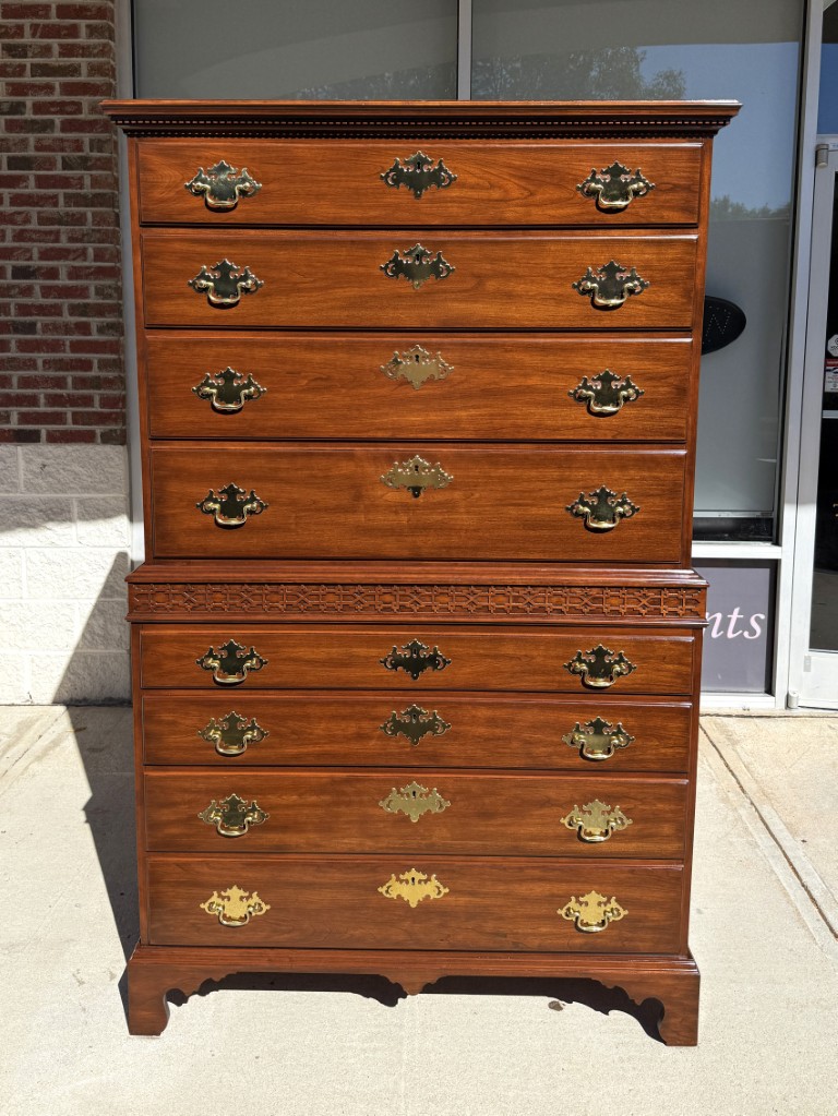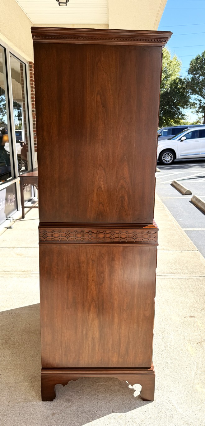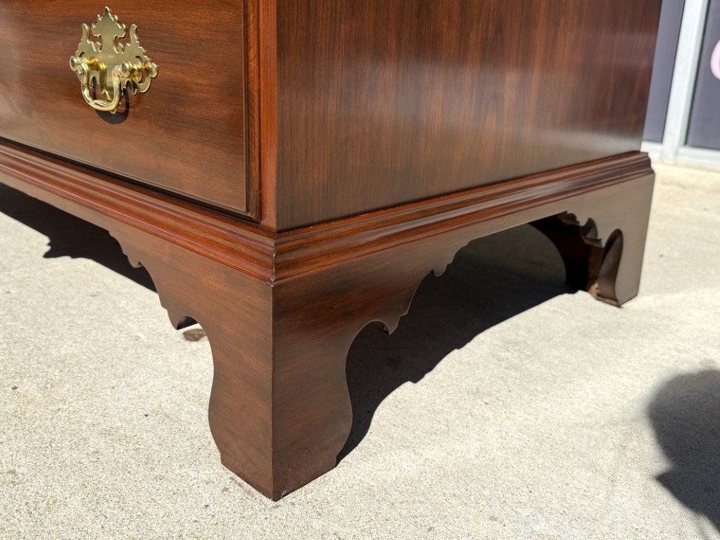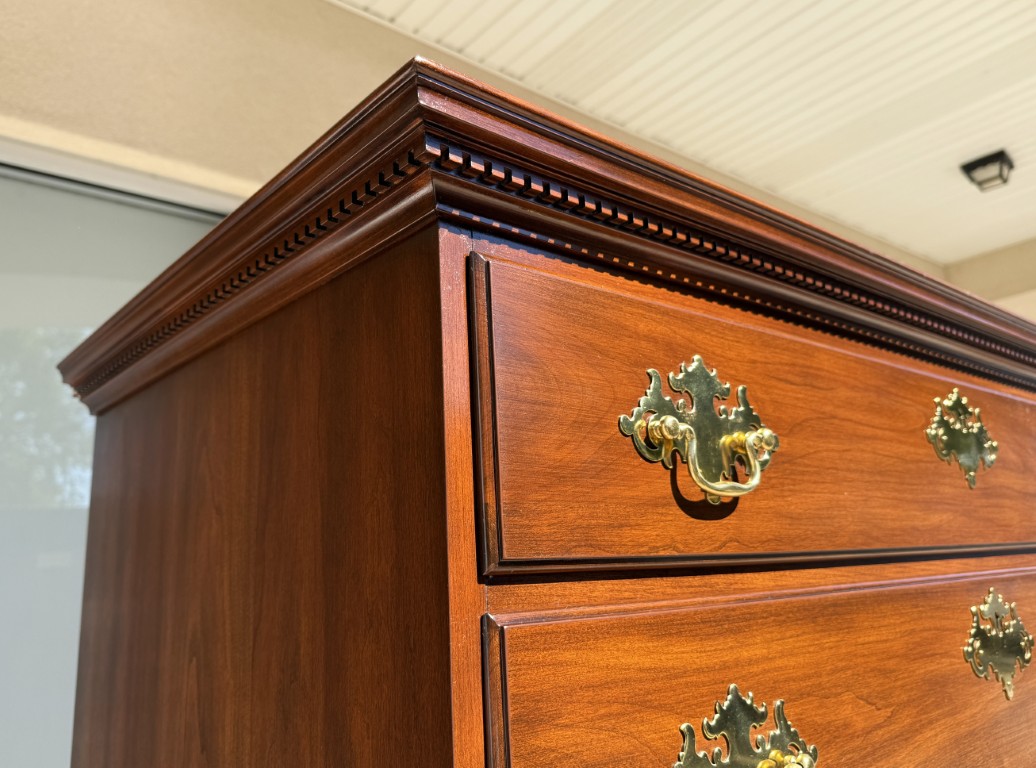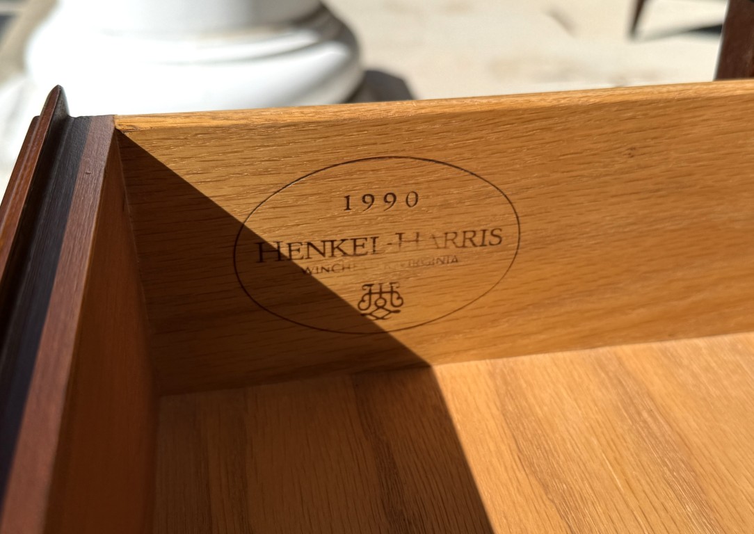 This c1990 Henkel Harris Solid Cherry Chest of Drawers, Model No. 177, exemplifies the brand’s signature craftsmanship and timeless Colonial Revival styling. Constructed of solid wild black cherry, it features dovetailed drawers with solid brass Chippendale-style hardware and a hand-carved dentil molding along the crown. Finished in Henkel Harris’s rich, warm cherry tone, this piece remains in production today, underscoring its enduring appeal and heirloom quality.