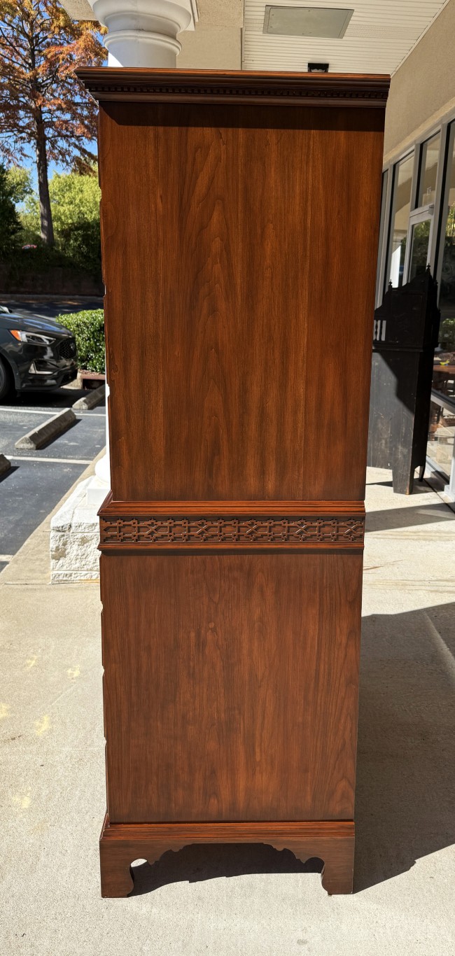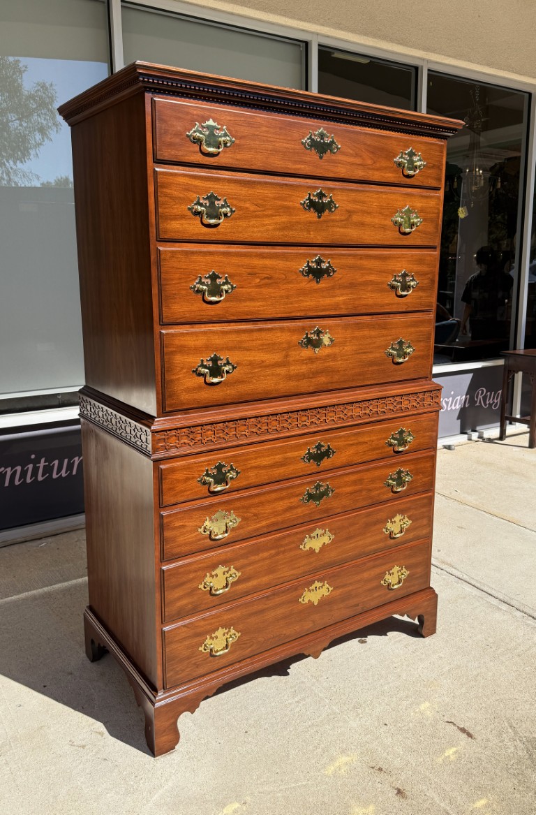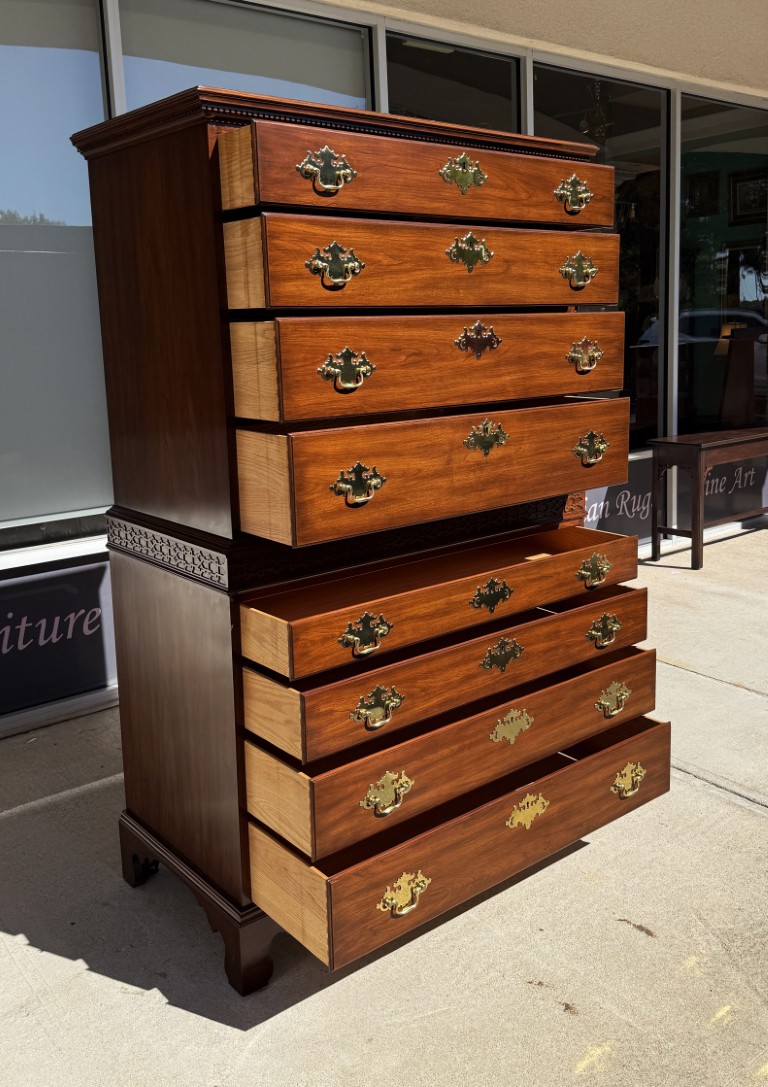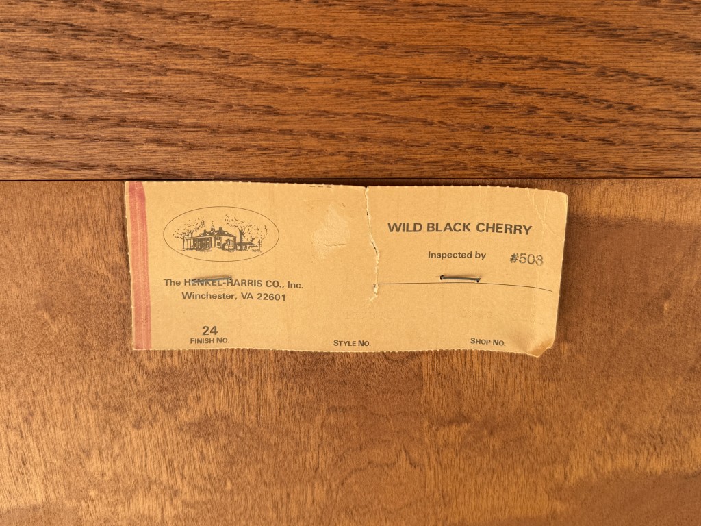 This c1990 Henkel Harris Solid Cherry Chest of Drawers, Model No. 177, exemplifies the brand’s signature craftsmanship and timeless Colonial Revival styling. Constructed of solid wild black cherry, it features dovetailed drawers with solid brass Chippendale-style hardware and a hand-carved dentil molding along the crown. Finished in Henkel Harris’s rich, warm cherry tone, this piece remains in production today, underscoring its enduring appeal and heirloom quality.