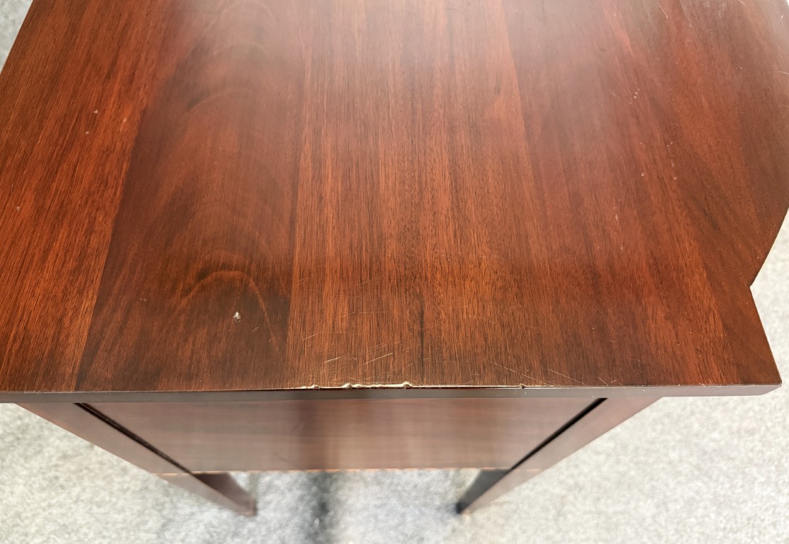 Your happiness with this item is of the utmost importance to us so please review the photographs carefully for condition. We endeavor to try and list any issues we may observe; we may not necessarily note all minor nicks and dings or we may simply miss something. Please inspect carefully to ensure your full happiness with this item. For this piece, we found minor wear consistent with age and use, including some deeper scratches on the left side that do not expose unfinished wood. There are small nicks and scuffs on the feet, as well as light surface scratches on the top, with a few deeper marks. Most of these imperfections are not very noticeable unless viewed in the reflection of light.