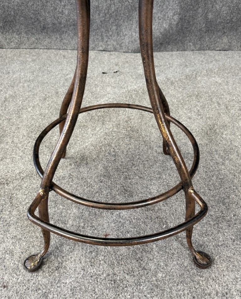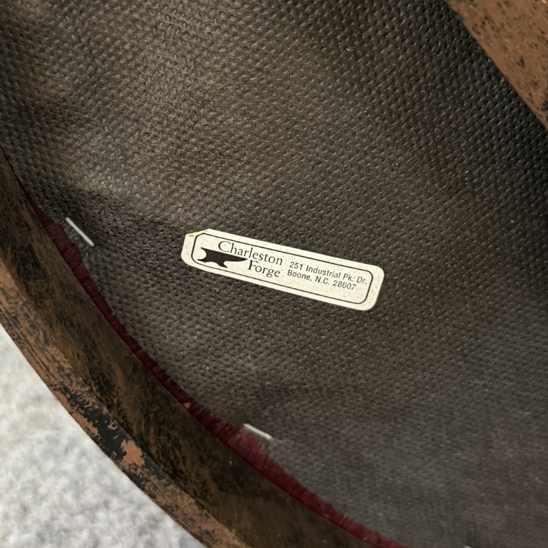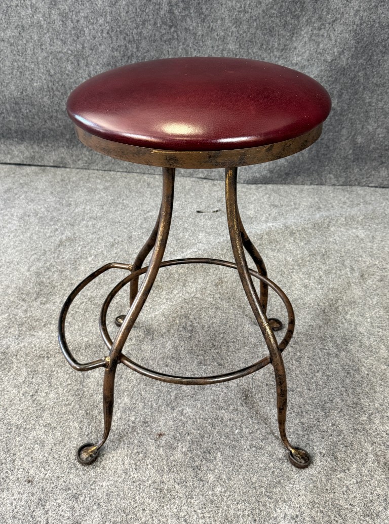 This Charleston Forge Leather and Iron Stool features a hand-forged iron frame with gracefully curved legs and a rich bronze finish, complemented by a smooth burgundy leather seat. Its sturdy design and artisanal craftsmanship combine industrial character with refined comfort. Charleston Forge, based in Boone, North Carolina, is renowned for its American-made, handcrafted furniture that merges timeless design with durable quality.