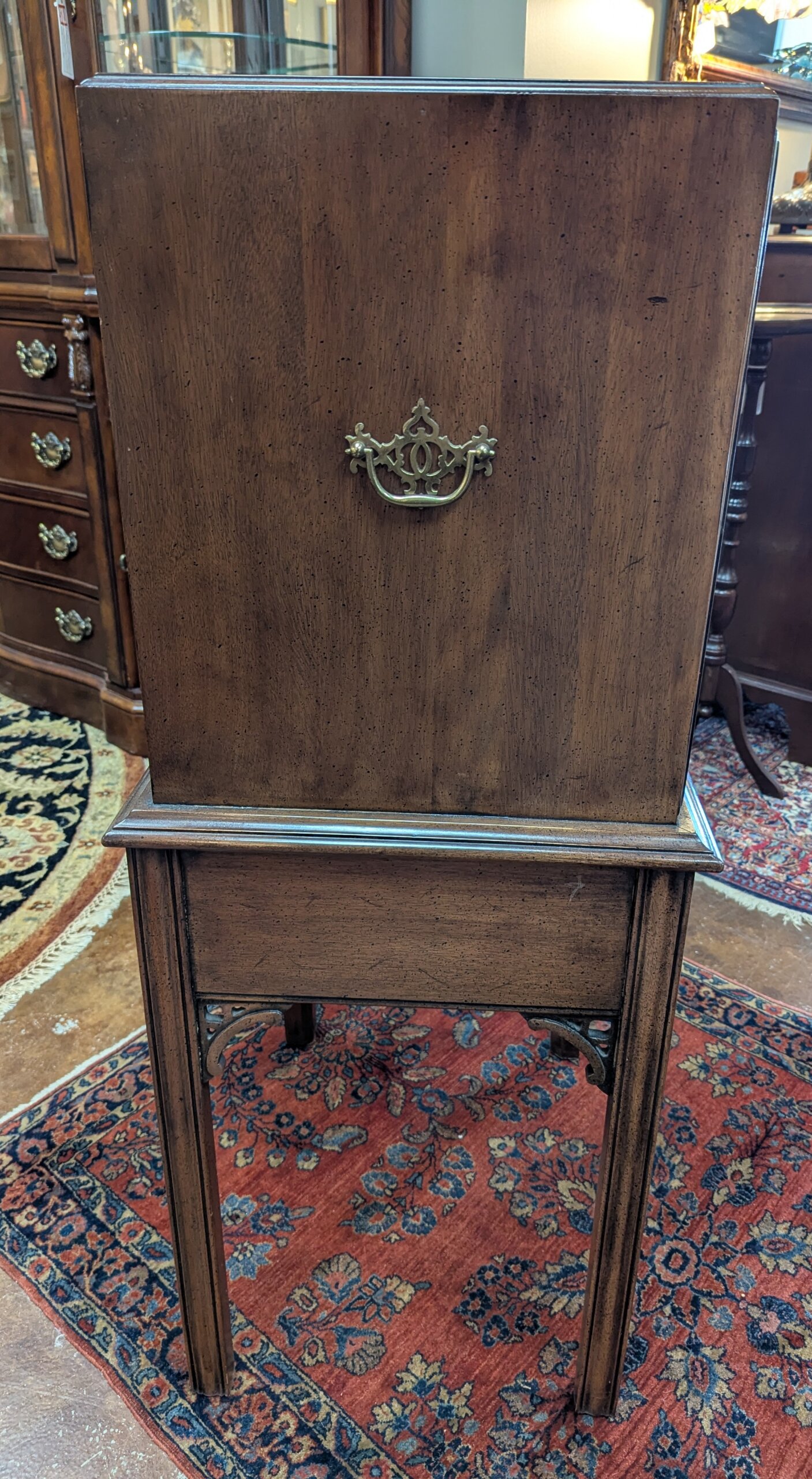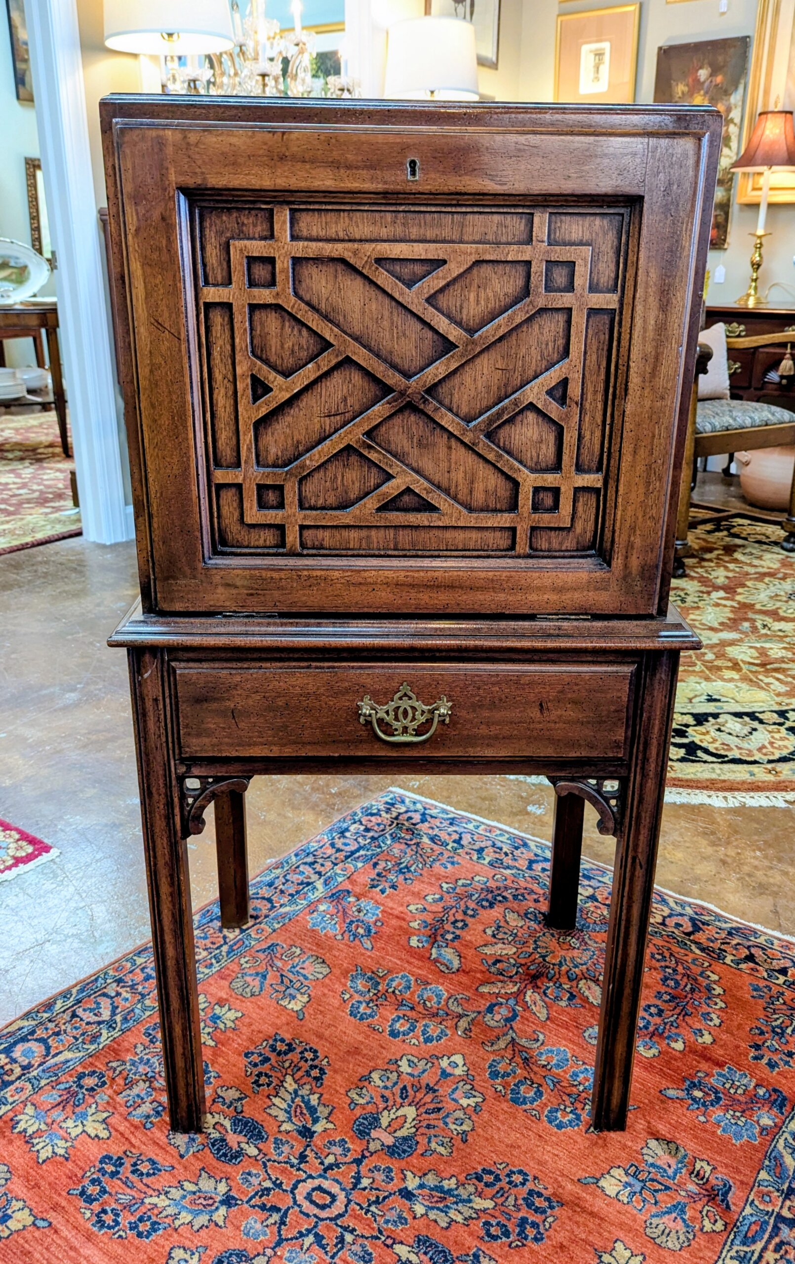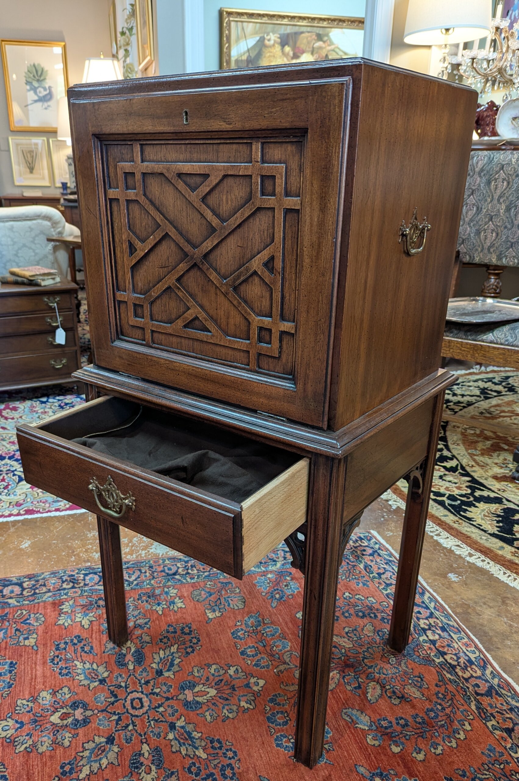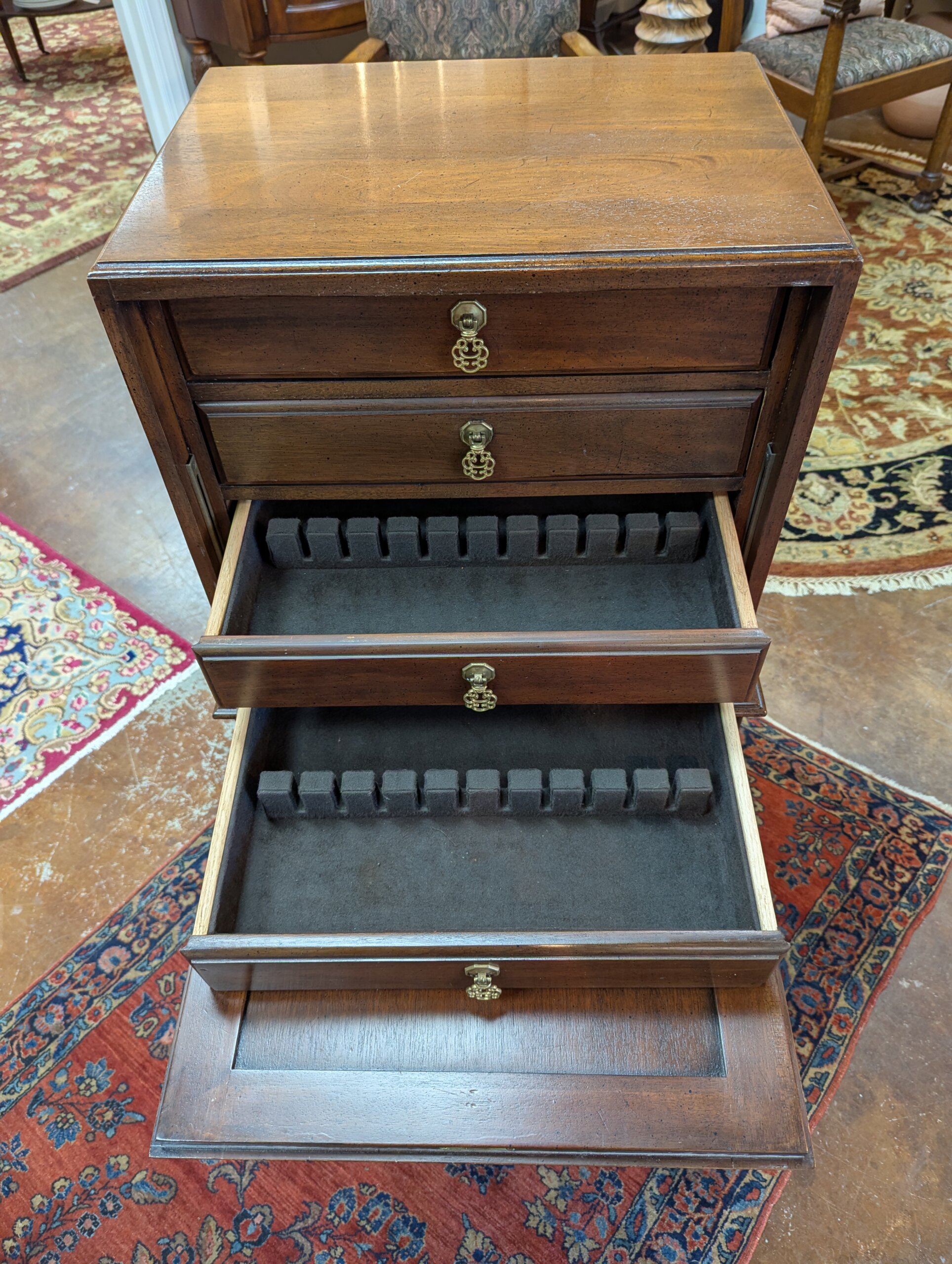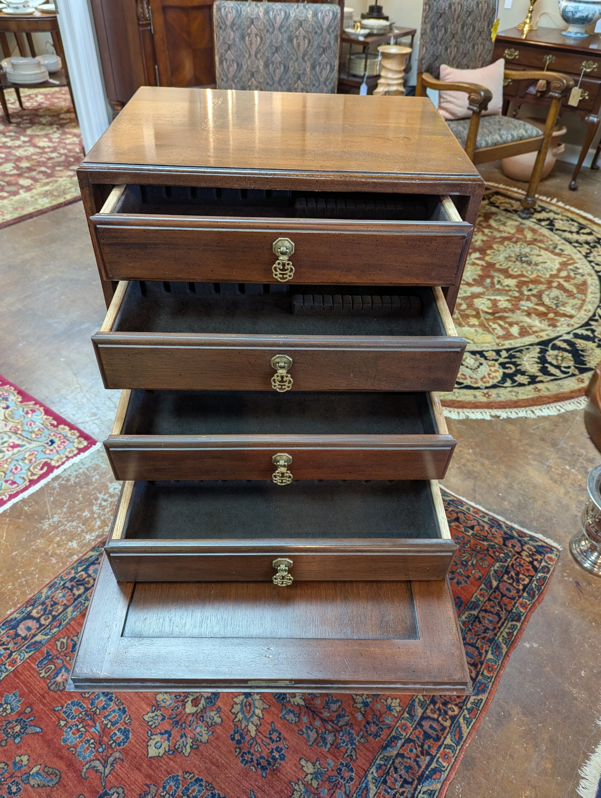 Drop front silver cabinet by Davis Furniture Co, Nashville Tennessee. Fashioned in the Chinese Chippendale style [ circa 1980] . The chest has four drawers all scored for flatware and lined with tarnish resistant cloth. The bottom fifth drawer is for larger serving pieces. The chest is finished in a warm toned walnut with solid brass hardware..