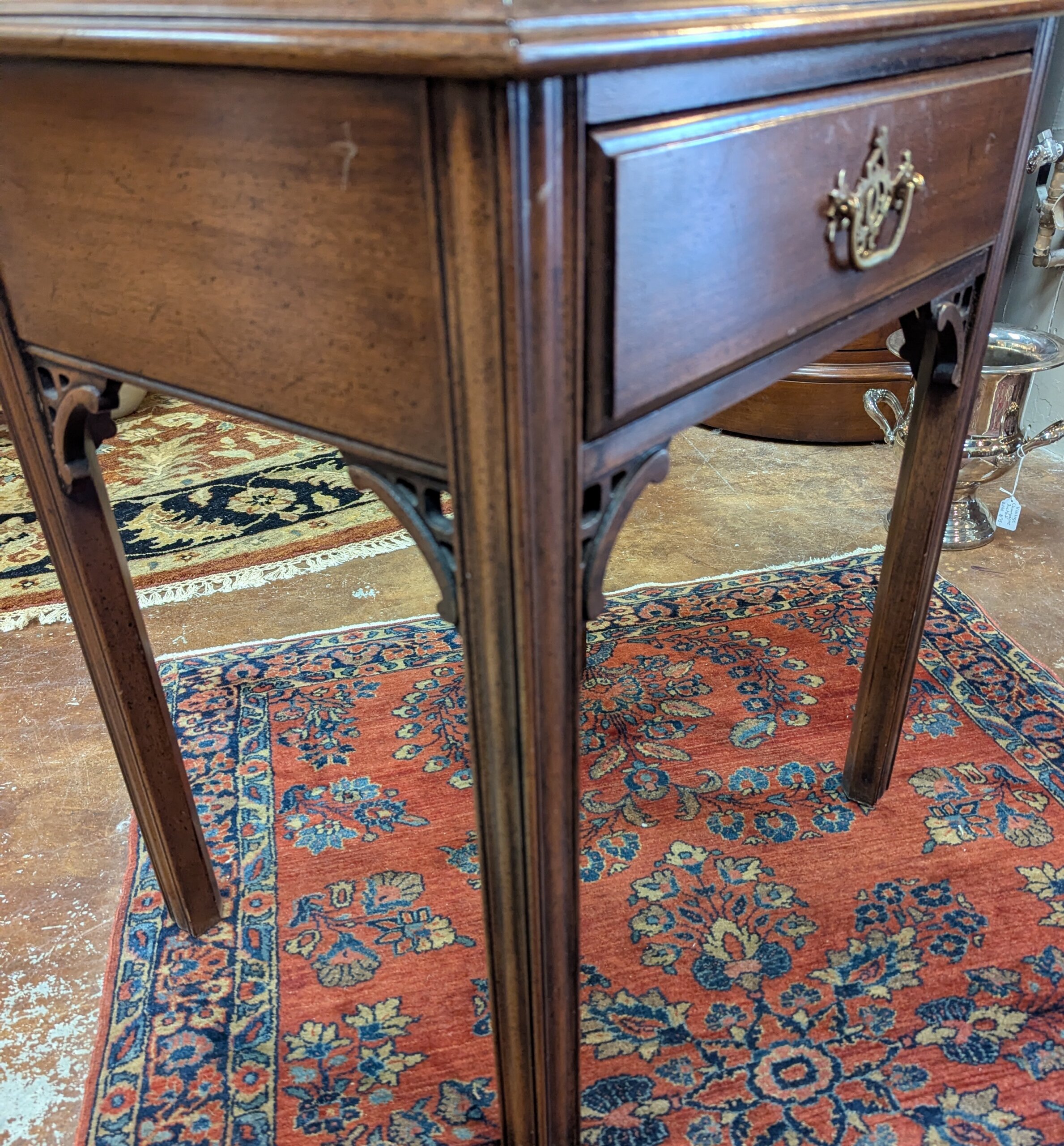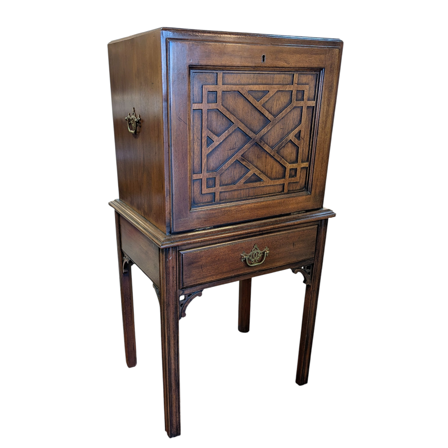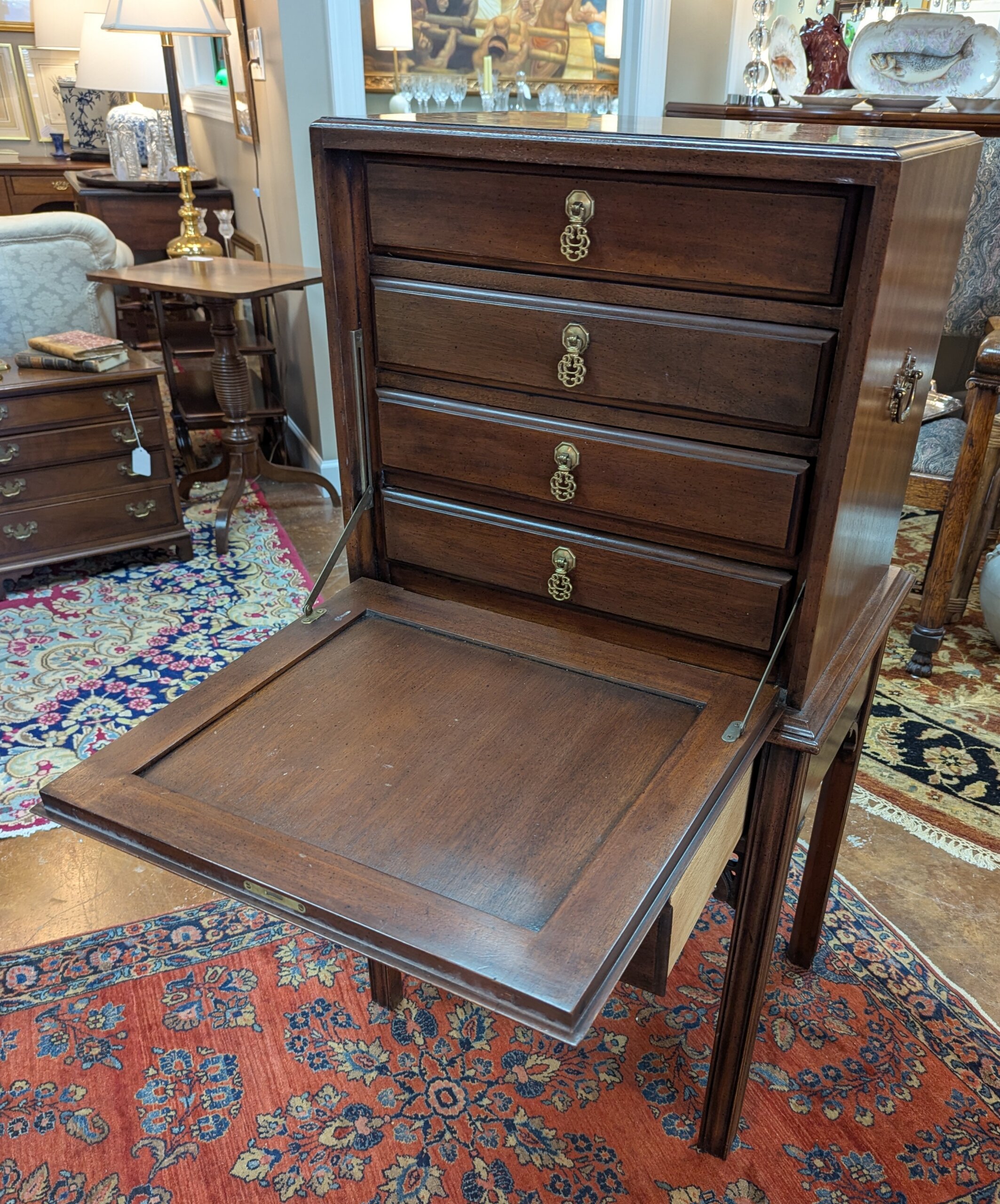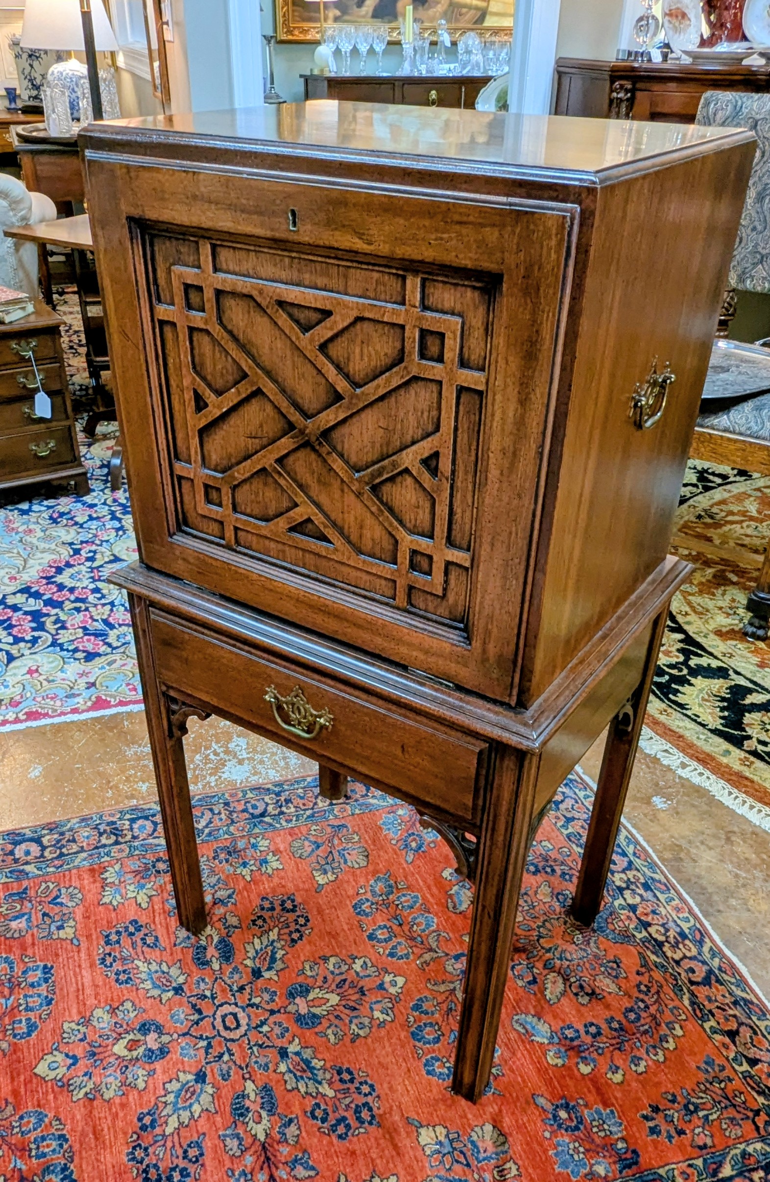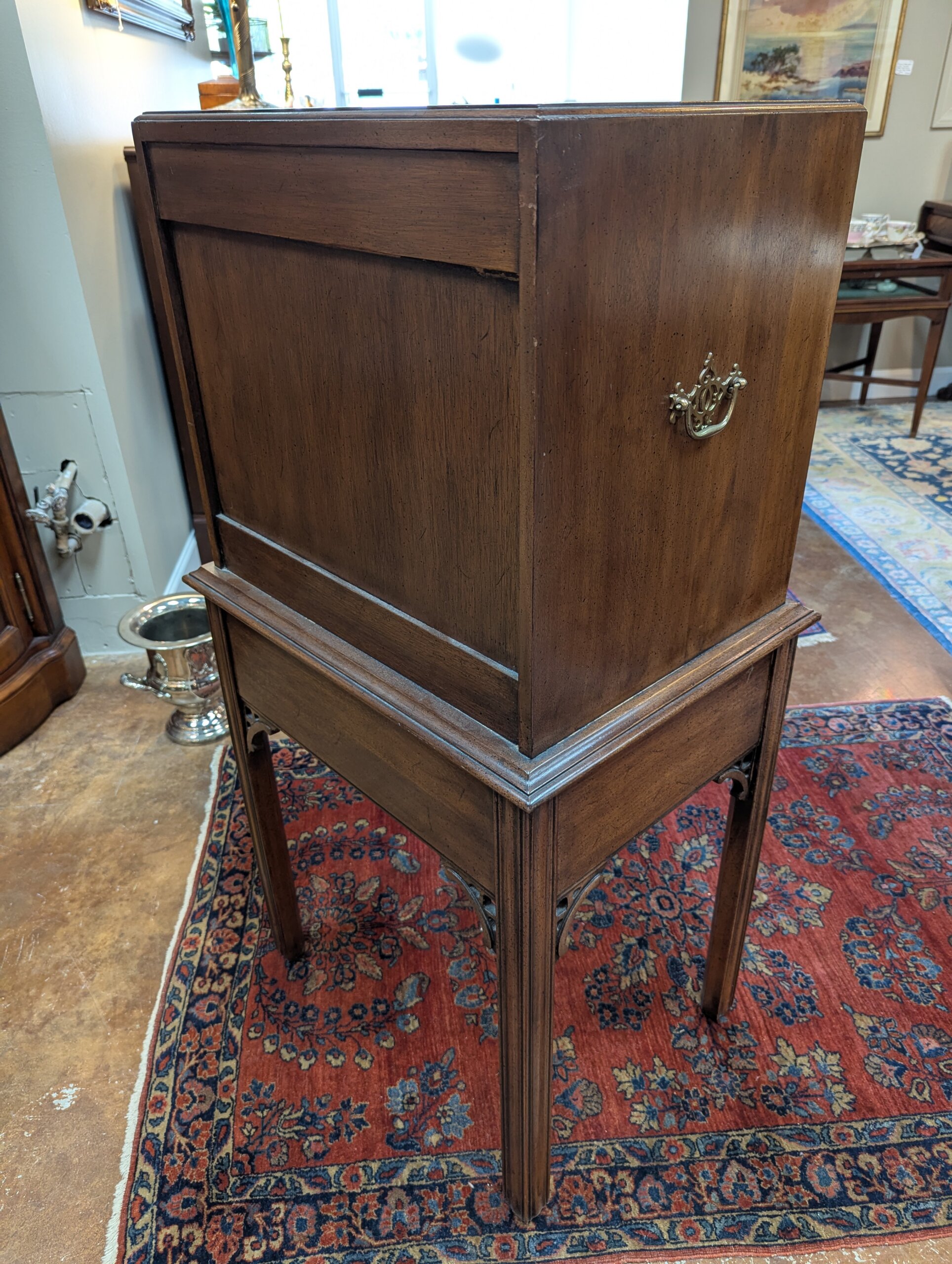 Drop front silver cabinet by Davis Furniture Co, Nashville Tennessee. Fashioned in the Chinese Chippendale style [ circa 1980] . The chest has four drawers all scored for flatware and lined with tarnish resistant cloth. The bottom fifth drawer is for larger serving pieces. The chest is finished in a warm toned walnut with solid brass hardware..