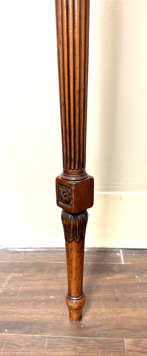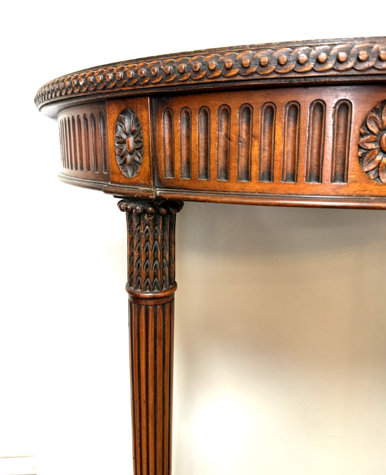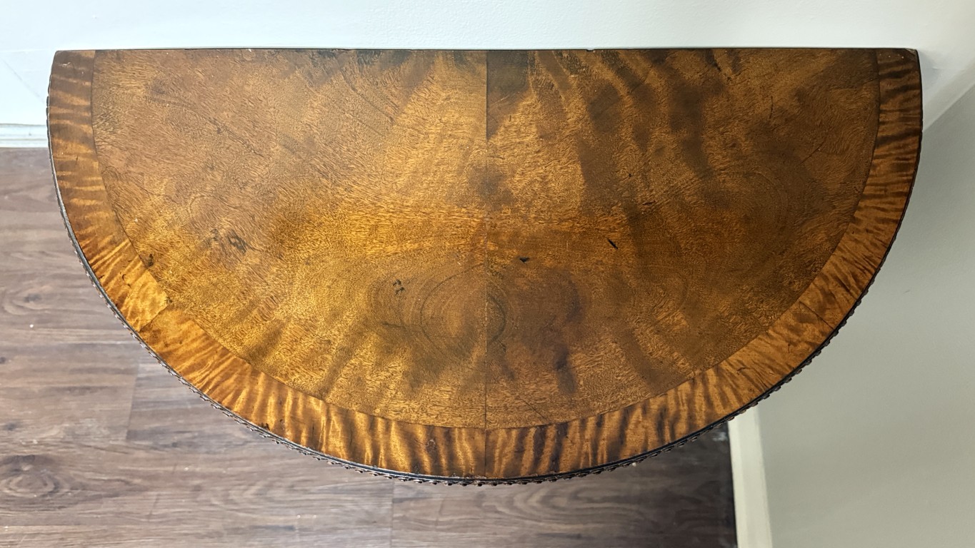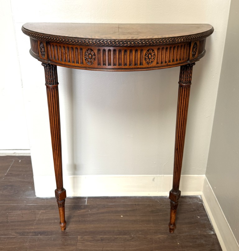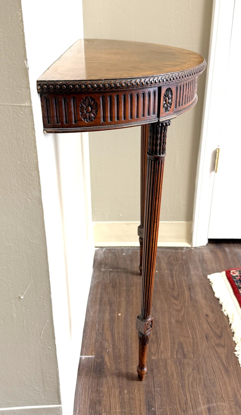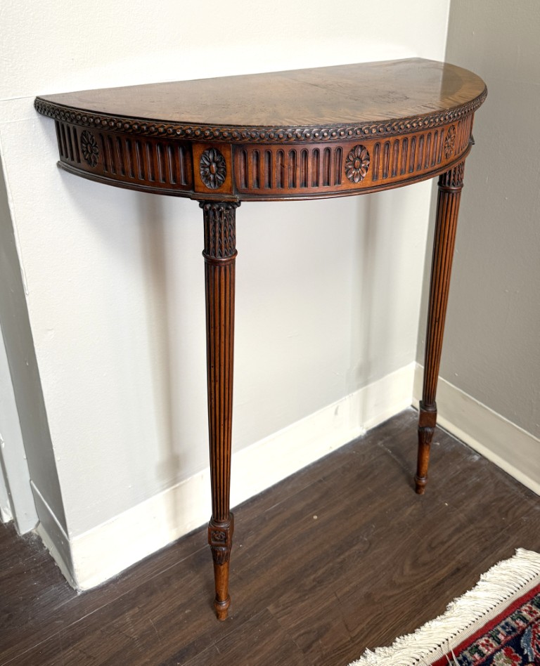 This Chippendale-style mahogany demilune wall table features a richly figured top, fluted apron with carved rosettes, and elegant tapering legs for a classic traditional look. Designed with two front legs and a flat back, it is meant to be secured to the wall for proper support and stability.