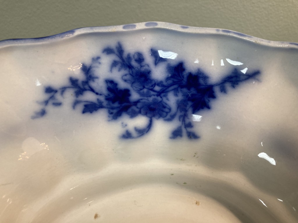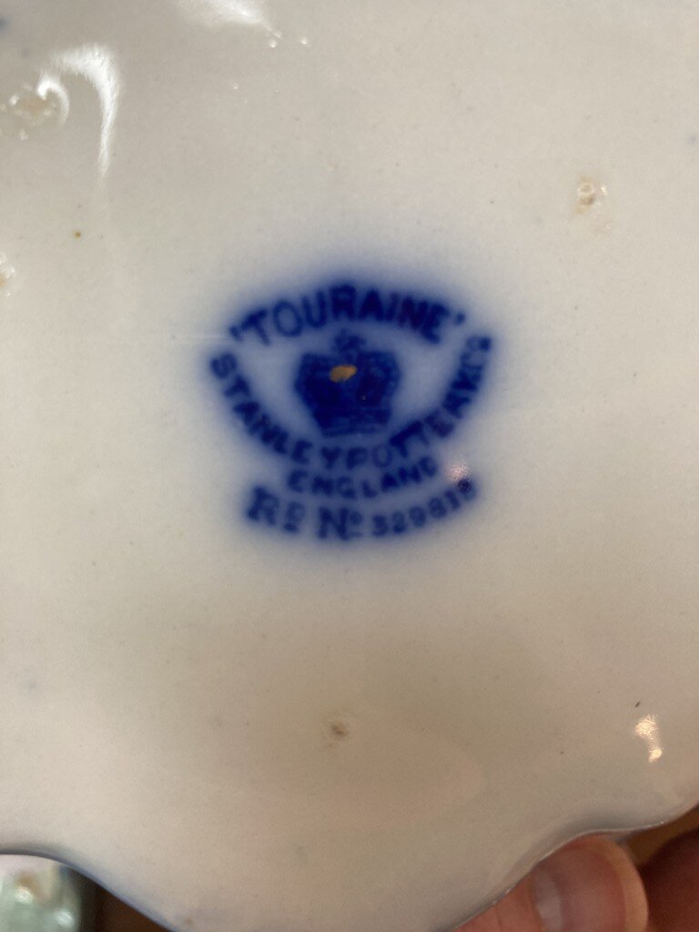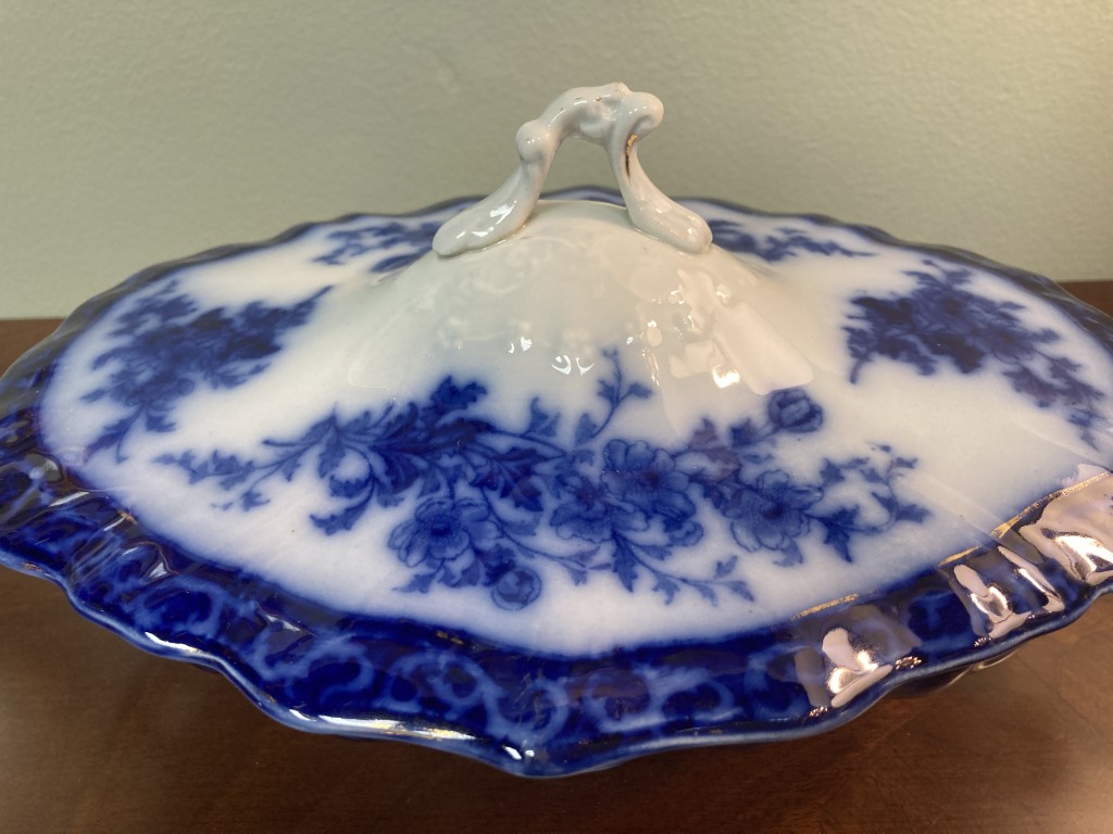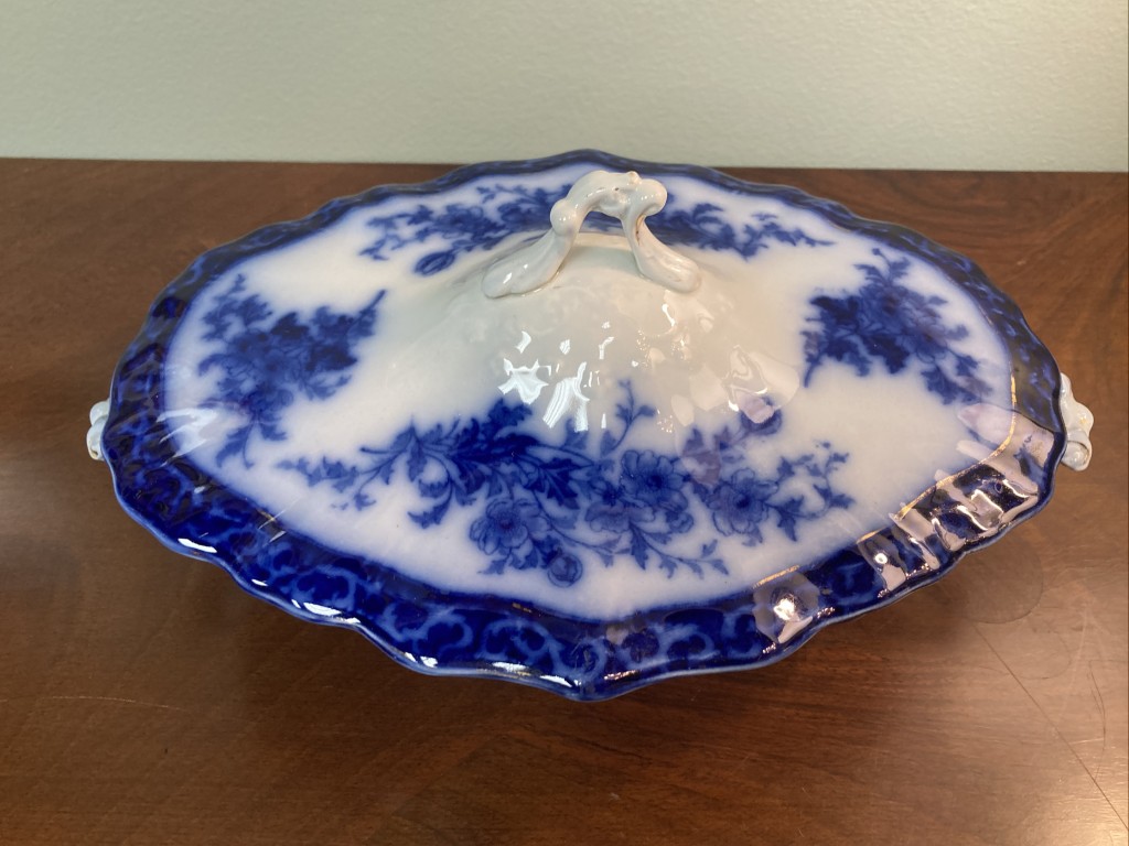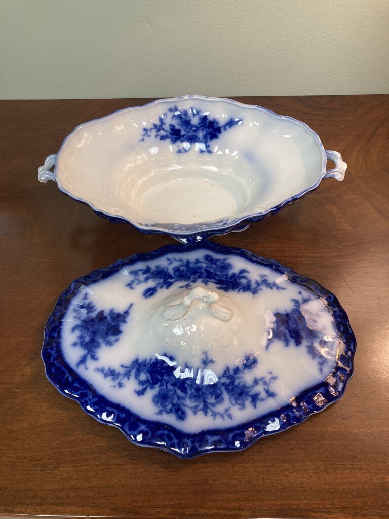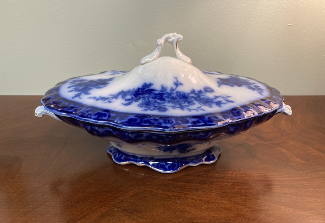 Antique flow blue oblong covered vegetable dish by Stanley Potteries, England, in the ‘Touraine’ pattern. Circa 1898, with side handles. This is a lovely piece of flow blue.