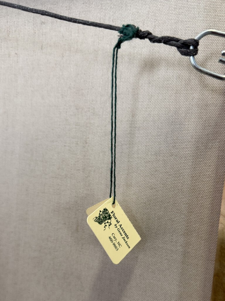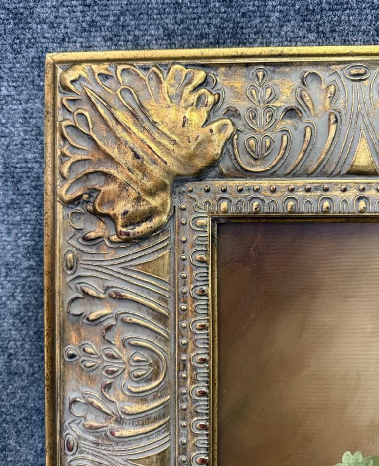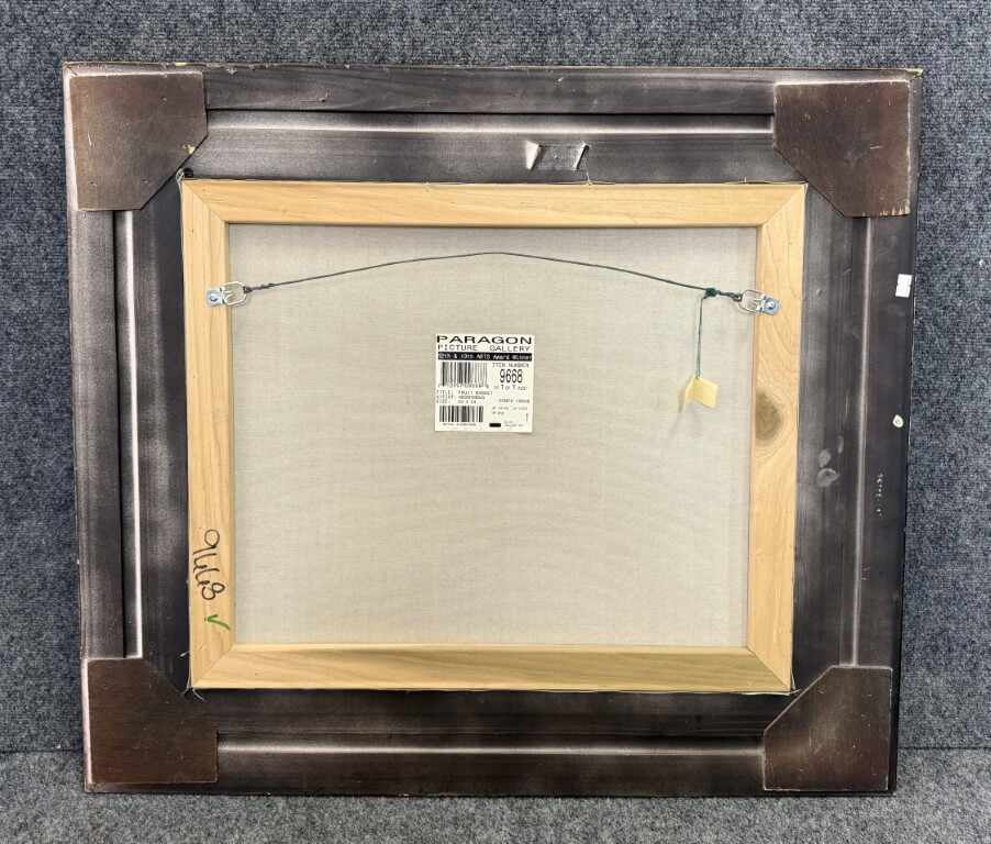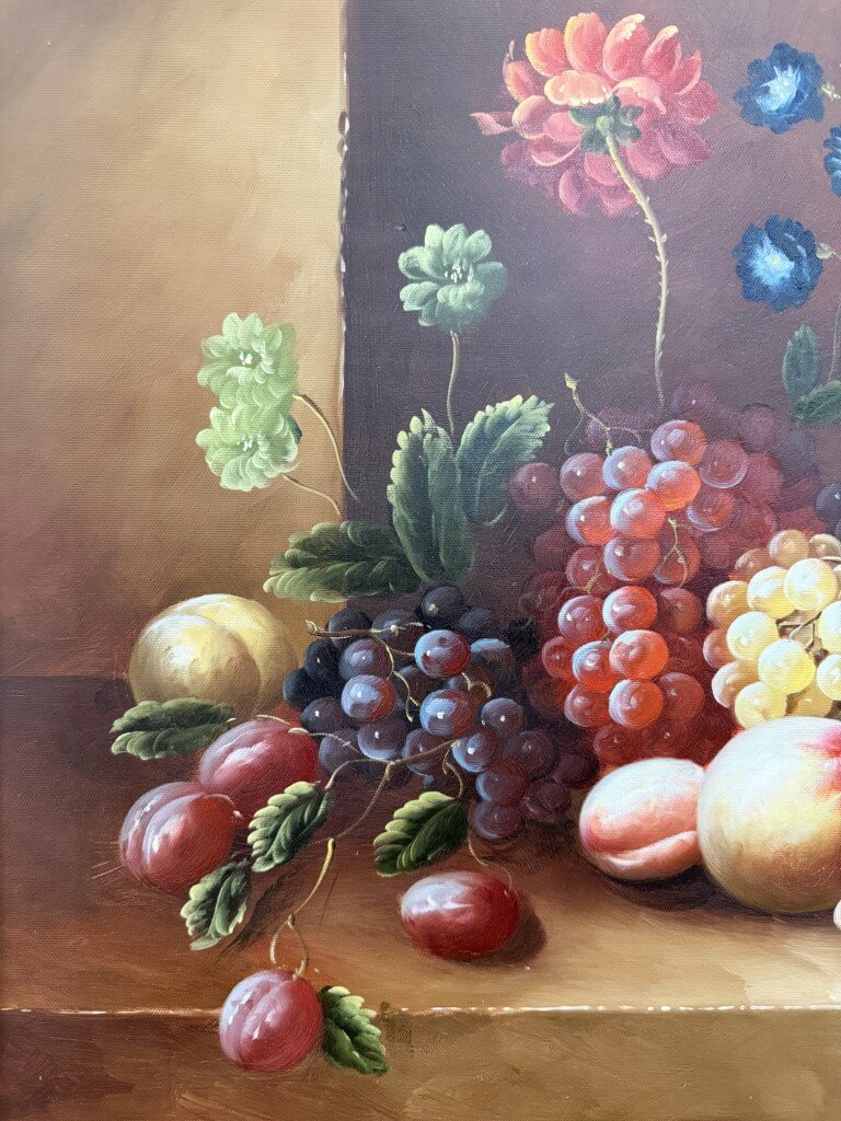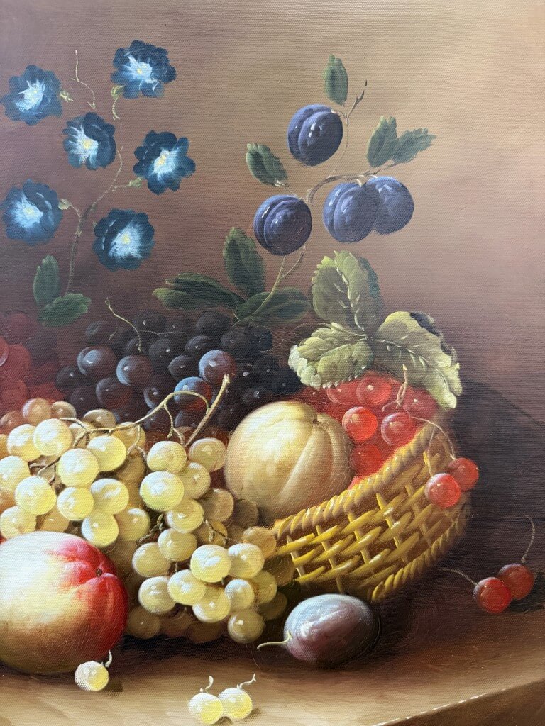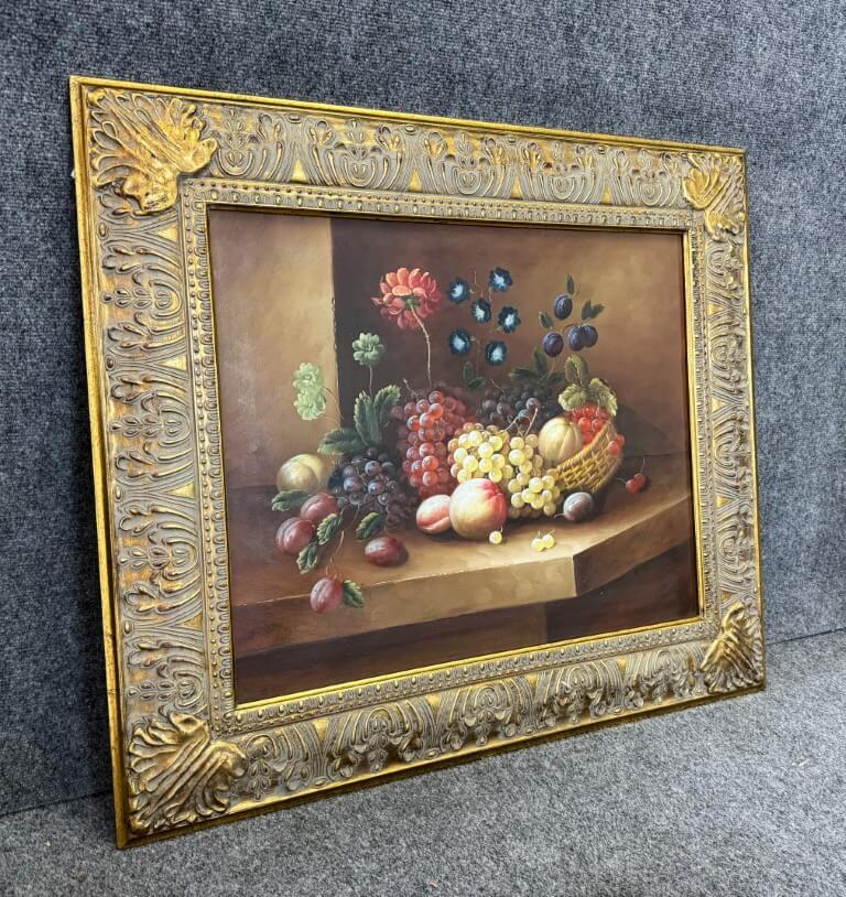 This classical oil on canvas presents a richly detailed still life of a fruit basket, with vibrant grapes, peaches, and blossoms arranged in a warm, softly lit composition reminiscent of traditional European painting. A tag on the back indicates it was previously sold at a shop in Cary with an original price of $440, adding a touch of local provenance to this timeless piece.