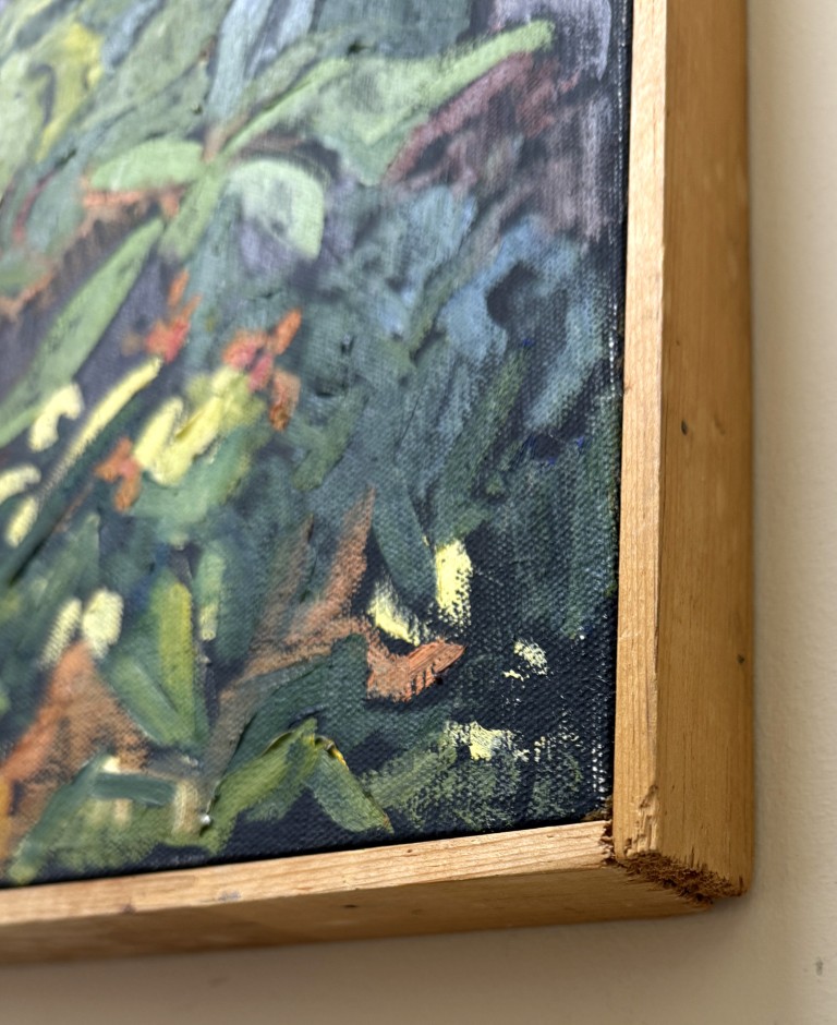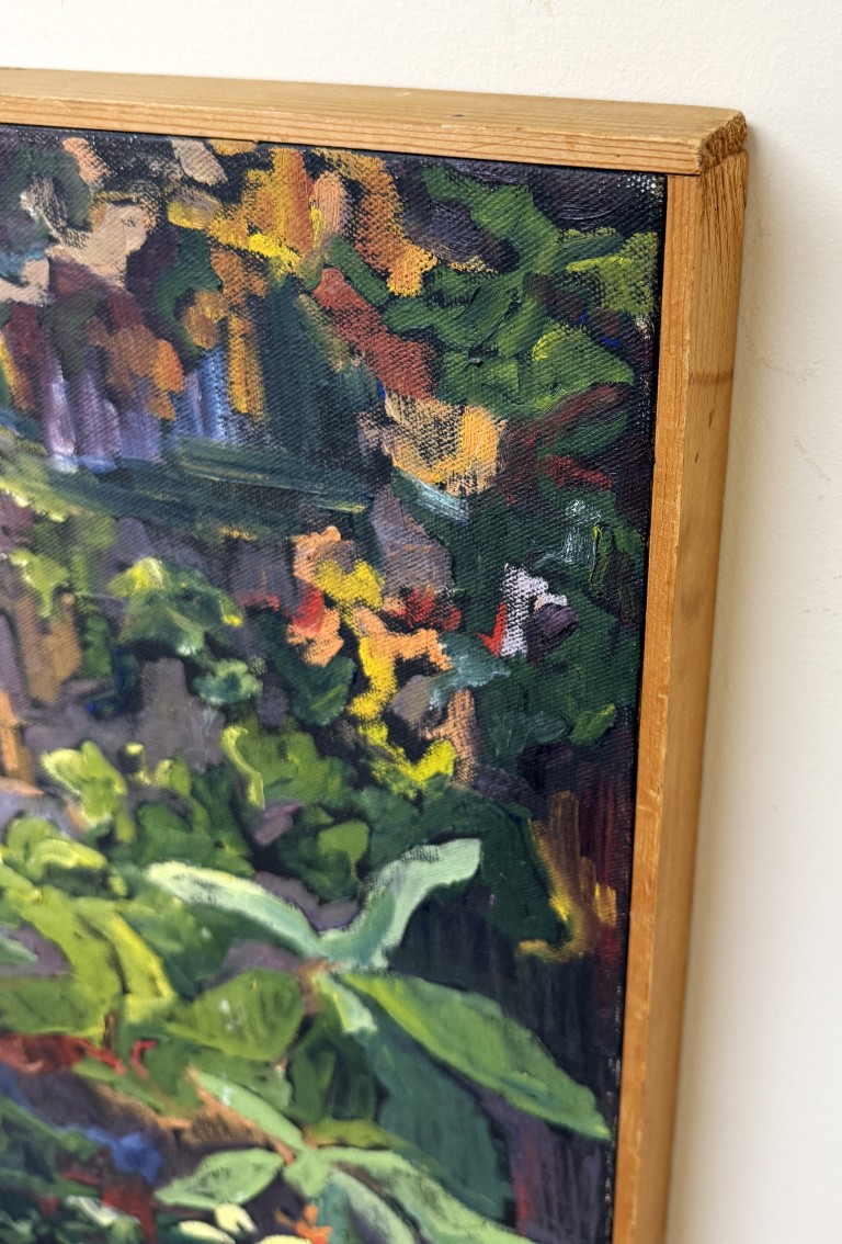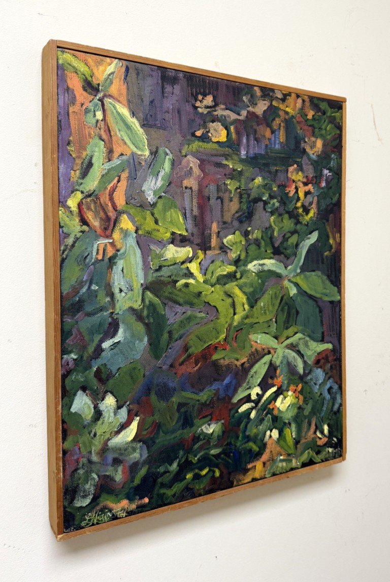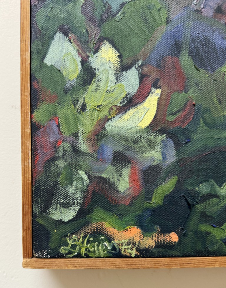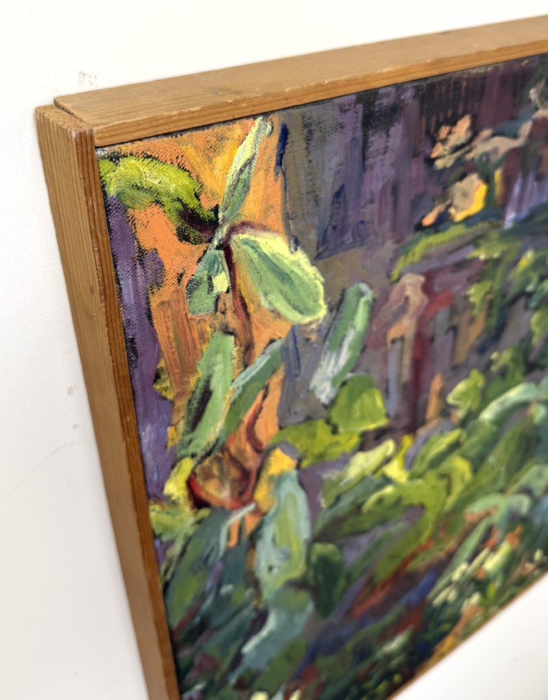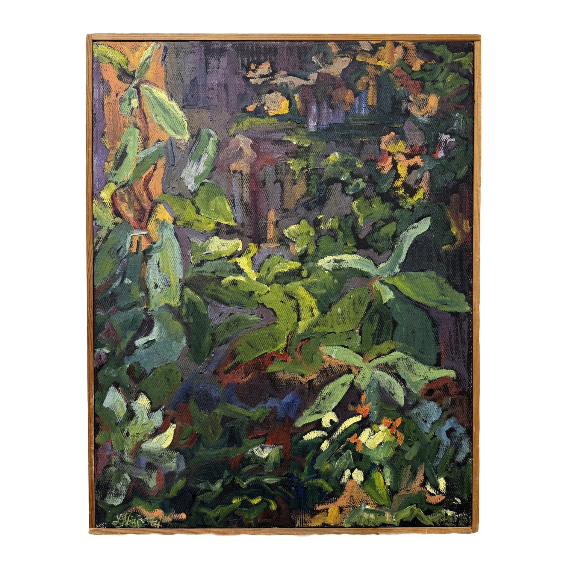 This colorful abstract floral oil on canvas bursts with bold strokes of green, purple, and orange, creating a lively impression of foliage in bloom. The artist’s expressive brushwork and layered textures capture the energy and vibrancy of a flourishing garden. Signed in the lower corner, the piece combines abstraction with natural inspiration, offering both movement and depth.