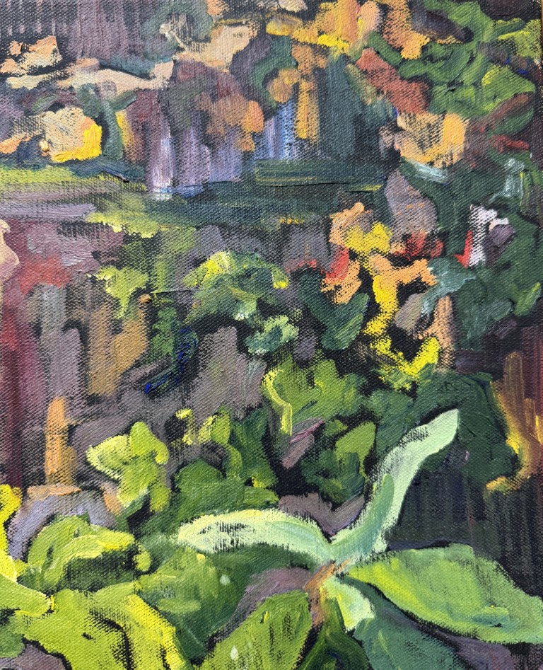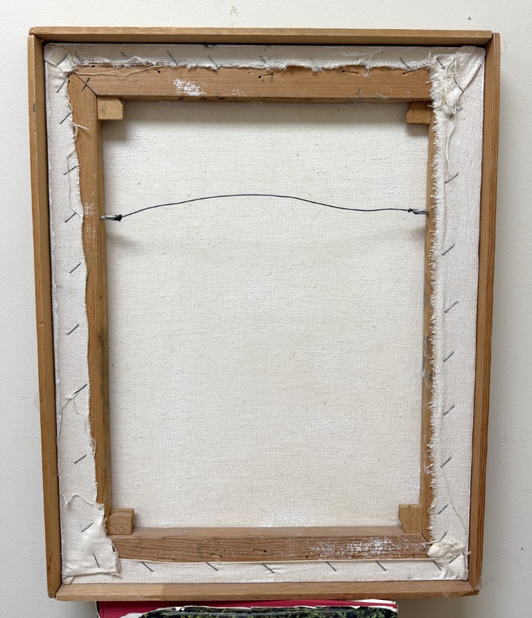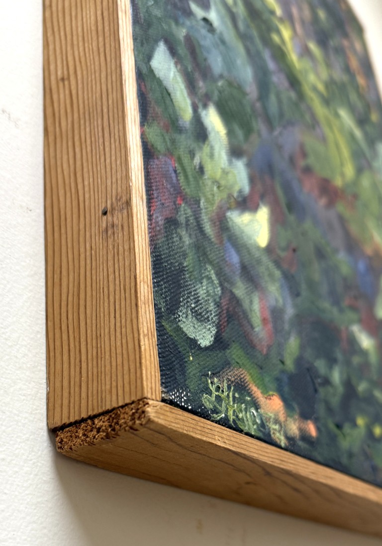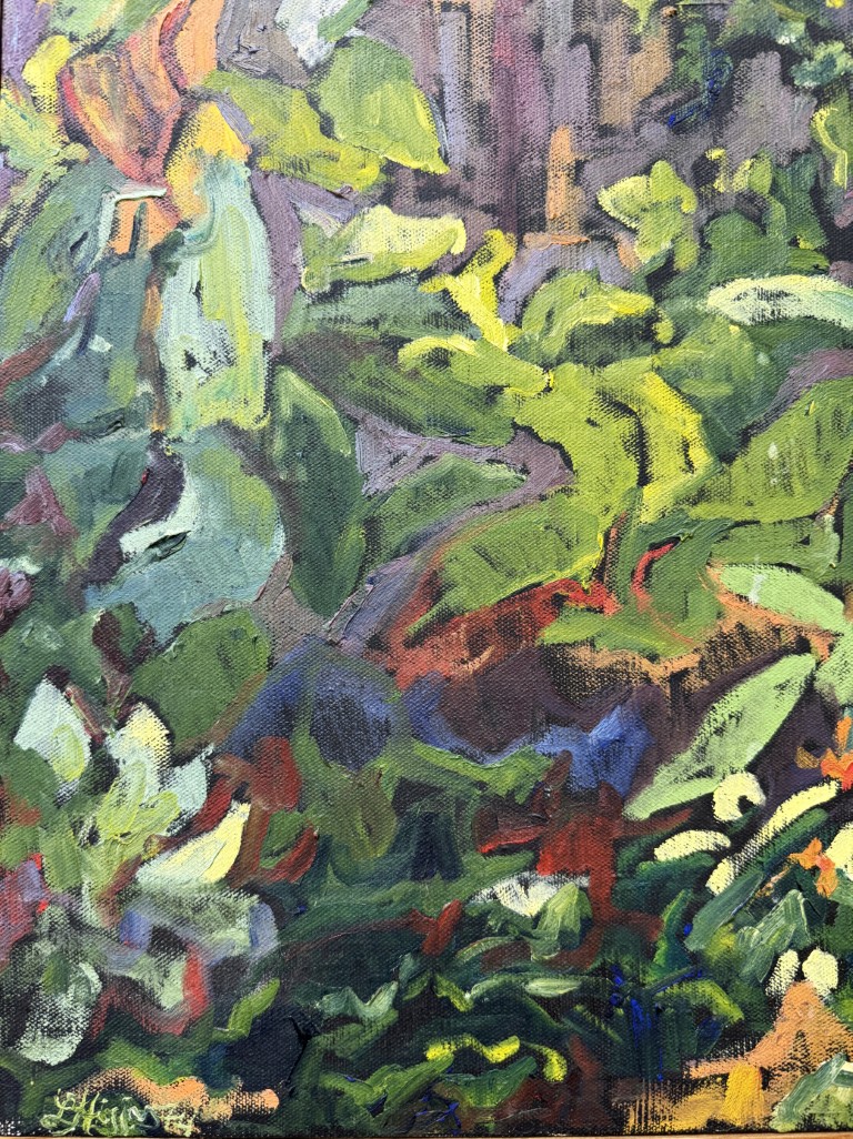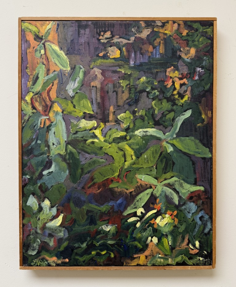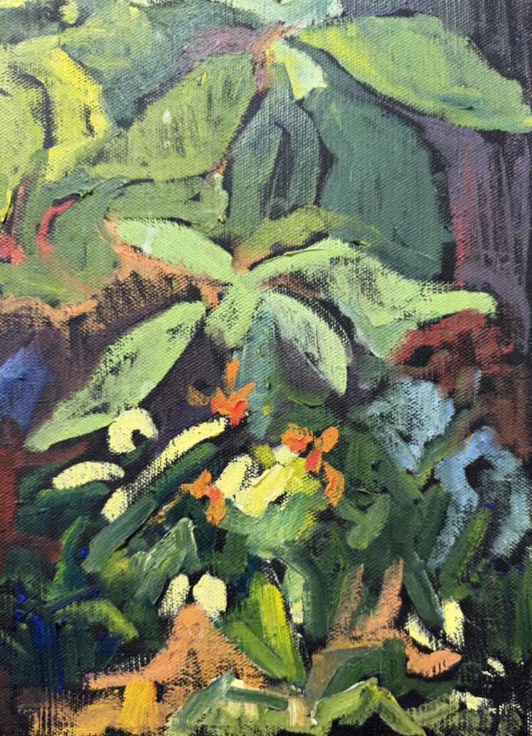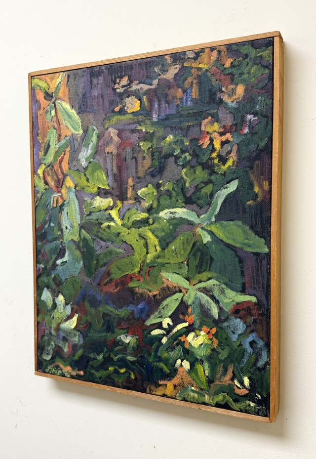 This colorful abstract floral oil on canvas bursts with bold strokes of green, purple, and orange, creating a lively impression of foliage in bloom. The artist’s expressive brushwork and layered textures capture the energy and vibrancy of a flourishing garden. Signed in the lower corner, the piece combines abstraction with natural inspiration, offering both movement and depth.